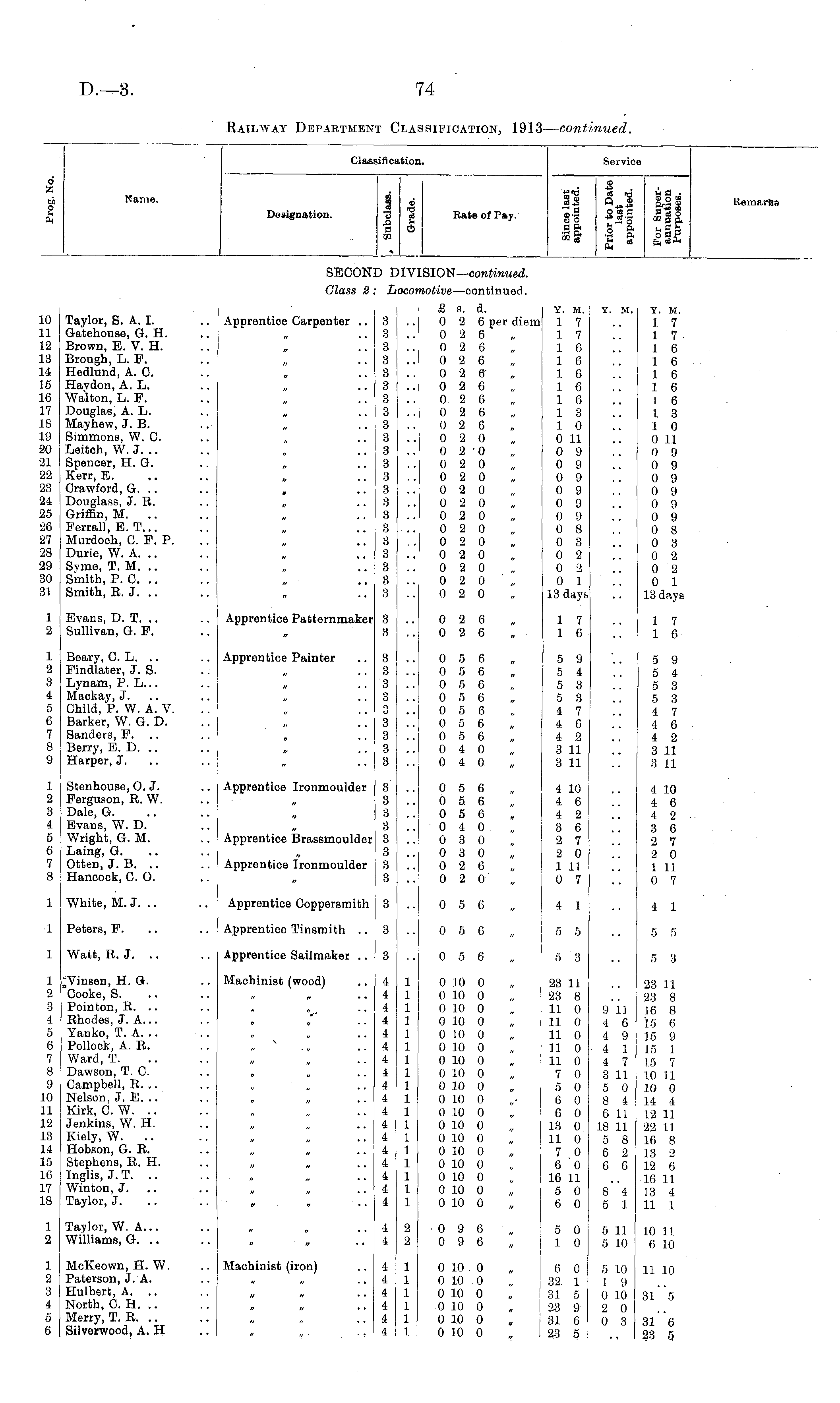 Clasi lification. Service d A t h H4 Name. Designation. ec co ed "o ft 3 Ol © 73 ed 34 4 Rate of Pay. 11 Ij 1.2 8 -a o|| stJS Remarks secon: )iv: — continued. Glass 2 . lOCOl lotive —continued. 0 1 12 .3 4 5 6 L7 .8 .9 !0 il !2 33 14 US 3G !7 38 39 10 11 Taylor, S. A. I. Gatehouse, G. H. Brown, E. V. H. Brough, L. F. Hedlund, A. C. Havdon, A. L. Walton, L. F. Douglas, A. L. Mayhew, J. B. Simmons, W. 0. Leitoh, W. J. .. Spencer, H. G. Kerr, E. Crawford, G. .. Douglass, J. R. Griffin, M. .. Ferrall, E. T... Murdoch, 0. F. P. Durie, W. A. .. Svme, T. M. .. Smith, P. 0. .. Smith, R. J. Apprentice Carpenter .. 3 3 3 3 3 8 3 3 8 3 3 3 3 3 3 3 3 3 3 8 3 3 £ s. d. 0 2 6 per diem 0 2 6 0 2 6 0 2 6 0 2 6' 0 2 6 0 2 6 0 2 6 0 2 6 0 2 0 0 2-0 0 2 0 0 2 0 0 2 0 0 2 0 0 2 0 0 2 0 0 2 0 0 2 0 0 2 0 0 2 0 0 2 0 Y. SI. 1 7 1 7 1 6 1 6 1 6 1 6 1 6 1 3 1 0 0 11 0 9 0 9 0 9 0 9 0 9 0 9 0 8 0 3 0 2 0 2 0 1 13 days Y. M. Y. SI. 1 7 1 7 1 6 1 6 1 6 1 6 l 6 1 8 1 0 0 11 0 9 0 9 0 9 0 9 0 9 0 9 0 8 0 3 0 2 0 2 0 1 13 days 1 2 Evans, D. T. Sullivan, G. F. Apprentice Patternmaker 3 0 2 6 0 2 6 1 7 1 6 1 7 1 6 1 2 3 4 5 0 7 8 9 Beary, O. L. Findlater, J. S. Lynam, P. L... Mackay, J. Child, P. W. A. V. Barker, W. G. D. Sanders, F. Berry, E. D. .. Harper, J. Apprentice Painter 3 3 3 3 ■-> ■J 3 3 3 3 0 5 6 0 5 6 0 5 6 0 5 6 0 5 6 0 5 6 0 5 6 0 4 0 0 4 0 5 9 5 4 5 3 5 8 4 7 4 6 4 2 3 11 3 11 5 9 5 4 5 3 5 3 4 7 4 6 4 2 3 11 3 11 1 2 3 4 5 6 7 8 Stenhouse, O. J. Ferguson, R. W. Dale, G. Evans, W. D. Wright, G. M. Laing, G. Otten, J. B. .. Hancock, 0. O. Apprentice Ironmoulder ./ Apprentice Brassmoulder 3 3 3 8 3 3 3 3 0 5 6 0 5 6 0 5 6 0 4 0 0 3 0 0 3 0 0 2 6 0 2 0 4 10 4 6 4 2 3 6 2 7 2 0 1 11 0 7 4 10 4 6 4 2 3 6 2 7 2 0 1 11 0 7 Apprentice Ironmoulder 1 White, M.J. .. Apprentice Coppersmith 8 0 5 6 4 1 4 1 1 Peters, F. Apprentice Tinsmith .. 3 0 5 6 5 5 5 5 1 Watt, R. J. .. Apprentice Sailmaker .. 3 0 5 6 5 3 5 3 1 2 3 4 5 6 7 8 9 10 11 12 13 14 15 16 17 18 Winsen, H. G. Cooke, S. Pointon, R. .. Rhodes, J. A... Yanko, T. A. .. Pollock, A. R. Ward, T. Dawson, T. 0. Campbell, R. .. Nelson, J. E. .. Kirk, C W. Jenkins, W. H. Kiely, W. .. Hobson, G. R. Stephens, R. H. Inglis, J. T. .. Win ton, J. Taylor, J. Machinist (wood) . 4 4 4 4 4 4 4 4 4 4 4 4 4 4 4 4 4 4 1 1 1 1 1 1 1 1 1 1 1 1 1 1 1 1 1 1 0 10 0 0 10 0 0 10 0 0 10 0 0 10 0 0 10 0 0 10 0 0 10 0 0 10 0 0 10 0 0 10 0 0 10 0 0 10 0 0 10 0 0 10 0 0 10 0 0 10 0 0 10 0 23 11 23 8 11 0 11 0 11 0 11 0 11 0 7 0 5 0 6 0 6 0 13 0 11 0 7 0 6 0 16 11 5 0 6 0 9 11 4 6 4 9 4 1 4 7 3 11 5 0 8 4 6 11 18 11 5 8 6 2 6 6 23 11 23 8 16 8 15 6 15 9 15 1 15 7 10 11 10 0 14 4 12 11 22 11 16 8 13 2 12 6 16 11 13 4 11 1 8"4 5 1 1 2 Taylor, W. A... Williams, G. .. 4 4 2 2 0 9 6 0 9 6 5 0 1 0 5 11 5 10 10 11 6 10 1 2 3 4 5 6 McKeown, H. W. Paterson, J. A. Hulbert, A. .. North, G. H. Merry, T. R. Silverwood, A, H Machinist (iron) 4 4 4 4 4 4 1 1 1 1 1 1 0 10 0 0 10 0 0 10 0 0 10 0 0 10 0 0 10 0 6 0 32. 1 31 5 23 9 31 6 23 5 5 10 1 9 0 10 2 0 0 3 11 10 31 5 31 G 23 5