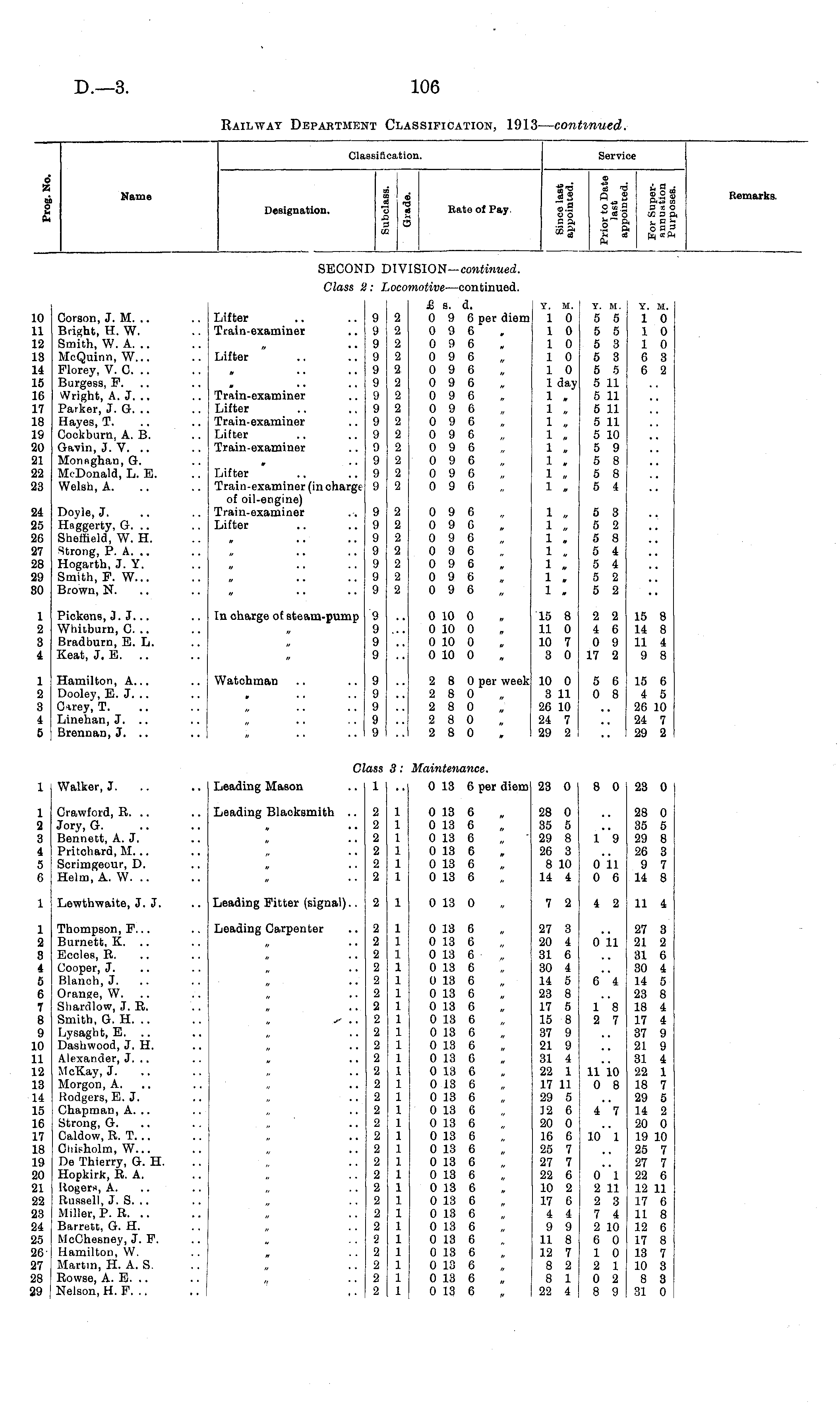 Classification, Service 6 •A I Name Designation. cj ti ■g <3 Ol to id 73 34 O , ed 2 Q 2 S 2 © © .5 o Io a 3 x o ©o ** d o Ol g Ot a a k~ a t oj S a .2 ft Sao m cd 3, cd ft cc ft ft w Remarks. Rate of Pay SECON D DIVISION— continued. )IV Class k 1: Locomotive —continued. :0C0' 10 11 12 13 14 15 16 17 18 19 20 21 22 23 Corson, J. M. .. Bright, H. W. Smith, W. A. .. McQuinn, W... Florey, V. O. Burgess, F. Wright, A. J. .. Parker, J. G. .. Hayes, T. Cockburn, A. B. Gavin, J. V. Monnghan, G. McDonald, L. E. Welsh, A. Lifter Train-examiner Lifter Train-examiner Lifter Train-examiner Lifter Train-examiner £ s. d. 9 2 0 9 6 per diem 9 2 0 9 6 9 2 0 9 6 9 2 0 9 6 9 2 0 9 6 9 2 0 9 6 9 2 0 9 6 9 2 0 9 6 9 2 0 9 6 9 2 0 9 6 9 2 0 9 6 9 2 0 9 6 9 2 0 9 6 9 2 0 9 6 2 2 2 2 2 2 2 2 2 2 2 2 2 2 Y. M. 1 0 1 0 1 0 1 0 1 0 1 day 1 . 1 „ 1 . 1 . 1 . 1 . 1 , 1 . Y. SI. 5 5 5 5 5 3 5 3 5 5 5 11 5 11 5 11 5 11 5 10 5 9 5 8 5 8 5 4 Y. St. 1 0 1 0 1 0 6 3 6 2 24 25 26 27 28 29 30 Doyle, J. Haggerty, G. .. Sheffield, W. H. Strong, P. A. Hogarth, J. Y. Smith, F. W... Brown, N. Lifter Train-examiner (in charge of oil-engine) Train-examiner Lifter 9 2 0 9 6 9 2 0 9 0 9 2 0 9 6 9 2 0 9 6 9 2 0 9 6 9 2 0 9 6 9 2 0 9 6 2 2 2 2 2 2 2 1 „ 1 „ 1 . 1 „ 1 . 1 . 1 . 5 3 5 2 5 8 5 4 5 4 5 2 5 2 1 2 3 4 Pickens, J.J... Whitburn, O. .. Bradburn, E. L. Keat, J. E. In charge of steam-pump 9 .. 0 10 0 9 ... 0 10 0 9 .. 0 10 0 9 .. 0 10 0 15 8 11 0 10 7 3 0 2 2 4 6 0 9 17 2 15 8 14 8 11 4 9 8 1 2 3 4 5 Hamilton, A... Dooley, E. J. .. 0«ey, T. Linehan, J. .. Brennan, J. .. Watchman 9 .. 2 8 0 per week 9 .. 2 8 0 9 .. 2 8 0 9 .. 2 8 0 9 .. 2 8 0 10 0 3 11 26 10 24 7 29 2 5 6 0 8 15 6 4 5 26 10 24 7 29 2 Walker, J. CI lass 3: Maintenance. 23 0 8 0 23 0 1 Leading Mason 1 .. 0 13 6 per diem 1 2 3 4 5 6 Crawford, R. .. Jory, G. Bennett, A. J. Pritchard, M... Scrimgeour, D. Helm, A. W. .. Leading Blacksmith .. 2 1 0 13 6 2 1 0 13 6 2 1 0 13 6 „ ' 2 1 0 13 6 2 1 0 13 6 2 1 0 13 6 28 0 35 5 29 8 26 3 8 10 14 4 1*9 28 0 35 5 29 8 26 3 9 7 14 8 oil 0 6 1 Lewthwaite, J. J. Leading Fitter (signal).. 2 1 0 13 0 7 2 4 2 11 4 1 2 3 4 5 6 7 8 9 10 11 12 13 14 15 16 17 18 19 20 21 22 23 24 25 26 27 28 29 Thompson, F... Burnett, K. .. Eccles, R. Cooper, J. Blanoh, J. Orange, W. Shardlow, J. R. Smith, G. H. .. Lysaght, E. Dasbwood, J. H. Alexander, J. .. McKay, J. Morgon, A. Rodgers, E. J. Chapman, A. .. Strong, G. Caldow, R. T... Cuisholm, W... De Thierry, G. H. Hopkirk, R. A. Rogers, A. Russell, J. S. .. Miller, P. R. Barrett, G. H. McChesney, J. F. Hamilton, W. Martin, H. A. S. Rowse, A. E. Nelson, H. F. .. Leading Carpenter „ s .. 2 1 0 13 6 2 1 0 13 6 2 1 0 13 6 „ 2 1 0 13 6 2 1 0 13 6 2 1 0 13 6 2 1 0 13 6 2 1 0 13 6 2 1 0 13 6 2 1 0 13 6 2 1 0 13 6 2 1 0 13 6 2 1 0 13 6 2 1 0 13 6 2 1 0 13 6 2 1 0 13 6 2 1 0 13 6 2 1 0 13 6 2 1 0 13 6 2 1 0 13 6 2 1 0 13 6 2 1 0 13 6 2 1 0 13 6 2 1 0 13 6 2 1 0 13 6 2 1 0 13 6 2 1 0 13 6 2 1 0 13 6 2 1 0 13 6 27 3 20 4 31 6 30 4 14 5 23 8 17 5 15 8 37 9 21 9 31 4 22 1 17 11 29 5 12 6 20 0 16 6 25 7 27 7 22 6 10 2 17 6 4 4 9 9 11 8 12 7 8 2 8 1 22 4 oil 6 - 4 1 *8 2 7 11 io 0 8 4"7 27 3 21 2 31 6 30 4 14 5 23 8 18 4 17 4 37 9 21 9 31 4 22 1 18 7 29 5 14 2 20 0 19 10 25 7 27 7 22 6 12 11 17 6 11 8 12 6 17 8 13 7 10 3 8 3 31 0 10 "l 0 1 2 11 2 3 7 4 2 10 6 0 1 0 2 1 0 2 8 9
