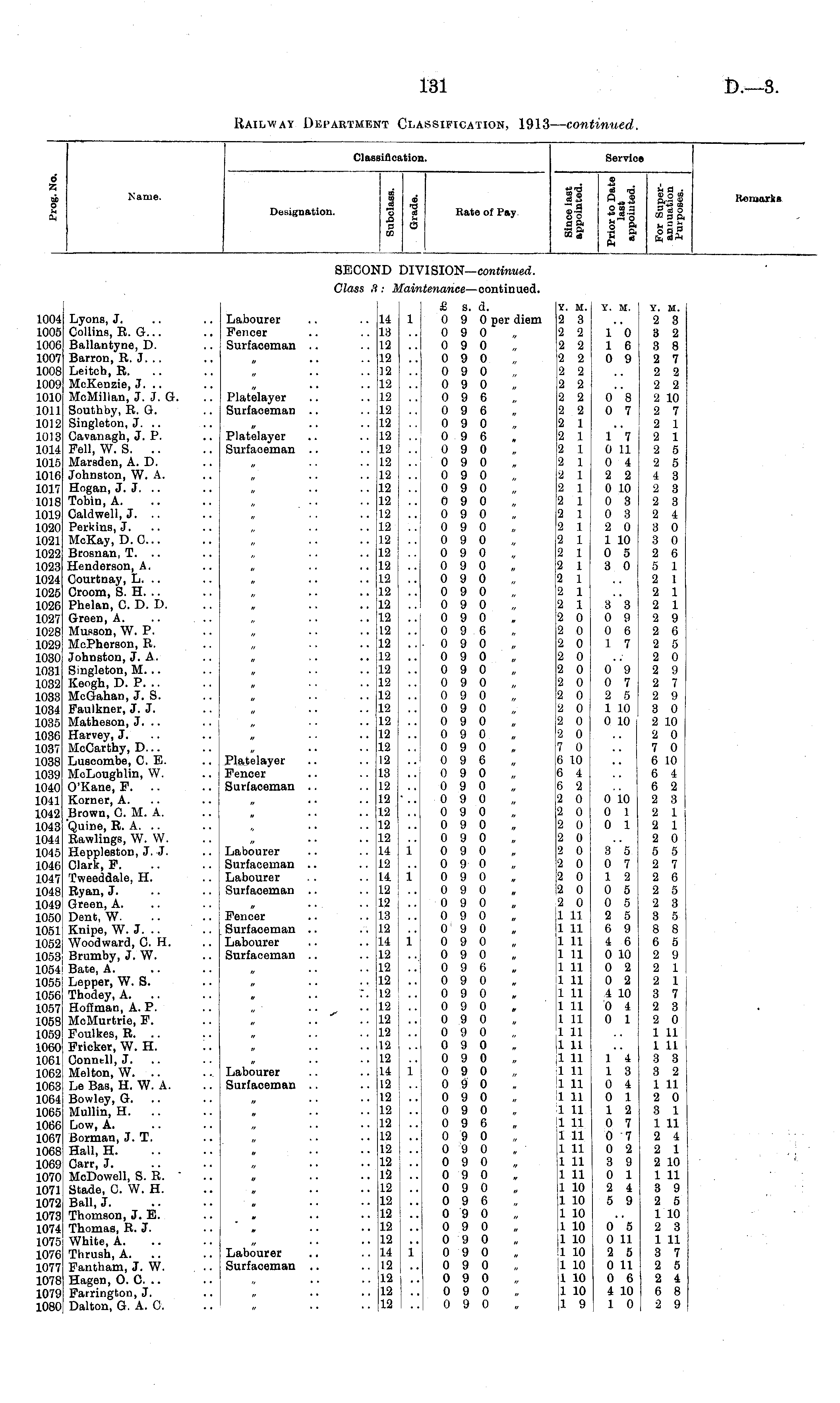 ClasBifici .tion. Service d A CD O 34 ft Name. Designation. CD © £ "o x 3 Ol © ■3 a 3, Rate of Pay I 2 %t3 a .a 22 fi 2 B-a SS-2 •9 § 2 I oo a 'S St ft * H S «; o o <? aa o oi sa o o a ft edft Remarks 8ECOI iD DP ISION— continued. Class '.- r ai; tenance —continued. 1004 1005 1006 1007 1008 1009 1010 1011 1012 1013 1014 1015 1016 1017 1018 1019 1020 1021 1022 1023 1024 1025 1026 1027 1028 1029 1030 1031 1032 1033 1034 1035 1036 1037 1038 1039 1040 1041 1042 1043 1044 1045 1046 1047 1048 1049 1050 1051 1052 1058; 1054' 1055 1056i 1057 1058 1059 1060 1061 1062 1063 1064 1065 1066 1067 1068 1069 1070 1071 1072 1073! 1074 1075 1076 1077 1078 1079 1080 Lyons, J. Collins, R. G... Ballantyne, D. Barron, R. J. .. Leitch, R. McKenzie, J. .. McMillan, J. J. G. Southby, R. G, Singleton, J. .. Cavanagh, J, P. Fell, W. S. Marsden, A. D. Johnston, W. A. Hogan, J. J. Tobin, A. Caldwell, J. .. Perkins, J. McKay, D. C... Brosnan, T. .. Henderson, A. Courtnay, L. .. Croom, S. H. .. Phelan, C D. D. Green, A. Musson, W. P. McPherson, R. Johnston, J. A. Singleton, M. .. Keogh, D. P. .. McGahan, J. S. Faulkner, J. J. Matheson, J. .. Harvey, J. McCarthy, D... Luscombe, 0. E. MoLoughlin, W. O'Kane, F. .. Korner, A. Brown, C. M. A. Quine, R. A. Rawlings, W. W. Heppleston, J. J. Clark,F. Tweeddale, H. Ryan, J. Green, A. Dent, W. Knipe, W. J. .. Woodward, 0. H. Brumby, J. W. Bate, A. Lepper, W. S. Thodey, A. Hoffman, A. P. McMurtrie, F. Foulkes, R. .. Fricker, W. H. Connell, J. Melton, W. .. Le Bas, H. W. A. Bowley, G. Mullin, H. .. Low, A. Borman, J. T. Hall, H. Oarr, J. MoDowell, S. R. " Stade, 0. W. H. Ball, J. Thomson, J. E. Thomas, R. J. White, A. Thrush, A. Fantham, J. W. Hagen, O. 0. .. Farrington, J. Dalton, G. A. 0. Labourer Fencer Surfaceman Platelayer Surfaoeman Platelayer Surfaoeman Platelayer Fencer Surfaceman 14 13 12 12 12 12 12 12 12 12 12 12 12 12 12 12 12 12 12 12 12 12 12 12 12 12 12 12 12 12 12 12 12 12 12 13 12 12 12 12 12 14 12 14 12 12 13 12 14 12 12 12 12 12 12 12 12 12 14 12 12 12 12 12 12 12 12 12 12 12 12 12 14 12 12 12 12 ■■ 1 £ s. d. 0 9 0 per diem 0 9 0 0 9 0 0 9 0 0 9 0 0 9 0 0 9 6 0 9 6 0 9 0 0 9 6 0 9 0 0 9 0 0 9 0 0 9 0 0 9 0 0 9 0 0 9 0 0 9 0 0 9 0 0 9 0 0 9 0 0 9 0 0 9 0 0 9 0 0 9 6 0 9 0 0 9 0 0 9 0 0 9 0 0 9 0 0 9 0 0 9 0 0 9 0 0 9 0 0 9 6 0 9 0 0 9 0 0 9 0 0 9 0 0 9 0 0 9 0 0 9 0 0 9 0 0 9 0 0 9 0 0 9 0 0 9 0 0 9 0 0 9 0 0 9 0 0 9 6 0 9 0 0 9 0 0 9 0 0 9 0 0 9 0 0 9 0 0 9 0 0 9 0 0 9 0 0 9 0 0 9 0 0 9 6 0 9 0 0 9 0 0 9 0 0 9 0 0 9 0 0 9 6 0 9 0 0 9 0 0 9 0 0 9 0 0 9 0 0 9 0 0 9 0 0 9 0 Y. SI. 2 3 2 2 2 2 2 2 2 2 2 2 2 2 2 2 2 1 2 1 2 1 2 1 2 1 2 1 2 1 2 1 2 1 2 1 2 1 2 1 2 1 2 1 2 1 2 0 2 0 2 0 2 0 2 0 2 0 2 0 2 0 2 0 2 0 7 0 6 10 6 4 6 2 2 0 2 0 2 0 2 0 2 0 2 0 2 0 2 0 2 0 I 11 II 11 1 11 1 11 1 11 1 11 1 11 1 11 1 11 :i n l n in l n I n II n l n l ii l ll l ll l n l ll 1 10 1 10 1 10 1 10 il 10 1 10 1 10 1 10 1 10 1 9 Y. M. 1 0 1 6 0 9 o'~8 0 7 1 7 0 11 0 4 2 2 0 10 0 3 0 3 2 0 1 10 0 5 3 0 3 3 0 9 0 6 1 7 0 9 0 7 2 5 1 10 0 10 0 10 0 1 0 1 Y. M. 2 3 3 2 3 8 2 7 2 2 2 2 2 10 2 7 2 1 2 1 2 5 2 5 4 3 2 3 2 3 2 4 3 0 3 0 2 6 5 1 2 1 2 1 2 1 2 9 2 6 2 5 2 0 2 9 2 7 2 9 3 0 2 10 2 0 7 0 6 10 6 4 6 2 2 3 2 1 2 1 2 0 5 5 2 7 2 6 2 5 2 3 3 5 8 8 6 5 2 9 2 1 2 1 3 7 2 3 2 0 1 11 1 11 3 3 3 2 1 11 2 0 3 1 1 11 2 4 2 1 2 10 1 11 3 9 2 5 1 10 2 3 1 11 3 7 2 5 2 4 6 8 2 9 Labourer Surfaceman Labourer Surfaceman I i 3 5 0 7 1 2 0 5 0 5 2 5 6 9 4 6 0 10 0 2 0 2 4 10 0 4 0 1 ! i Fencer Surfaceman .. Labourer Surfaceman .. i a ..I ■' Labourer Surfaceman i" 1 4 1 3 0 4 0 1 1 2 0 7 0 7 0 2 3 9 0 1 2 4 5 9 Labourer Surfaceman .. i" 0 5 0 11 2 5 0 11 0 6 4 10 1 0 i ••