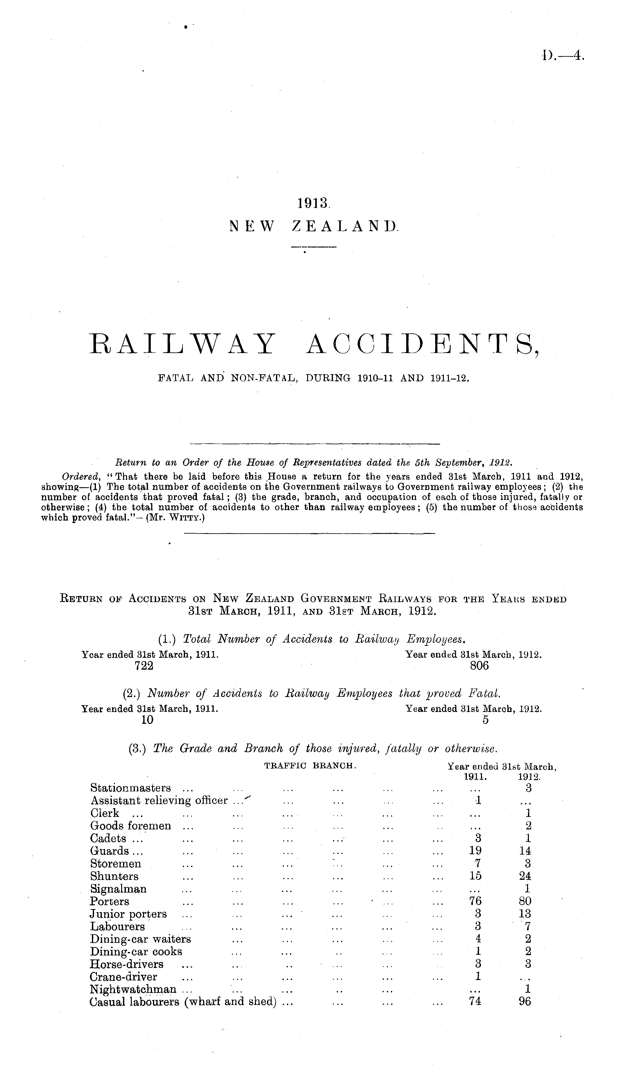 Return to an Order of the House of Representatives dated the sth September, 1912. Ordered, "That there be laid before this House a return for the years ended 31st March, 1911 and 1912, showing—(l) The total number of accidents on the Government railways to Government railway employees; (2) the number of accidents that proved fatal ; (3) the grade, branch, and occupation of each of those injured, fatally or otherwise ; (4) the total number of accidents to other than railway employees; (5) the number of thoss acbidents which proved fatal."— (Mr. Witty.)
