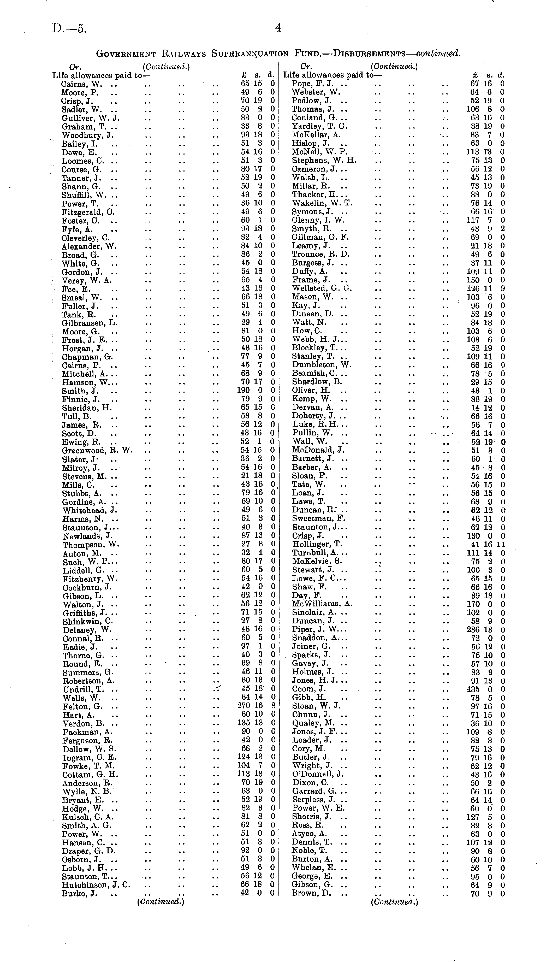 Cr. [Continued.) Life allowances paid to — £ s. d. Cairns, W 65 15 0 Moore, P. .. .. .. .. 49 6 0 Crisp, J. .. .. .. .. 70 19 0 Sadler, W. .. .. .. .. 50 2 0 Gulliver, W. J. .. .. .. 83 0 0 Graham, T. .. .. .. .. 33 8 0 Woodbury, J. .. .. .. 93 18 0 Bailey, I. .. .. .. .. 51 3 0 Dewe, E. .. .. .. .. 54 16 0 Loomes, C. .. .. .. .. 51 3 0 Course, G. .. .. .. .. 80 17 0 Tanner, J. .. .. .. .. 52 19 0 Shann,G. .. .. .. .. 50 2 0 Shuffill, W. .. .. .. .. 49 6 0 Power, T. .. .. .. .. 36 10 0 Fitzgerald, O. .. .. .. 49 6 0 Poster, C. .. •. .. .. 60 1 0 Pyfe, A. .. .. .. .. 93 18 0 Cleverley, C. .. .. .. 82 4 0 Alexander, W 84 10 0 Broad, G. .. • • • ■ • ■ 86 2 0 White, G 45 0 0 Gordon, J. .. • • ■ • • ■ 54 18 0 Verey, W. A. .. .. .. 65 4 0 Pee, E. .. ■ ■ • • .. 43 16 0 Smeal, W. .. .. .. .. 66 18 0 Puller, J. .. . • ■ • .. 51 3 0 Tank, R. .. ■ • . . 49 6 0 Gilbransen, L. .. 29 4 0 Moore, G. .. •• .. •• 81 0 0 Frost, J. E. .. .. .. .. 50 18 0 Horgan, J. .. .. .. .. 43 16 0 Chapman, G. .. .. .. 77 9 0 Cairns, P. .. .. .. .. 45 7 0 Mitohell, A. .. .. .. .. 68 9 0 Hamson, W... .. .. .. 70 17 0 Smith, J. .. .. .. .. 190 0 0 Pinnie, J. .. .. .. .. 79 9 0 Sheridan, H. .. .. .. 65 15 0 Tull, B. .. .. .. .. 58 8 0 James, R. .. .. .. .. 56 12 0 Soott, D. .. .. .. 43 16 0 Ewing, R. .. .. .. .. 52 1 0 Greenwood, R. W. .. .. .. 54 15 0 Slater, J' 36 2 0 Milroy, J. .. • • • • ■ • 54 16 0 Stevens, M. .. .. .. .. 21 18 0 Mills, C. .. • • • • • • 43 16 0 Stubbs, A. .. .. .. .. 79 16 0 Gordine, A. .. .. .. .. 69 10 0 Whitehead, J. .. .. .. 49 6 0 Harms, N. .. .. .. .. 51 3 0 Staunton, J... .. .. .. 40 3 0 Newlands, J. .. .. .. 87 13 0 Thompson, W. .. -. .. 27 8 0 Auton, M. .. .. .. .. 32 4 0 Such, W. P 80 17 0 Liddell, G. .. ■ • .. .. 60 5 0 Fitzhenry, W. .. .. .. 54 16 0 Cockburn, J. .. •. .. 42 0 .0 Gibson, L 62 12 0 Walton, J. .. • • • • • • 56 12 0 I Griffiths, J. .. • • • • . ■ • 71 15 0 Shinkwin, C. .. .. .. 27 8 0 Delaney, W. .. .. .. 48 16 0 Connal, R. .. •• •• •■ 60 5 0 Eadie, J 97 1 0 Thorne, G. .. • • • • • • 40 3 0 Round, E. .. .. .. .. 69 8 0 I Summers, G. .. .. .. 46 11 0 Robertson, A. .. .. .. 60 13 0 Undrill, T. .. .. .. .< 45 18 0 Wells, W. .. . • • ■ ■. 64 14 0 Pelton, G. .. •• •• •• 270 16 8 Hart, A. .. .. .. •• 60 10 0 Verdon, B. .. .. .. .. 135 13 0 Packman, A. .. .. .. 90 0 0 Ferguson,R. .. . • •. 42 0 0 Dellow, W. S. .. .. .. 68 2 0 Ingram, C. E. .. .. .. 124 13 0 Fowke, T. M. .. .. .. 104 7 0 Cottam, G. H. .. .. .. 113 13 0 Anderson, R. .. .. .. 70 19 0 Wylie, N. B. .. .. .. 63 0 0 Bryant, E. .. .. .. .. 52 19 0 Hodge, W 82 3 0 Kulsoh, C. A. .. .. .. 81 8 0 Smith, A. G. .. .. .. 62 2 0 Power, W. .. .. .. .. 51 0 0 Hansen, C. .. .. .. .. 51 3 0 Draper, G. D. .. .. .. 92 0 0 Osborn, J. .. .. .. .. 51 3 0 Lobb, J. H. .. .. .. .. 49 6 0 Staunton, T... .. .. .. 56 12 0 Hutchinson, J. C. .. .. .. 66 18 0 Burke, 3. .. .. .. .. 42 0 0 {Continued.)