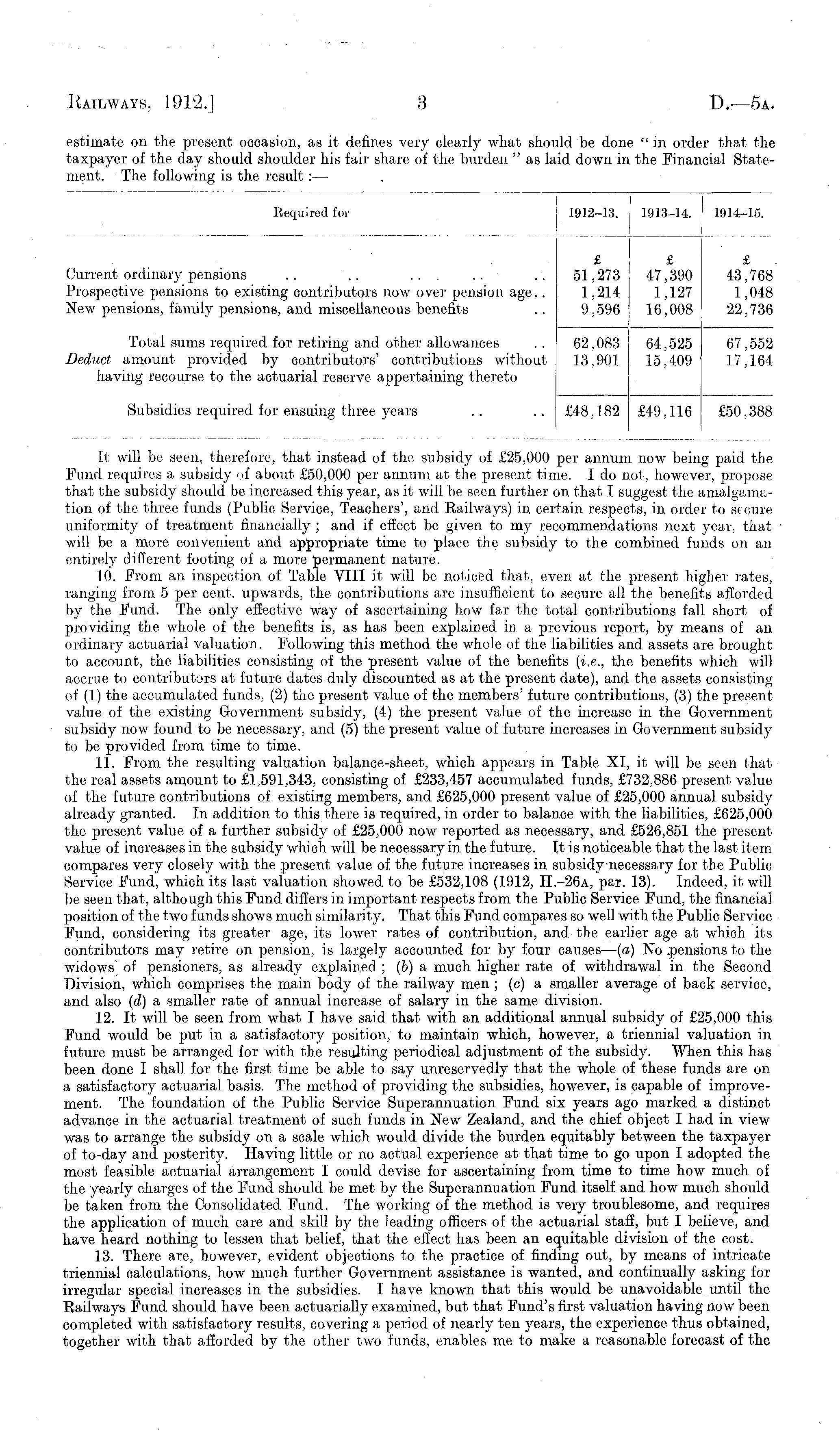 It will be seen, therefore, that instead of the subsidy of £25,000 per annum now being paid the Fund requires a subsidy of about £50,000 per annum at the present time. Ido not, however, propose that the subsidy should be increased this year, as it will be seen further on that I suggest the amalgamation of the three funds (Public Service, Teachers', and Railways) in certain respects, in order to secure uniformity of treatment financially ; and if effect be given, to my recommendations next year, that will be a more convenient and appropriate time to place the subsidy to the combined funds on an entirely different footing of a more permanent nature. 10. From an inspection of Table VIII it will be noticed that, even at the present higher rates, ranging from 5 per cent, upwards, the contributions are insufficient to secure all the benefits afforded by the Fund. The only effective way of ascertaining how far the total contributions fall short of providing the whole of the benefits is, as has been explained in a previous report, by means of an ordinary actuarial valuation. Following this method the whole of the liabilities and assets are brought to account, the liabilities consisting of the present value of the benefits {i.e., the benefits which will accrue to contributors at future dates duly discounted as at the present date), and the assets consisting of (1) the accumulated funds, (2) the present value of the members' future contributions, (3) the present value of the existing Government subsidy, (4) the present value of the increase in the Government subsidy now found to be necessary, and (5) the present value of future increases in Government subsidy to be provided from time to time. 11. From the resulting valuation balance-sheet, which appears in Table XI, it will be seen that the real assets amount to £1,591,343, consisting of £233,457 accumulated funds, £732,886 present value of the future contributions of existing members, and £625,000 present value of £25,000 annual subsidy already granted. In addition to this there is required, in order to balance with the liabilities, £625,000 the present value of a further subsidy of £25,000 now reported as necessary, and £526,851 the present value of increases in the subsidy which will be necessary in the future. It is noticeable that the last item compares very closely with the present value of the future increases in subsidynecessary for the Public Service Fund, which its last valuation showed to be £532,108 (1912, H.-26A, par. 13). Indeed, it will be seen that, although this Fund differs in important respects from the Public Service Fund, the financial position of the two funds shows much similarity. That this Fund compares so well with the Public Service Fund, considering its greater age, its lower rates of contribution, and the earlier age at which its contributors may retire on pension, is largely accounted for by four causes— (a) No .pensions to the of pensioners, as already explained ; (b) a much higher rate of withdrawal in the Second Division, which comprises the main body of the railway men ; (c) a smaller average of back service, and also (d) a smaller rate of annual increase of salary in the same division. 12. It will be seen from what I have said that with an additional annual subsidy of £25,000 this Fund would be put in a satisfactory position, to maintain which, however, a triennial valuation in future must be arranged for with the resulting periodical adjustment of the subsidy. When this has been done I shall for the first time be able to say unreservedly that the whole of these funds are on a satisfactory actuarial basis. The method of providing the subsidies, however, is capable of improvement. The foundation of the Public Service Superannuation Fund six years ago marked a distinct advance in the actuarial treatment of such funds in New Zealand, and the chief object I had in view was to arrange the subsidy on a scale which would divide the burden equitably between the taxpayer of to-day and posterity. Having little or no actual experience at that time to go upon I adopted the most feasible actuarial arrangement I could devise for ascertaining from time to time how much of the yearly charges of the Fund should be met by the Superannuation Fund itself and how much should be taken from the Consolidated Fund. The working of the method is very troublesome, and requires the application of much care and skill by the leading officers of the actuarial staff, but I believe, and have heard nothing to lessen that belief, that the effect has been an equitable division of the cost. 13. There are, however, evident objections to the practice of finding out, by means of intricate triennial calculations, how much further Government assistance is wanted, and continually asking for irregular special increases in the subsidies. I have known that this would be unavoidable until the Railways Fund should have been actuarially examined, but that Fund's first valuation having now been completed with satisfactory results, covering a period of nearly ten years, the experience thus obtained, together with that afforded by the other two funds, enables me to make a reasonable forecast of the