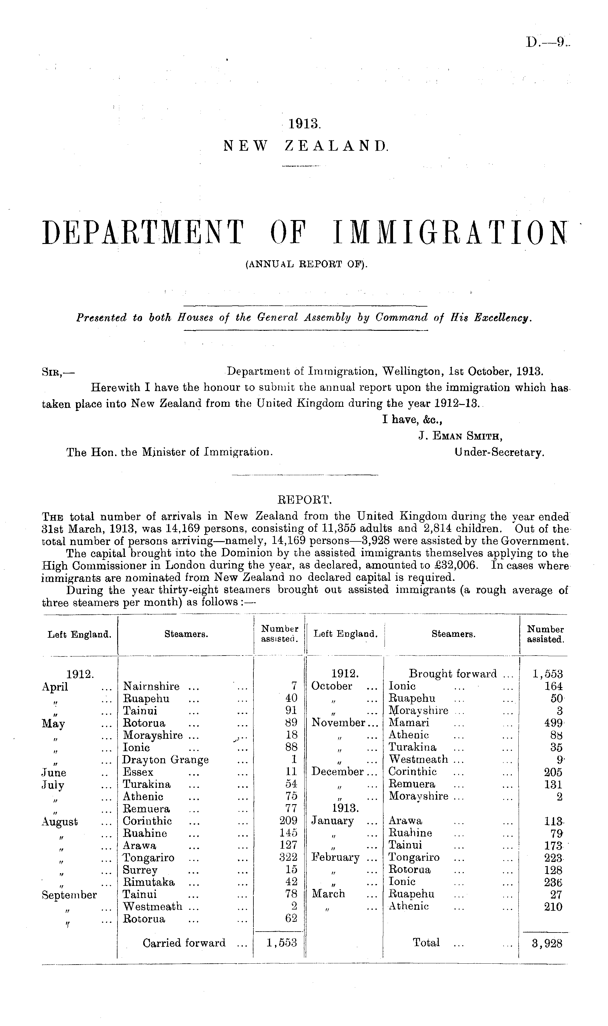 Sib, — Department of Immigration, Wellington, Ist October, 1913. Herewith I have the honour to submit the annual report upon the immigration which has taken place into New Zealand from the United Kingdom during the year 1912-13. I have, &c, J. Bman Smith, The Hon. the Minister of Immigration. Under-Secretary.