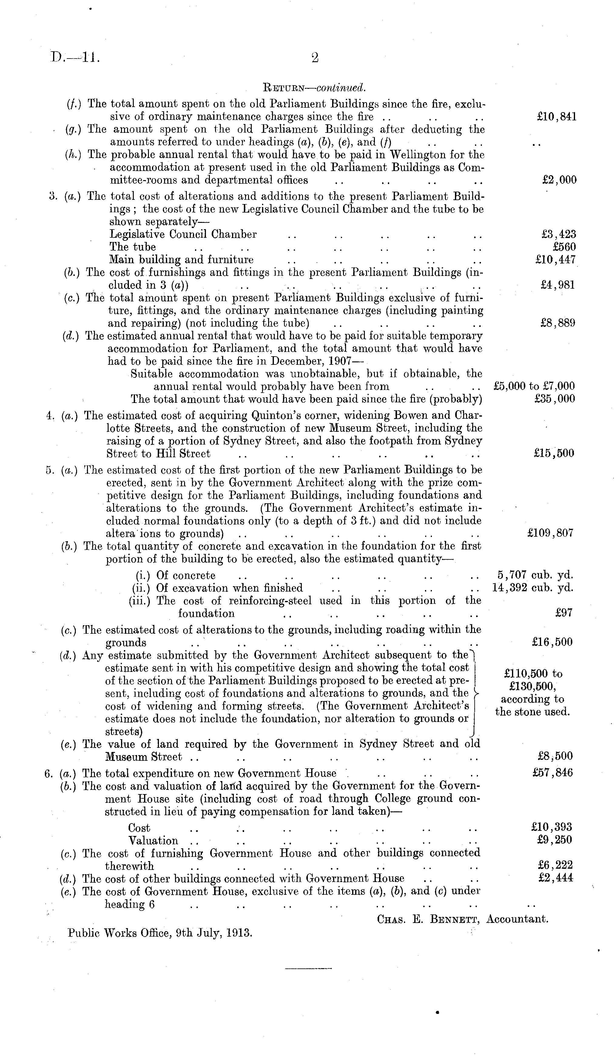 Return — continued. (/.) The total amount spent on the old Parliament Buildings since the fire, exclusive of ordinary maintenance charges since the fire .. .. .. £10,841 (g.) The amount spent on the old Parliament Buildings after deducting the amounts referred to under headings (a), (b), (c), and (/) (h.) The probable annual rental that would have to be paid in Wellington for the accommodation at present used in the old Parliament Buildings as Com-mittee-rooms and departmental offices .. .. .. .. £2,000 3. (as.) The total cost of alterations and additions to the present Parliament Buildings ; the cost of the new Legislative Council Chamber and the tube to be shown separately— Legislative Council Chamber .. .. .. .. .. £3,423 The tube .. .. .. .. .. .. .. £560 Main building and furniture .. .. .. £10,447 (b.) The cost of furnishings and fittings in the present Parliament Buildings (included in 3 (a)) .. '.. .... r . .. £4,981 (c.) The total amount spent on present Parliament Buildings exclusive of furniture, fittings, and the ordinary maintenance charges (including painting and repairing) (not including the tube) . . .. .. .. £8,889 (d.) The estimated annual rental that would have to be paid for suitable temporary accommodation for Parliament, and the total amount that would have had to be paid since the fire in December, 1907 — Suitable accommodation was unobtainable, but if obtainable, the annual rental would probably have been from .. . . £5,000 to £7,000 The total amount that would have been paid since the fire (probably) £35,000 4. (a.) The estimated cost of acquiring Quinton's corner, widening Bo wen and Charlotte Streets, and the construction of new Museum Street, including the raising of a portion of Sydney Street, and also the footpath from Sydney Street to Hill Street .. .. .. .. .. .. £15,500 5. (a.) The estimated cost of the first portion of the new Parliament Buildings to be erected, sent in by the Government Architect along with the prize competitive design for the Parliament Buildings, including foundations and alterations to the grounds. (The Government Architect's estimate included normal foundations only (to a depth of 3 ft.) and did not include altera ions to grounds) .. .. .. .. .. .. £109,807 (6.) The total quantity of concrete and excavation in the foundation for the first portion of the building to be erected, also the estimated quantity-— (i.) Of concrete .. .. .. .. .. .. 5,707 cub. yd. (ii.) Of excavation when finished .. .. .. .. 14,392 cub. yd. (iii.) The cost of reinforcing-steel used in this portion of the foundation .. .. .. .. .. £97 (c.) The estimated cost of alterations to the grounds, including roading within the grounds .. .. .. .. .. .. .. £16,500 (d.) Any estimate submitted by the Government Architect subsequent to the" estimate sent in with his competitive design and showing the total cost piin WO f of the section of the Parliament Buildings proposed to be erected at pre- „, „» -„„ sent, including cost of foundations and alterations to grounds, and the rd'inp 't cost of widening and forming streets. (The Government Architect's ~ , a estimate does not include the foundation, nor alteration to grounds or streets) J (c.) The value of land required by the Government in Sydney Street and old Museum Street .. .. .. .. .. .. .. £8,500 6. (a.) The total expenditure on new Government House '. .. .. .. £57,846 (b.) The cost and valuation of land acquired by the Government for the Government House site (including cost of road through College ground constructed in lieu of paying compensation for land taken) — Cost .. .. .. .. .. .. .. £10,393 Valuation .. .. .. .. .. .. .. £9,250 (c.) The cost of furnishing Government House and other buildings connected therewith .. £6,222 (d.) The cost of other buildings connected with Government House .. .. £2,444 (c.) The cost of Government House, exclusive of the items (a), (b), and (c) under heading 6 Chas. E. Bennett, Accountant. Public Works Office, 9th July, 1913.