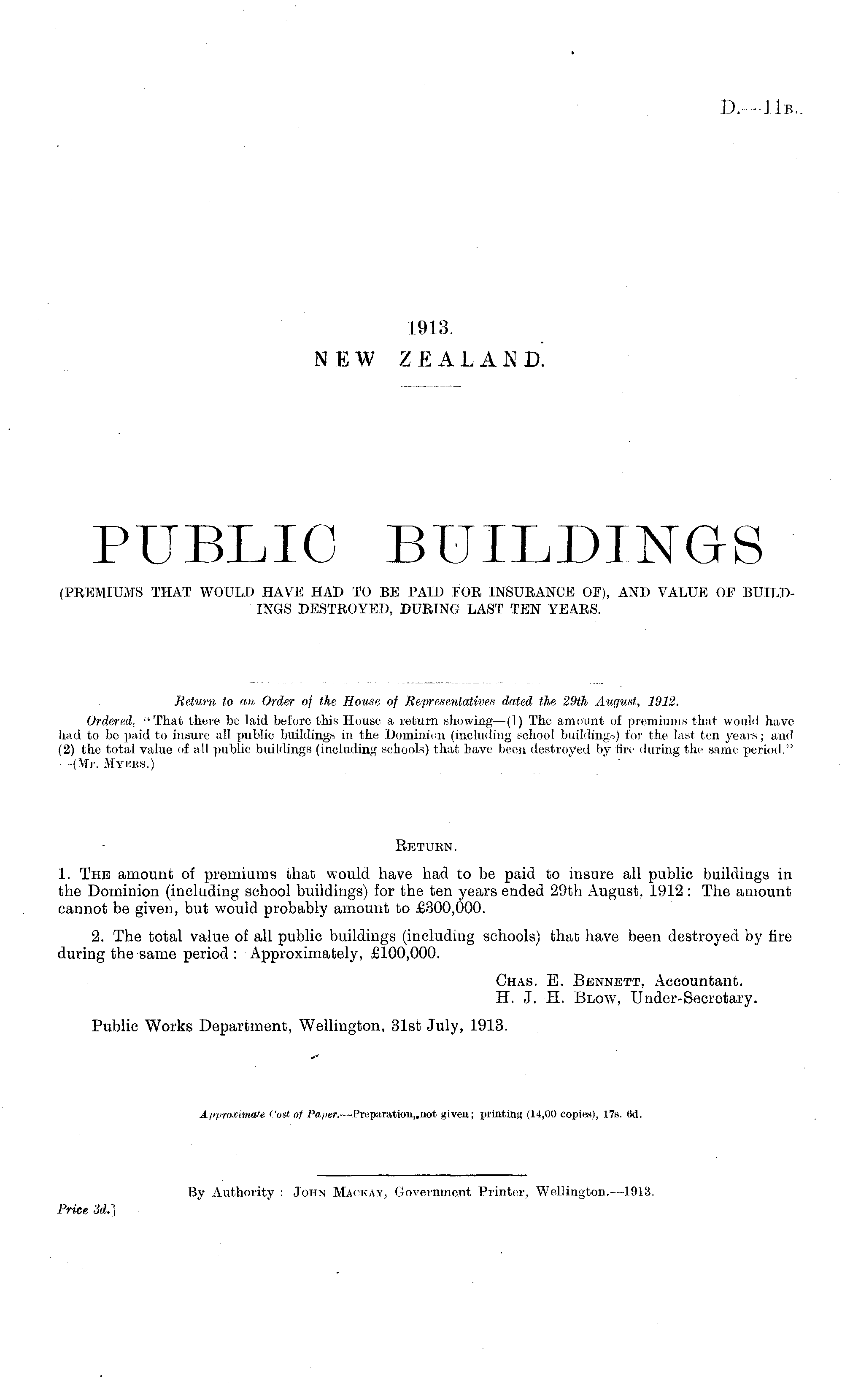 Return. 1. The amount of premiums that would have had to be paid to insure all public buildings in the Dominion (including school buildings) for the ten years ended 29th August, 1912 : The amount cannot be given, but would probably amount to £300,000. 2. The total value of all public buildings (including schools) that have been destroyed by fire during the same period : Approximately, £100,000. Chas. E. Bennett, Accountant. H. J. H. Blow, Under-Secretary. Public Works Department, Wellington, 31st July, 1913. Approximate Cost of Paper. —Preparation,.not given; printing {14,00 copies), 17s. ed.