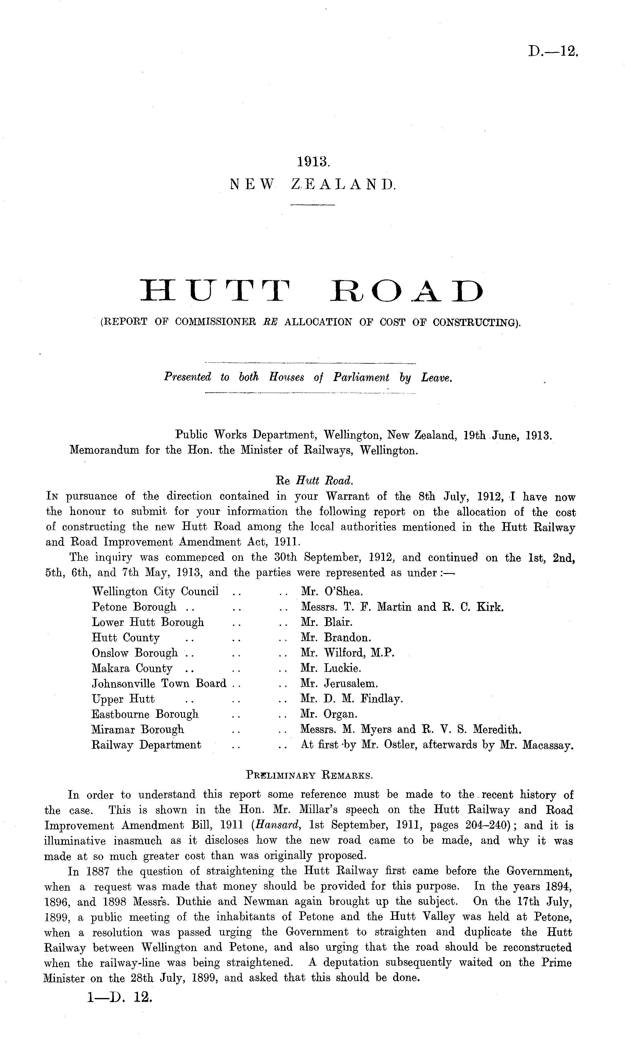 Public Works Department, Wellington, New Zealand, 19th June, 1913. Memorandum for the Hon. the Minister of Eailways, Wellington. Re Hutt Road. In pursuance of the direction contained in your Warrant of the Bth July, 1912, I have now the honour to submit for your information the following report on the allocation of the cost of constructing the new Hutt Road among the local authorities mentioned in the Hutt Railway and Road Improvement Amendment Act, 1911. The inquiry was commenced on the 30th September, 1912, and continued on the Ist, 2nd, sth, 6th, and 7th May, 1913, and the parties were represented as under: — Wellington City Council .. .. Mr. O'Shea. Petone Borough .. .. .. Messrs. T. F. Martin and R. C. Kirk. Lower Hutt Borough .. .. Mr. Blair. Hutt County .. .. .. Mr. Brandon. Onslow Borough .. .. .. Mr. Wilford, M.P. Makara County .. .. .. Mr. Luckie. Johnsonville Town Board .. .. Mr. Jerusalem. Upper Hutt .. .. .. Mr. D. M. Findlay. Eastbourne Borough .. .. Mr. Organ. Miramar Borough .. .. Messrs. M. Myers and R. V. S. Meredith. Railway Department .. .. At first -by Mr. Ostler, afterwards by Mr. Macassay. Preliminary Remarks. In order to understand this report some reference must be made to the recent history of the case. This is shown in the Hon. Mr. Millar's speech on the Hutt Railway and Road Improvement Amendment Bill, 1911 (Hansard, Ist September, 1911, pages 204-240); and it is illuminative inasmuch as it discloses how the new road came to be made, and why it was made at so much greater cost than was originally proposed. In 1887 the question of straightening the Hutt Railway first came before the Government, when a request was made that money should be provided for this purpose. In the years 1894, 1896, and 1898 Messrs. Duthie and Newman again brought up the subject. On the 17th July, 1899, a public meeting of the inhabitants of Petone and the Hutt Valley was held at Petone, when a resolution was passed urging the Government to straighten and duplicate the Hutt Railway between Wellington and Petone, and also urging that the road should be reconstructed when the railway-line was being straightened. A deputation subsequently waited on the Prime Minister on the 28th July, 1899, and asked that this should be done.