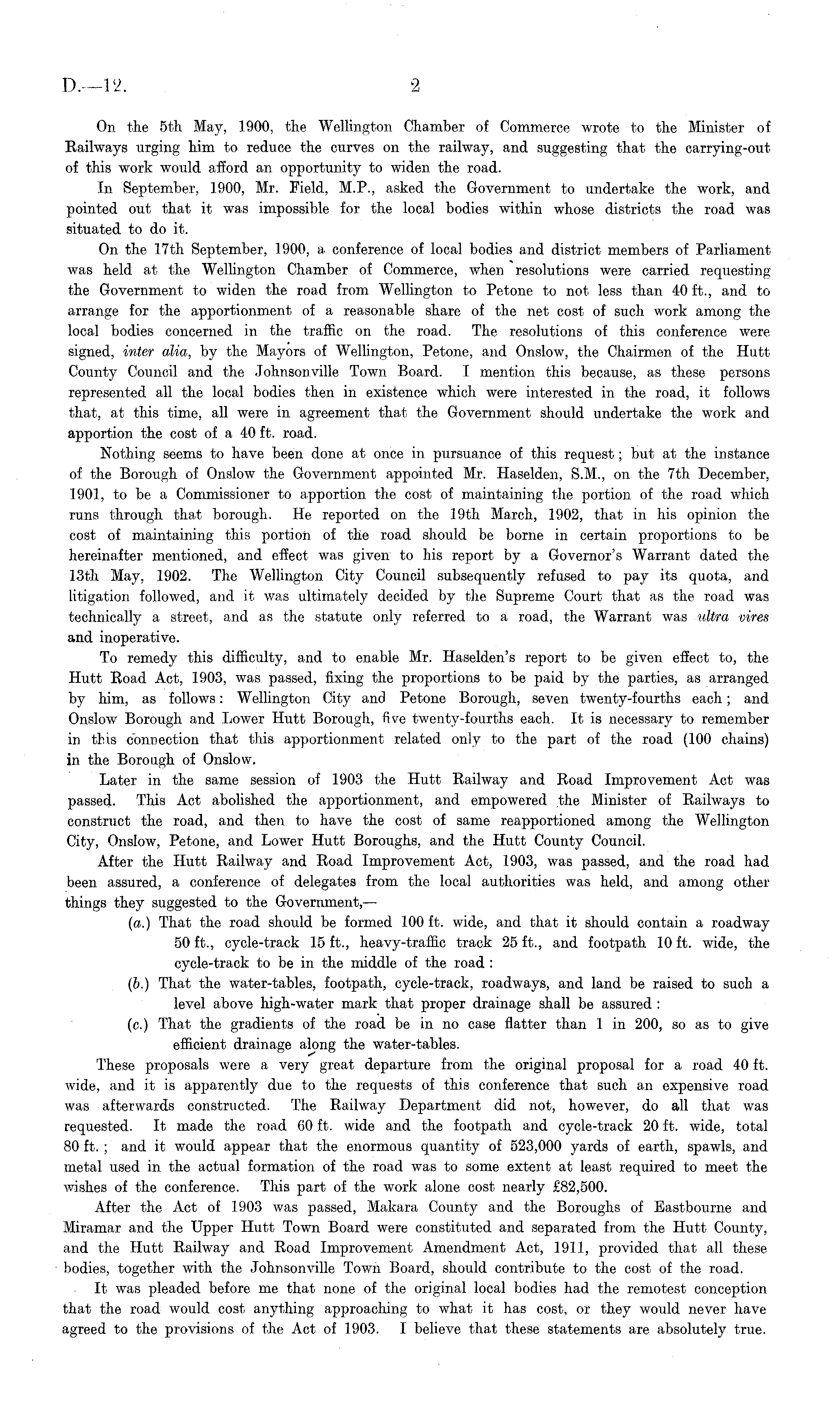 On the sth May, 1900, the Wellington Chamber of Commerce wrote to the Minister of Railways urging him to reduce the curves on the railway, and suggesting that the carrying-out of this work would afford an opportunity to widen the road. In September, 1900, Mr. Field, M.P., asked the Government to undertake the work, and pointed out that it was impossible for the local bodies within whose districts the road was situated to do it. On the 17th September, 1900, a conference of local bodies and district members of Parliament was held at the Wellington Chamber of Commerce, when resolutions were carried requesting the Government to widen the road from Wellington to Petone to not less than 40 ft., and to arrange for the apportionment of a reasonable share of the net cost of such work among the local bodies concerned in the traffic on the road. The resolutions of this conference were signed, inter alia, by the Mayors of Wellington, Petone, and Onslow, the Chairmen of the Hutt County Council and the Johnsonville Town Board. I mention this because, as these persons represented all the local bodies then in existence which were interested in the road, it follows that, at this time, all were in agreement that the Government should undertake the work and apportion the cost of a 40 ft. road. Nothing seems to have been done at once in pursuance of this request; but at the instance of the Borough of Onslow the Government appointed Mr. Haselden, S.M., on the 7th December, 1901, to be a Commissioner to apportion the cost of maintaining the portion of the road which runs through that borough. He reported on the 19th March, 1902, that in his opinion the cost of maintaining this portion of the road should be borne in certain proportions to be hereinafter mentioned, and effect was given to his report by a Governor's Warrant dated the 13th May, 1902. The Wellington City Council subsequently refused to pay its quota, and litigation followed, and it was ultimately decided by the Supreme Court that as the road was technically a street, and as the statute only referred to a road, the Warrant was ultra vires and inoperative. To remedy this difficulty, and to enable Mr. Haselden's report to be given effect to, the Hutt Road Act, 1903, was passed, fixing the proportions to be paid by the parties, as arranged by him, as follows: Wellington City and Petone Borough, seven twenty-fourths each; and Onslow Borough and Lower Hutt Borough, five twenty-fourths each. It is necessary to remember in tins connection that this apportionment related only to the part of the road (100 chains) in the Borough of Onslow. Later in the same session of 1903 the Hutt Railway and Road Improvement Act was passed. This Act abolished the apportionment, and empowered the Minister of Railways to construct the road, and then to have the cost of same reapportioned among the Wellington City, Onslow, Petone, and Lower Hutt Boroughs, and the Hutt County Council. After the Hutt Railway and Road Improvement Act, 1903, was passed, and the road had been assured, a conference of delegates from the local authorities was held, and among other things they suggested to the Government, — (a.) That the road should be formed 100 ft. wide, and that it should contain a roadway 50 ft., cycle-track 15 ft., heavy-traffic track 25 ft., and footpath 10 ft. wide, the cycle-track to be in the middle of the road : (b.) That the water-tables, footpath, cycle-track, roadways, and land be raised to such a level above high-water mark that proper drainage shall be assured : (c.) That the gradients of the road be in no case flatter than 1 in 200, so as to give efficient drainage along the water-tables. These proposals were a very great departure from the original proposal for a road 40 ft. wide, and it is apparently due to the requests of this conference that such an expensive road was afterwards constructed. The Railway Department did not, however, do all that was requested. It made the road 60 ft. wide and the footpath and cycle-track 20 ft. wide, total 80 ft. ; and it would appear that the enormous quantity of 523,000 yards of earth, spawls, and metal used in the actual formation of the road was to some extent at least required to meet the wishes of the conference. This part of the work alone cost nearly £82,500. After the Act of 1903 was passed, Makara County and the Boroughs of Eastbourne and Miramar and the Upper Hutt Town Board were constituted and separated from the Hutt County, and the Hutt Railway and Road Improvement Amendment Act, 1911, provided that all these bodies, together with the Johnsonville Town Board, should contribute to the cost of the road. It was pleaded before me that none of the original local bodies had the remotest conception that the road would cost anything approaching to what it has cost, or they would never have agreed to the provisions of the Act of 1903. I believe that these statements are absolutely true.
