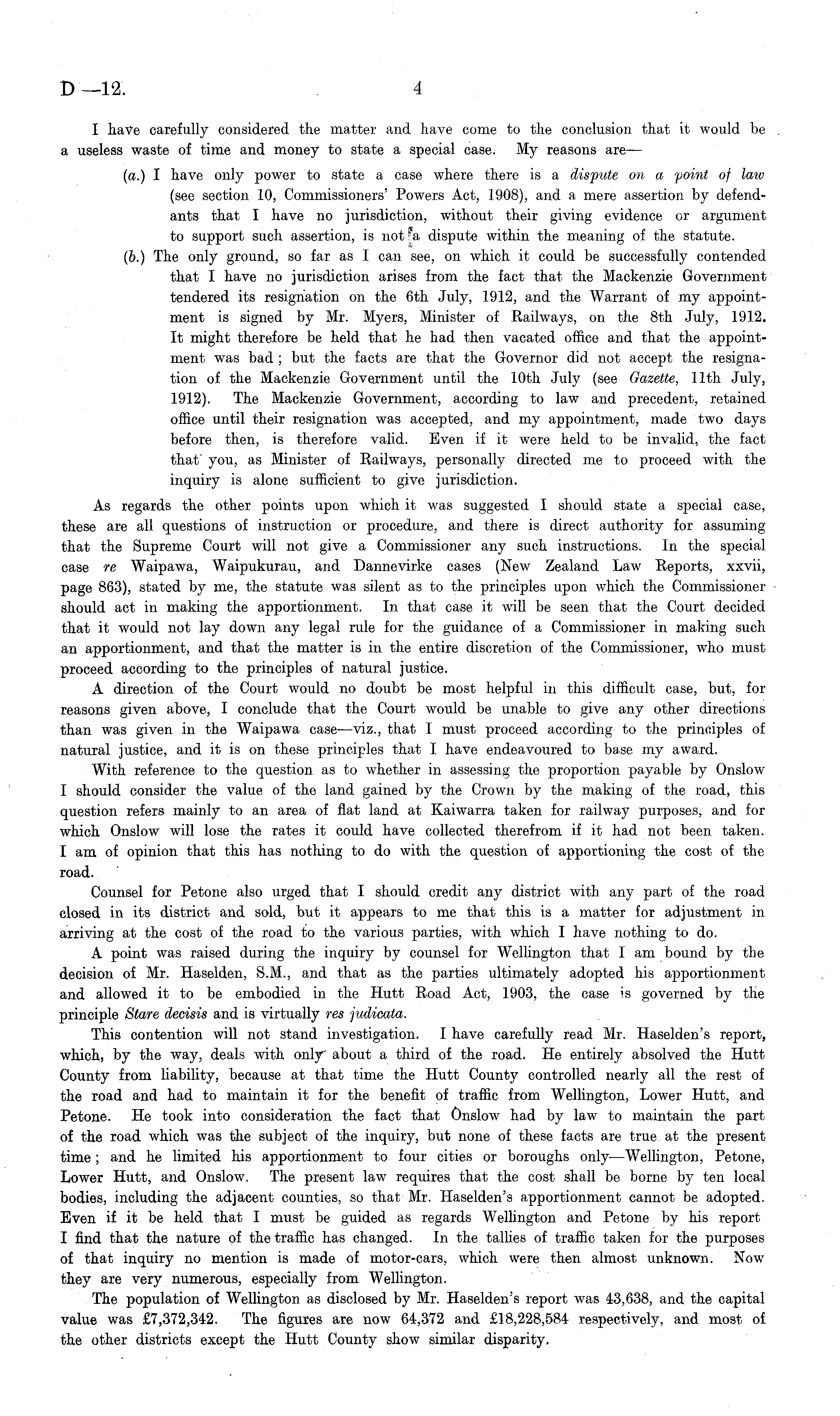 I have carefully considered the matter and have come to the conclusion that it would be a useless waste of time and money to state a special case. My reasons are— (a.) I have only power to state a case where there is a dispute on a point of law (see section 10, Commissioners' Powers Act, 1908), and a mere assertion by defendants that I have no jurisdiction, without their giving evidence or argument to support such assertion, is not fa dispute within the meaning of the statute. (6.) The only ground, so far as I can see, on which it could be successfully contended that I have no jurisdiction arises from the fact that the Mackenzie Government tendered its resignation on the 6th July, 1912, and the Warrant of my appointment is signed by Mr. Myers, Minister of Railways, on the Bth July, 1912. It might therefore be held that he had then vacated office and that the appointment was bad ; but the facts are that the Governor did not accept the resignation of the Mackenzie Government until the 10th July (see Gazette, 11th July, 1912). The Mackenzie Government, according to law and precedent, retained office until their resignation was accepted, and my appointment, made two days before then, is therefore valid. Even if it were held to be invalid, the fact that you, as Minister of Railways, personally directed me to proceed with the inquiry is alone sufficient to give jurisdiction. As regards the other points upon which it was suggested I should state a special case, these are all questions of instruction or procedure, and there is direct authority for assuming that the Supreme Court will not give a Commissioner any such instructions. In the special case re Waipawa, Waipukurau, and Dannevirke cases (New Zealand Law Reports, xxvii, page 863), stated by me, the statute was silent as to the principles upon which the Commissioner should act in making the apportionment. In that case it will be seen that the Court decided that it would not lay down any legal rule for the guidance of a Commissioner in making such an apportionment, and that the matter is in the entire discretion of the Commissioner, who must proceed according to the principles of natural justice. A direction of the Court would no doubt be most helpful in this difficult case, but, for reasons given above, I conclude that the Court would be unable to give any other directions than was given in the Waipawa case —viz., that I must proceed according to the principles of natural justice, and it is on these principles that I have endeavoured to base my award. With reference to the question as to whether in assessing the proportion payable by Onslow I should consider the value of the land gained by the Crown by the making of the road, this question refers mainly to an area of flat land at Kaiwarra taken for railway purposes, and for which Onslow will lose the rates it could have collected therefrom if it had not been taken. I am of opinion that this has nothing to do with the question of apportioning the cost of the road. Counsel for Petone also urged that I should credit any district with any part of the road closed in its district and sold, but it appears to me that this is a matter for adjustment in arriving at the cost of the road to the various parties, with which I have nothing to do. A point was raised during the inquiry by counsel for Wellington that I am bound by the decision of Mr. Haselden, S.M., and that as the parties ultimately adopted his apportionment and allowed it to be embodied in the Hutt Road Act, 1903, the case is governed by the principle Stare decisis and is virtually res judicata. This contention will not stand investigation. I have carefully read Mr. Haselden's report, which, by the way, deals with only about a third of the road. He entirely absolved the Hutt County from liability, because at that time the Hutt County controlled nearly all the rest of the road and had to maintain it for the benefit of traffic from Wellington, Lower Hutt, and Petone. He took into consideration the fact that Onslow had by law to maintain the part of the road which was the subject of the inquiry, but none of these facts are true at the present time ; and he limited his apportionment to four cities or boroughs only —Wellington, Petone, Lower Hutt, and Onslow. The present law requires that the cost shall be borne by ten local bodies, including the adjacent counties, so that Mr. Haselden's apportionment cannot be adopted. Even if it be held that I must be guided as regards Wellington and Petone by his report I find that the nature of the traffic has changed. In the tallies of traffic taken for the purposes of that inquiry no mention is made of motor-cars, which were then almost unknown. Now they are very numerous, especially from Wellington. The population of Wellington as disclosed by Mr. Haselden's report was 43,638, and the capital value was £7,372,342. The figures are now 64,372 and £18,228,584 respectively, and most of the other districts except the Hutt County show similar disparity.