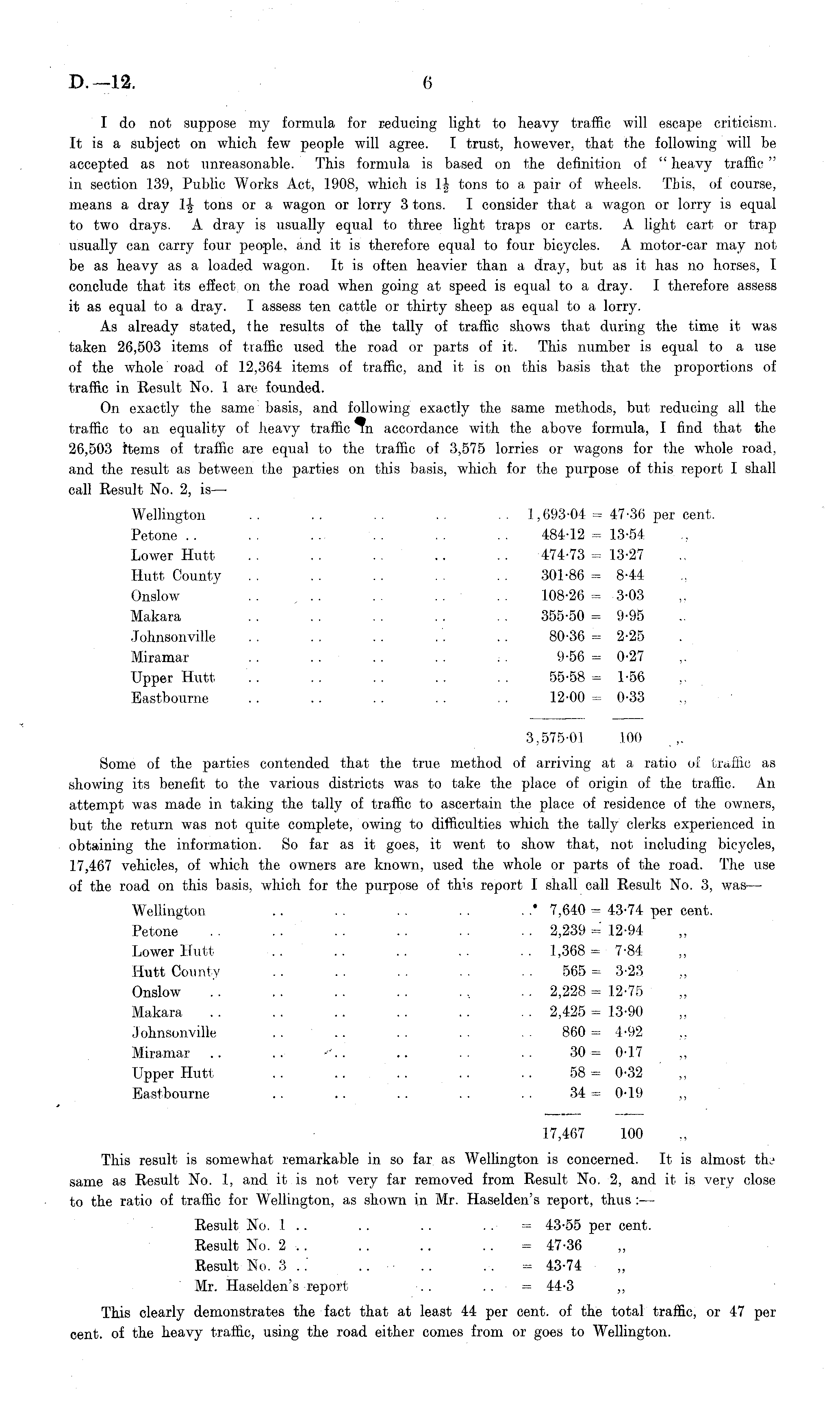 I do not suppose my formula for reducing light to heavy traffic will escape criticism. It is a subject on which few people will agree. I trust, however, that the following will be accepted as not unreasonable. This formula is based on the definition of " heavy traffic " in section 139, Public Works Act, 1908, which is 1| tons to a pair of wheels. This, of course, means a dray tons or a wagon or lorry 3 tons. I consider that a wagon or lorry is equal to two drays. A dray is usually equal to three light traps or carts. A light cart or trap usually can carry four people, and it is therefore equal to four bicycles. A motor-car may not be as heavy as a loaded wagon. It is often heavier than a dray, but as it has no horses, I conclude that its effect on the road when going at speed is equal to a dray. I therefore assess it as equal to a dray. I assess ten cattle or thirty sheep as equal to a lorry. As already stated, the results of the tally of traffic shows that during the time it was taken 26,503 items of tiaffic used the road or parts of it. This number is equal to a use of the whole road of 12,364 items of traffic, and it is on this basis that the proportions of traffic in Result No. 1 are founded. On exactly the same basis, and following exa.ctly the same methods, but reducing all the traffic to an equality of heavy traffic in accordance with the above formula, I find that the 26,503 items of traffic are equal to the traffic of 3,575 lorries or wagons for the whole road, and the result as between the parties on this basis, which for the purpose of this report I shall call Result No. 2, is— Wellington .. .. .. .. .. 1,693-04 = 47-36 per cent. Petone .. .. . . .. 484-12 = 13-54 Lower Hutt . . .. . . .. . . 474-73 = 13-27 Hutt County . . .. .. . . . . 301-86 = 8-44 Onslow . . , .. . . . . . . 108-26 = 3-03 Makara . . .. . . .. . . 355-50 = 9-95 Johnsonville . . . . . . . . . . 80-36 = 2-25 Miramar .. .. .. .. .. 9-56 = 0-27 Upper Hutt .. .. .. .. .. 55-58= 1-56 Eastbourne . . .. . . . . . . 12-00 = 0-33 3,575-01 100 Some of the parties contended that the true method of arriving at a ratio of traffic as showing its benefit to the various districts was to take the place of origin of the traffic. An attempt was made in taking the tally of traffic to ascertain the place of residence of the owners, but the return was not quite complete, owing to difficulties which the tally clerks experienced in obtaining the information. So far as it goes, it went to show that, not including bicycles, 17,467 vehicles, of which the owners are known, used the whole or parts of the road. The use of the road on this basis, which for the purpose of this report I shall call Result No. 3, was— Wellington . . . . . . . . . .' 7,640 = 43-74 per cent. Petone . . .. . . .. . . . . 2,239 = 12-94 Lower Hutt .. .. .. .. .. 1,368 = 7-84 Hutt County .. . . . . . . 565 = 3-23 Onslow ... .. 2,228 = 12-75 Makara . . . . .. . . . . . . 2,425 = 13-90 Johnsonville .. .. . . . . . . 860 = 4-92 Miramar .. .. .. .. .. .. 30= 0-17 Upper Hutt .. .. . . . . .. 58 = 0-32 Eastbourne .. .. .. .. . . 34 = 0-19 17,467 100 This result is somewhat remarkable in so far as Wellington is concerned. It is almost the" same as Result No. 1, and it is not very far removed from Result No. 2, and it is very close to the ratio of traffic for Wellington, as shown in Mr. Haselden's report, thus : — Result No. 1 .. .. . . ..■ = 43-55 per cent. Result No. 2 .. .. .. .. = 47-36 Result No. 3 ..' .. .. .. = 43-74 Mr. Haselden's report -.. . . • = 44-3 ~ This clearly demonstrates the fact that at least 44 per cent, of the total traffic, or 47 per cent, of the heavy traffic, using the road either comes from or goes to Wellington.