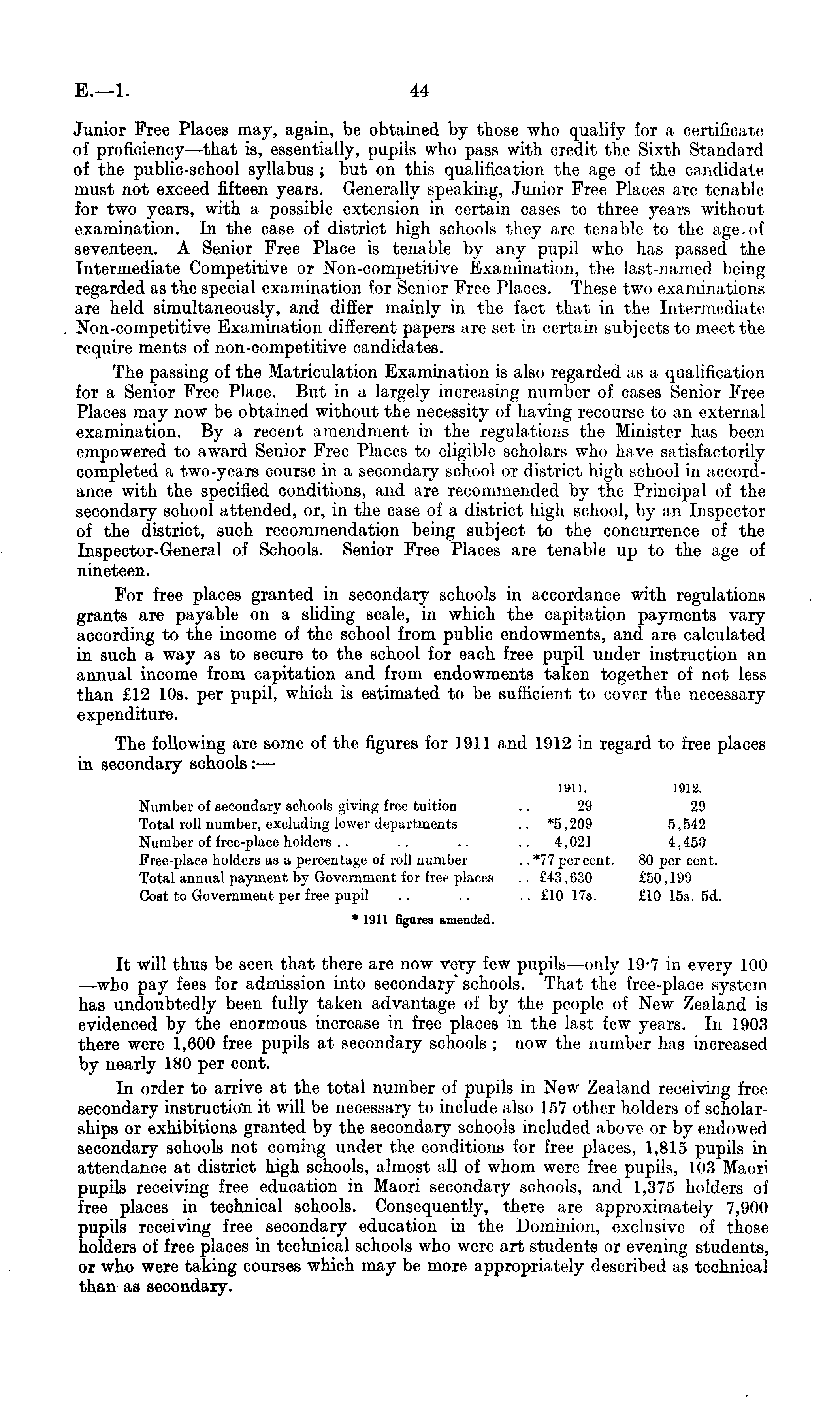 Junior Free Places may, again, be obtained by those who qualify for a certificate of proficiency—that is, essentially, pupils who pass with credit the Sixth Standard of the public-school syllabus ; but on this qualification the age of the candidate must not exceed fifteen years. Generally speaking, Junior Free Places are tenable for two years, with a possible extension in certain cases to three years without examination. In the case of district high schools they are tenable to the age of seventeen. A Senior Free Place is tenable by any pupil who has passed the Intermediate Competitive or Non-competitive Examination, the last-named being regarded as the special examination for Senior Free Places. These two examinations are held simultaneously, and differ mainly in the fact that in the Intermediate Non-competitive Examination different papers are set in certain subjects to meet the require ments of non-competitive candidates. The passing of the Matriculation Examination is also regarded as a qualification for a Senior Free Place. But in a largely increasing number of cases Senior Free Places may now be obtained without the necessity of having recourse to an external examination. By a recent amendment in the regulations the Minister has been empowered to award Senior Free Places to eligible scholars who have satisfactorily completed a two-years course in a secondary school or district high school in accordance with the specified conditions, and are recommended by the Principal of the secondary school attended, or, in the case of a district high school, by an Inspector of the district, such recommendation being subject to the concurrence of the Inspector-General of Schools. Senior Free Places are tenable up to the age of nineteen. For free places granted in secondary schools in accordance with regulations grants are payable on a sliding scale, in which the capitation payments vary according to the income of the school from public endowments, and are calculated in such a way as to secure to the school for each free pupil under instruction an annual income from capitation and from endowments taken together of not less than £12 10s. per pupil, which is estimated to be sufficient to cover the necessary expenditure. The following are some of the figures for 1911 and 1912 in regard to free places in secondary schools:— 1911. 1912. Number of secondary schools giving free tuition .. 29 29 Total roll number, excluding lower departments .. *5,209 5,542 Number of free-place holders .. .. .. .. 4,021 4,450 Free-place holders as a percentage of roll number . . *77 per cent. 80 per centTotal annual payment by Government for free places .. £43,630 £50,199 Cost to Government per free pupil .. .. .. £10 17s. £10 15s. sd. * 1911 figures amended. It will thus be seen that there are now very few pupils—only 19*7 in every 100 —who pay fees for admission into secondary schools. That the free-place system has undoubtedly been fully taken advantage of by the people of New Zealand is evidenced by the enormous increase in free places in the last few years. In 1903 there were 1,600 free pupils at secondary schools ; now the number has increased by nearly 180 per cent. In order to arrive at the total number of pupils in New Zealand receiving free secondary instruction it will be necessary to include also 157 other holders of scholarships or exhibitions granted by the secondary schools included above or by endowed secondary schools not coming under the conditions for free places, 1,815 pupils in attendance at district high schools, almost all of whom were free pupils, 103 Maori pupils receiving free education in Maori secondary schools, and 1,375 holders of free places in technical schools. Consequently, there are approximately 7,900 pupils receiving free secondary education in the Dominion, exclusive of those holders of free places in technical schools who were art students or evening students, or who were taking courses which may be more appropriately described as technical than as secondary.