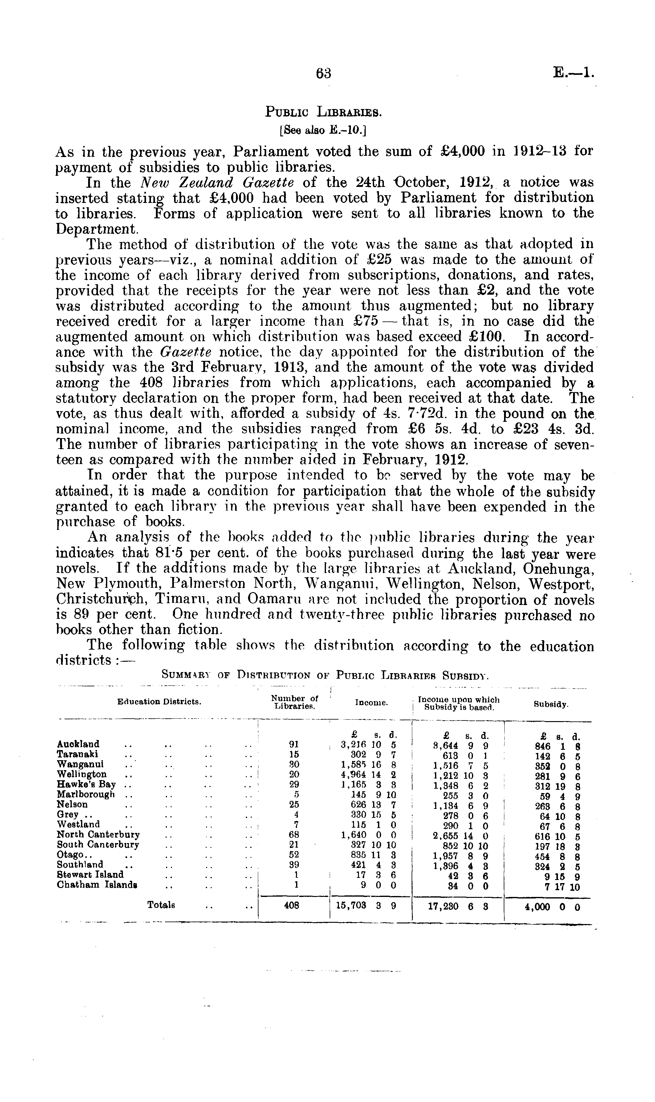 Public Libbabies. |See also E.-10.] As in the previous year, Parliament voted the sum of £4,000 in 1912-13 for payment of subsidies to public libraries. In the New Zealand Gazette of the 24th October, 1912, a notice was inserted stating that £4,000 had been voted by Parliament for distribution to libraries. Forms of application were sent to all libraries known to the Department. The method of distribution of the vote was the same as that adopted in previous years—viz., a nominal addition of £25 was made to the amount of the income of each library derived from subscriptions, donations, and rates, provided that the receipts for the year were not less than £2, and the vote was distributed according to the amount thus augmented; but no library received credit for a larger income than £75 — that is, in no case did the augmented amount on which distribution was based exceed £100. In accordance with the Gazette notice, the day appointed for the distribution of the subsidy was the 3rd February, 1913, and the amount of the vote was divided among the 408 libraries from which applications, each accompanied by a statutory declaration on the proper form, had been received at that date. The vote, as thus dealt with, afforded a subsidy of 4s. 7-72 d. in the pound on the nominal income, and the subsidies ranged from £6 ss. 4d. to £23 4s. 3d. The number of libraries participating in the vote shows an increase of seventeen as compared with the number aided in February, 1912. In order that the purpose intended to bo served by the vote may be attained, it is made a condition for participation that the whole of the subsidy granted to each library in the previous year shall have been expended in the purchase of books. An analysis of the books added to the public libraries during the year indicates that BPS per cent, of the books purchased during the last year were novels. If the additions made by the large libraries at Auckland, Onehunga, New Plymouth, Palmerston North, Wanganui, Wellington, Nelson, Westport, Christchurtph, Timaru, and Oamaru are not included the proportion of novels is 89 per cent. One hundred and twenty-three public libraries purchased no books other than fiction. The following table shows the distribution according to the education districts :—