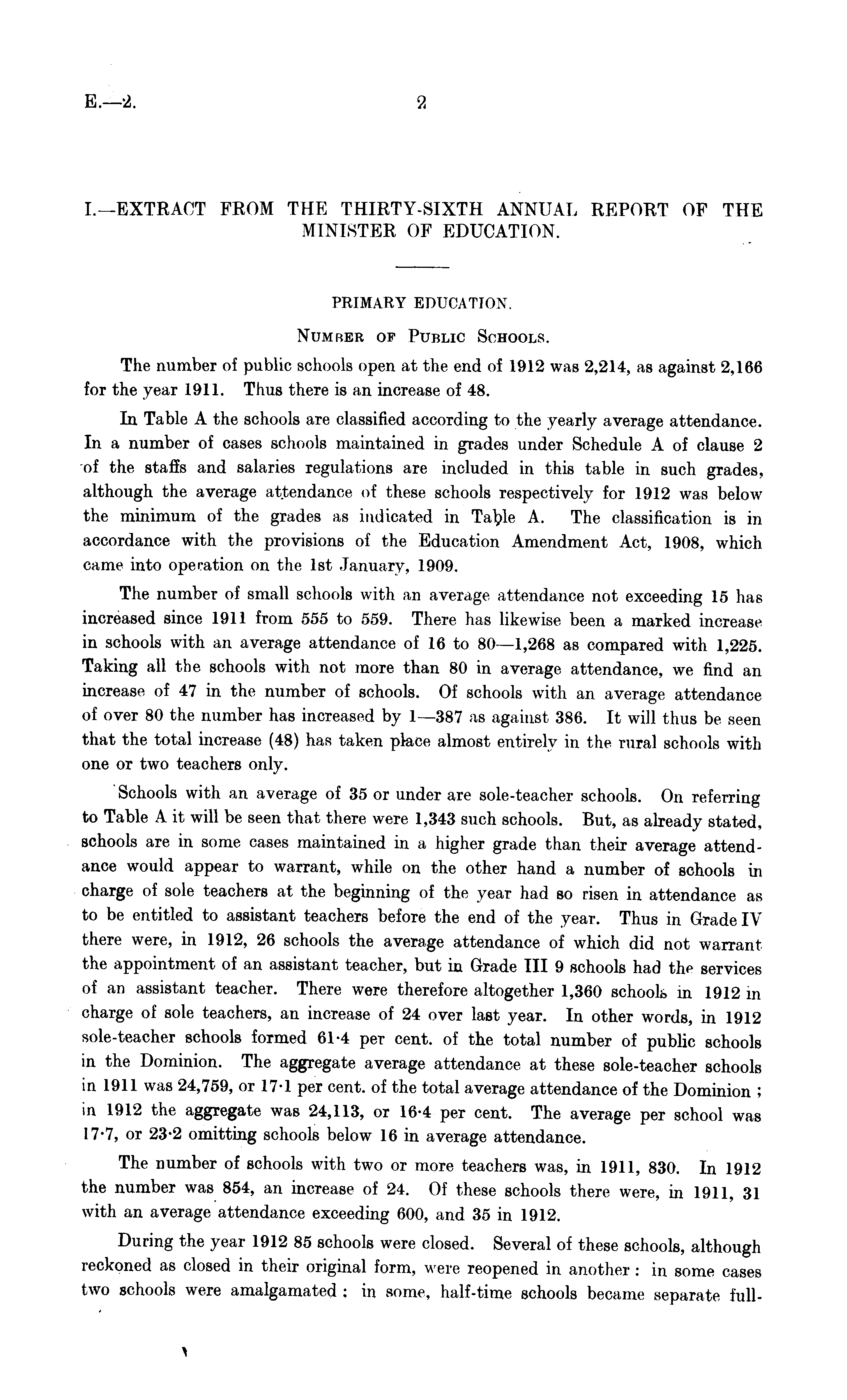 I.—EXTRACT FROM THE THIRTY-SIXTH ANNUAL REPORT OF THE MINISTER OF EDUCATION. PRIMARY EDUCATION. Number of Public Schools. The number of public schools open at the end of 1912 was 2,214, as against 2,166 for the year 1911. Thus there is an increase of 48. In Table A the schools are classified according to the yearly average attendance. In a number of cases schools maintained in grades under Schedule A of clause 2 of the staffs and salaries regulations are included in this table in such grades, although the average attendance of these schools respectively for 1912 was below the minimum of the grades as indicated in Table A. The classification is in accordance with the provisions of the Education Amendment Act, 1908, which came into operation on the Ist January, 1909. The number of small schools with an average attendance not exceeding 15 has increased since 1911 from 555 to 559. There has likewise been a marked increase in schools with an average attendance of 16 to 80 —1,268 as compared with 1,225. Taking all the schools with not more than 80 in average attendance, we find an increase of 47 in the number of schools. Of schools with an average attendance of over 80 the number has increased by 1 —387 as against 386. It will thus be seen that the total increase (48) has taken place almost entirely in the rural schools with one or two teachers only. Schools with an average of 35 or under are sole-teacher schools. On referring to Table Ait will be seen that there were 1,343 such schools. But, as already stated, schools are in some cases maintained in a higher grade than their average attendance would appear to warrant, while on the other hand a number of schools in charge of sole teachers at the beginning of the year had so risen in attendance as to be entitled to assistant teachers before the end of the year. Thus in Grade IV there were, in 1912, 26 schools the average attendance of which did not warrant the appointment of an assistant teacher, but in Grade 111 9 schools had the services of an assistant teacher. There were therefore altogether 1,360 schools in 1912 in charge of sole teachers, an increase of 24 over last year. In other words, in 1912 sole-teacher schools formed 61-4 per cent, of the total number of public schools in the Dominion. The aggregate average attendance at these sole-teacher schools in 1911 was 24,759, or 17-1 per cent, of the total average attendance of the Dominion ; in 1912 the aggregate was 24,113, or 16-4 per cent. The average per school was 17-7, or 23-2 omitting schools below 16 in average attendance. The number of schools with two or more teachers was, in 1911, 830. In 1912 the number was 854, an increase of 24. Of these schools there were, in 1911, 31 with an average attendance exceeding 600, and 35 in 1912. During the year 1912 85 schools were closed. Several of these schools, although reckoned as closed in their original form, were reopened in another : in some cases two schools were amalgamated ; in some, half-time schools became separate full-