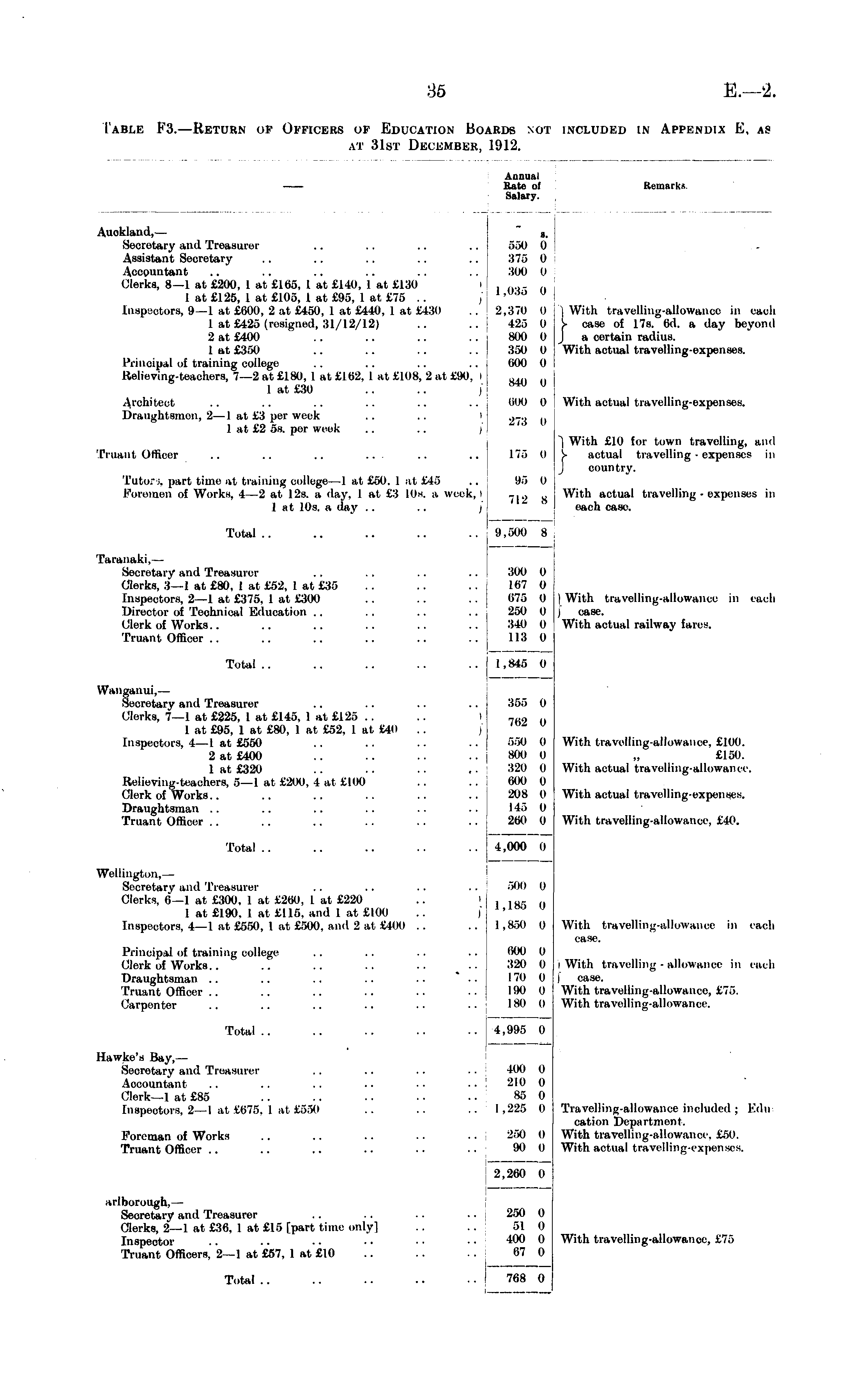 Annual Kate of Salary. Remarks. Auokland, — ». Secretary and Treasurer .. .. .. .. 550 0 Assistant Secretary .. .. .. .. .. 375 0 Accountant .. .. .. .. .. 300 0 Clerks, 8—1 at £200, 1 at £165, 1 at £140, 1 at £130 I . 1 at £125, 1 at £105, 1 at £9.7. I at £75 .. , ' "' Inspectors, 9—1 at £600, 2 at £450, I at £440, 1 at £430 .. 2,370 0 1 at £425 (resigned, 31/12/12) .. 425 0 2 at £400 .. .. .. .. 800 0 1 at £3170 .. .. .. .. 3.70 0 Principal of training college .. .. .. .. 000 (I Relieving-teachers, 7—2 at £180, I at £162, 1 at £108, 2 at £90, i I at C3( l .. .. j ) With travelling-allowance in each Y case of 17s. 6d. a day beyond J a certain radius. With actual travelling-expenses. Architect .. .. .. .. .. .. 600 0 Draughtsmen, 2 —1 at £3 per week .. .. I .,—i a 1 at £2 5s. per week .. .. )' With actual travelling-expenses. Truant Olticer .. .. .. ... .. .. 17.7 (I ~) With £10 for town travelling, and }■ actual travelling - expenses in J country. Tutor;, part time at training college—1 at £50. I at £4.7 .. 95 0 Foremen of Works, 4—2 at 12s. a day, 1 at £3 10s. a week,| -.., „ 1 at 10s. a day .. .. j With actual travelling - expenses in each case. Total.. .. .. .. .. 9,500 8 Taranaki, — Secretary and Treasurer .. .. .. .. 300 0 Clerks, 3—1 at £80, 1 at £52, I at £35 .. .. .. 107 0 Inspectors, 2—1 at £375. I at £300 .. .. .. 67.7 0 Director of Technical Education .. .. .. .. 250 0 Clerk of Works.. .. .. .. .. .. 340 0 Truant Officer .. .. .. .. .. .. 113 0 I With travelling-allowance in each / case. With actual railway fares. Total .. .. .. .. .. 1,845 0 Wanganui,— Secretary and Treasurer .. .. .. .. 35.7 0 Clerks, 7—1 at £225, 1 at £145, 1 at £125 .. .. ' 7H2 o 1 at £95, 1 at £80, 1 at £52, 1 at £40 .. j Inspectors, 4—1 at £550 .. .. .. 5:70 0 2 at £400 .. .. .. .. 800 0 1 at £320 .. .. .. 320 0 Relieving-teachers, 5—1 at £200, 4 at £100 .. .. 600 0 Clerk of Works.. .. .. .. .. .. 208 0 Draughtsman .. .. .. .. .. .. 146 o Truant Officer .. .. .. .. .. .. 260 0 With travelling-allowance. £100. £1.70. With actual travelling-allowance. With actual travelling-expenses. Total .. .. .. .. 4,000 0 With travelling-allowance, £40. Wellington,— Secretary and Treasurer .. .. .. .. 500 0 Clerks, 6—1 at £300. I at £260, I at £220 .. ' 1 18" o 1 at £190. 1 at £115. and 1 at £100 .. ]" ' Inspectors, 4— 1 at £550, 1 at £500. and 2 at £400 .. .. 1,8.70 (I With travelling-allowance in each case. Principal of training oollege .. .. .. .. 600 0 Clerk of Works.. .. .. .. .. .. 320 (I Draughtsman .. .. .. .. .. .. 170 o Truant Officer .. .. .. .. .. .. 190 0 Carpenter .. .. .. .. .. .. 180 0 i With travelling - allowance in each i case. With travelling-allowance, £75. With travelling-allowance. Total .. .. .. .. .. 4,995 0 Hawke's Bay,— Secretary and Treasurer .. .. .. .. 400 o Aocountant .. .. .. .. •• ■• 210 0 Clerk—1 at £85 .. . . .. • • 85 0 [nspeotors, 2—1 at £675,1 at £560 .. .. .. 1,225 0 Foreman of Works .. .. .. ■ • .. 260 0 Truant Officer .. .. .. .. .. 90 0 Travelling-allowance included ; Edu cation Department. With travelling-allowance. £50. With actual travelling-expenses. 2,260 0 arlborough,— Secretary and Treasurer .. .. .. 2.70 0 Clerks, 2—1 at £36,1 at £15 [part time only] .. .71 0 Inspector .. .. .. • • • • ■ • 400 0 Truant Officers. 2—1 at £57, 1 at £10 .. .. 67 0 Total 768 0 With travelling-allowance, £7,7