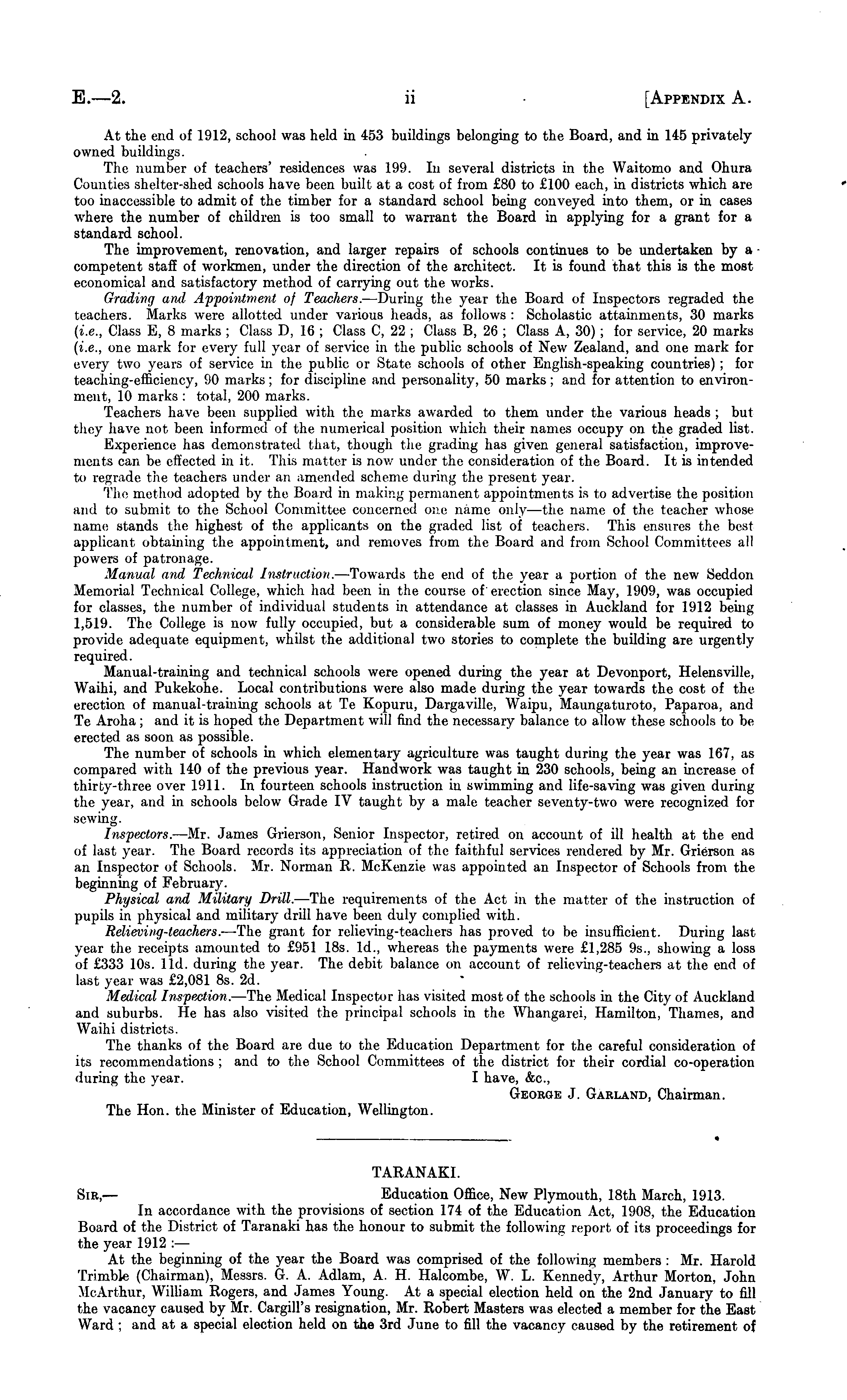 • TARANAKI. Sir, — Education Office, New Plymouth, 18th March, 1913. In accordance with the provisions of section 174 of the Education Act, 1908, the Education Board of the District of Taranaki has the honour to submit the following report of its proceedings for the year 1912 : — At the beginning of the year the Board was comprised of the following members : Mr. Harold Trimble (Chairman), Messrs. G. A. Adlam, A. H. Halcombe, W. L. Kennedy, Arthur Morton, John McArthur, William Rogers, and James Young. At a special election held on the 2nd January to fill the vacancy caused by Mr. Cargill's resignation, Mr. Robert Masters was elected a member for the East Ward ; and at a special election held on the 3rd June to fill the vacancy caused by the retirement of