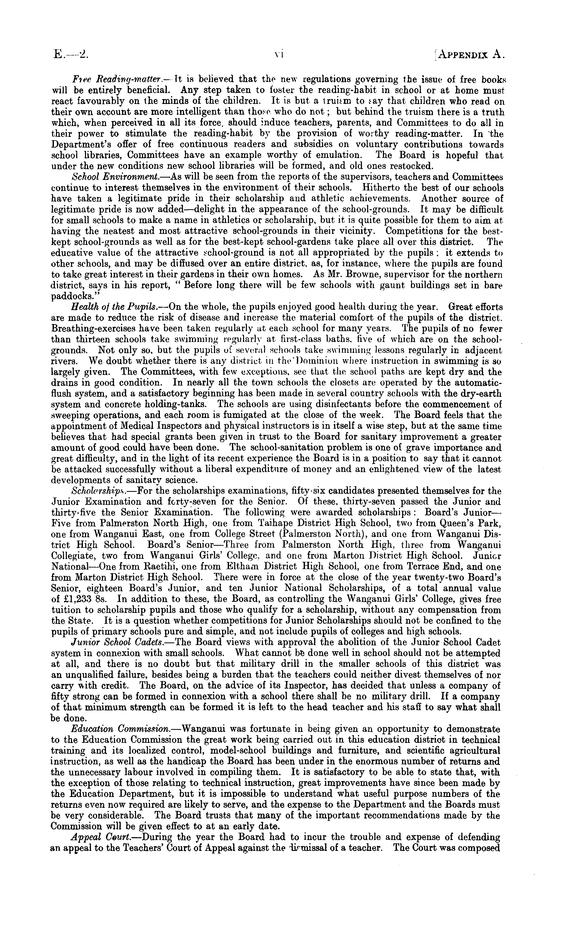 Fiee Reading-matter.— It is believed that the new regulations governing the issue of free books will be entirely beneficial. Any step taken to foster the reading-habit in school or at home must react favourably on the minds of the children. It is but a truism to my that children who read on their own account are more intelligent than those who do not; but behind the truism there is a truth which, when perceived in all its force, should induce teachers, parents, and Committees to do all in their power to stimulate the reading-habit by the provision of worthy reading-matter. In the Department's offer of free continuous readers and subsidies on voluntary contributions towards school libraries, Committees have an example worthy of emulation. The Board is hopeful that under the new conditions new school libraries will be formed, and old ones restocked. School Environment. —As will be seen from the reports of the supervisors, teachers and Committees continue to interest themselves in the environment of their schools. Hitherto the best of our schools have taken a legitimate pride in their scholarship and athletic achievements. Another source of legitimate pride is now added—delight in the appearance of the school-grounds. It may be difficult for small schools to make a name in athletics or scholarship, but it is quite possible for them to aim at having the neatest and most attractive school-grounds in their vicinity. Competitions for the bestkept school-grounds as well as for the best-kept school-gardens take place all over this district. The educative value of the attractive school-ground is not all appropriated by the pupils; it extends to other schools, and may be diffused over an entire district, as, for instance, where the pupils are found to take great interest in their gardens in their own homes. As Mr. Browne, supervisor for the northern district, says in his report, " Before long there will be few schools with gaunt buildings set in bare paddocks." Health of the Pupils. —On the whole, the pupils enjoyed good health during the year. Great efforts are made to reduce the risk of disease and increase the material comfort of the pupils of the district. Breathing-exercises have been taken regularly at each school for many years. The pupils of no fewer than thirteen schools take swimming regularly at first of which are on the schoolgrounds. Not only so, but the pupils of several schools take swimming lessons regularly in adjacent rivers. We doubt whether there is any district in t he' Dominion when- instruction in swimming is so largely given. The Committees, with few exceptii lat the school paths are kept dry and the drains in good condition. In nearly all the town schools the closets are operated by the automaticflush system, and a satisfactory beginning has been made in several country schools with the dry-earth system and concrete holding-tanks. The schools are using disinfectants before the commencement of sweeping operations, and each room is fumigated at the close of the week. The Board feels that the appointment of Medical Inspectors and physical instructors is in itself a wise step, but at the same time believes that had special grants been given in trust to the Board for sanitary improvement a greater amount of good could have been done. The school-sanitation problem is one of grave importance and great difficulty, and in the light of its recent experience the Board is in a position to say that it cannot be attacked successfully without a liberal expenditure of money and an enlightened view of the latest developments of sanitary science. Scholarships. —For the scholarships examinations, fifty six candidates presented themselves for the Junior Examination and forty-seven for the Senior. Of these, thirty-seven passed the Junior and thirty-five the Senior Examination. The following were awarded scholarships : Board's Junior— Five from Palmerston North High, one from Taihape District High School, two from Queen's Park, one from Wanganui East, one from College Street (Palmerston North), and one from Wanganui District High School. Board's Senior—Three from Palmerston North High, three from Wanganui Collegiate, two from Wanganui Girls' College, and one from Marton District High School. Junior National —One from Raetihi, one from Eltham District High School, one from Terrace End, and one from Marton District High School. There were in force at the close of the year twenty-two Board's Senior, eighteen Board's Junior, and ten Junior National Scholarships, of a total annual value of £1,233 Bs. In addition to these, the Board, as controlling the Wanganui Girls' College, gives free tuition to scholarship pupils and those who qualify for a scholarship, without any compensation from the State. It is a question whether competitions for Junior Scholarships should not be confined to the pupils of primary schools pure and simple, and not include pupils of colleges and high schools. Junior School Cadets. —The Board views with approval the abolition of the Junior School Cadet system in connexion with small schools. What cannot be done well in school should not be attempted at all, and there is no doubt but that military drill in the smaller schools of this district was an unqualified failure, besides being a burden that the teachers could neither divest themselves of nor carry' with credit. The Board, on the advice of its Inspector, has decided that unless a company of fifty strong can be formed in connexion with a school there shall be no military drill. If a company of that minimum strength can be formed it is left to the head teacher and his staff to say what shall be done. Education Commission. —Wanganui was fortunate in being given an opportunity to demonstrate to the Education Commission the great work being carried out in this education district in technical training and its localized control, model-school buildings and furniture, and scientific agricultural instruction, as w