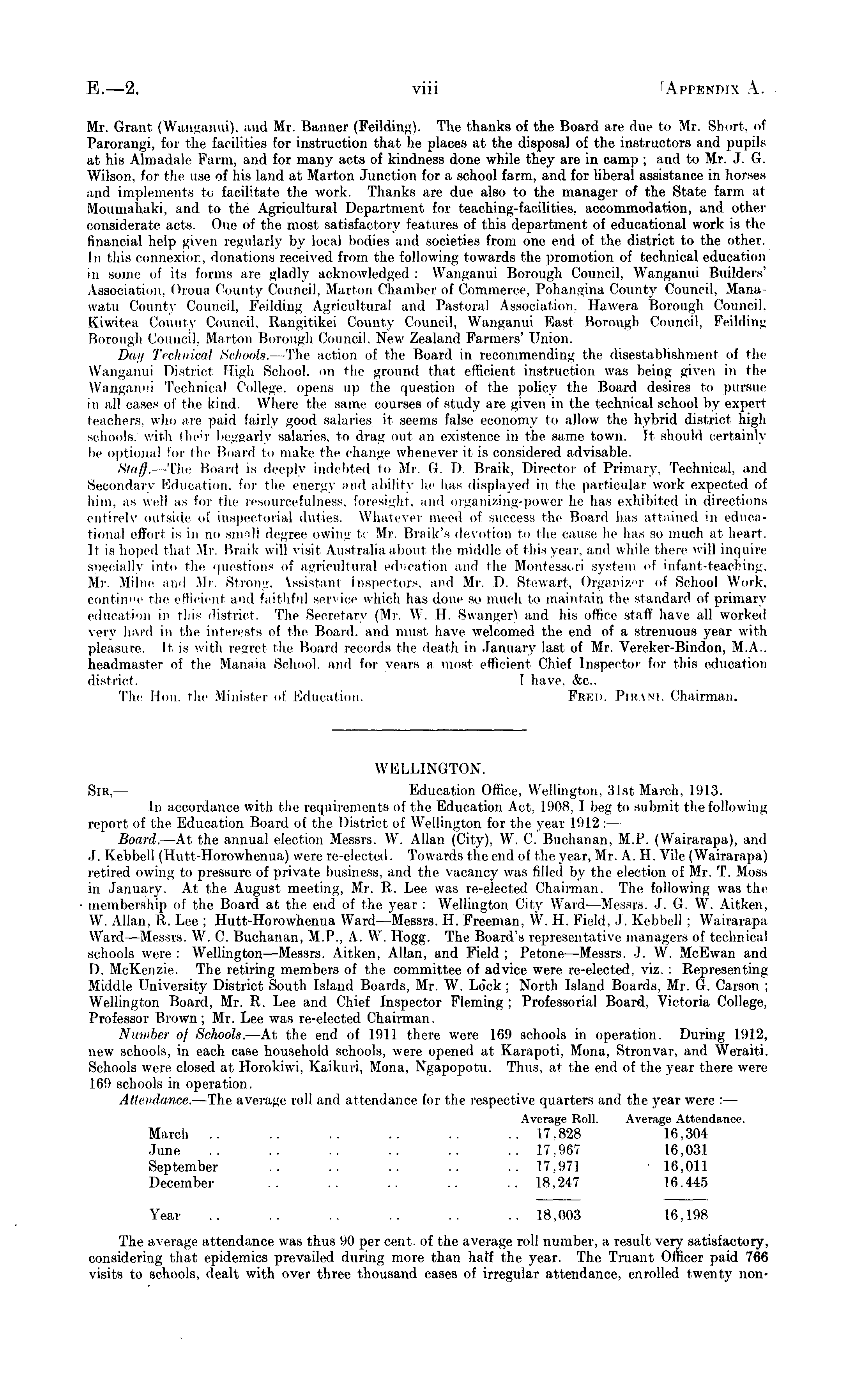 WELLINGTON. Sir,— Education Office, Wellington. 31st March. 1913. In accordance with the requirements of the Education Act, 1008, I beg to submit the following report of the Education Board of the District of Wellington for the year 1912 : — Board. —At the annual election Messrs. W. Allan (City), W. C. Buchanan, M.P. (Wairarapa), and J. Kebbell (Hutt-Horowhenua) were re-elected. Towards the end of the year, Mr. A. H. Vile (Wairarapa) retired owing to pressure of private business, and the vacancy was filled by the election of Mr. T. Moss in January. At the August meeting, Mr. R. Lee was re-elected Chairman. The following was the membership of the Board at the end of the year : Wellington City Ward —Messrs. J. G. W. Ait ken, W. Allan, R. Lee ; Hutt-Horowhenua Ward —Messrs. H. Freeman, W. H. Field, J. Kebbell ; Wairarapa Ward —Messrs. W. C. Buchanan. M.l.. A. W. Hogg. The Board's representative managers of technical schools were : Wellington —Messrs. Aitken, Allan, and Field ; Petone —Messrs. J. W. McEwan and D. McKenzie. The retiring members of the committee of advice were re-elected, viz. : Representing Middle University District South Island Boards, Mr. W. Lock ; North Island Boards, Mr. G. Carson : Wellington Board, Mr. R. Lee and Chief Inspector Fleming ; Professorial Board, Victoria College, Professor Brown; Mr. Lee was re-elected Chairman. Number of Schools. —At the end of 1911 there were 169 schools in operation. During 1912, new schools, in each case household schools, were opened at Karapoti, Mona. Stronvar, and Weraiti. Schools were closed at Horokiwi, Kaikuri, Mona, Ngapopotu. Thus, at the end of the year there were 169 schools in operation. Attendance. —The average roll and attendance for the respective quarters and the year were : — Average Roll. Average Attendance, March .. .. .. .. 17.828 16.304 June .. .. .. .. 17.967 16,031 September .. .. .. 17.971 16,011 December .. .. .. 18.247 16.445 Year .. .. .. .. 18,003 16.198 The average attendance was thus 90 per cent, of the average roll number, a result very satisfactory, considering that epidemics prevailed during more than half the year. The Truant Officer paid 766 visits to schools, dealt with over three thousand cases of irregular attendance, enrolled twenty non-