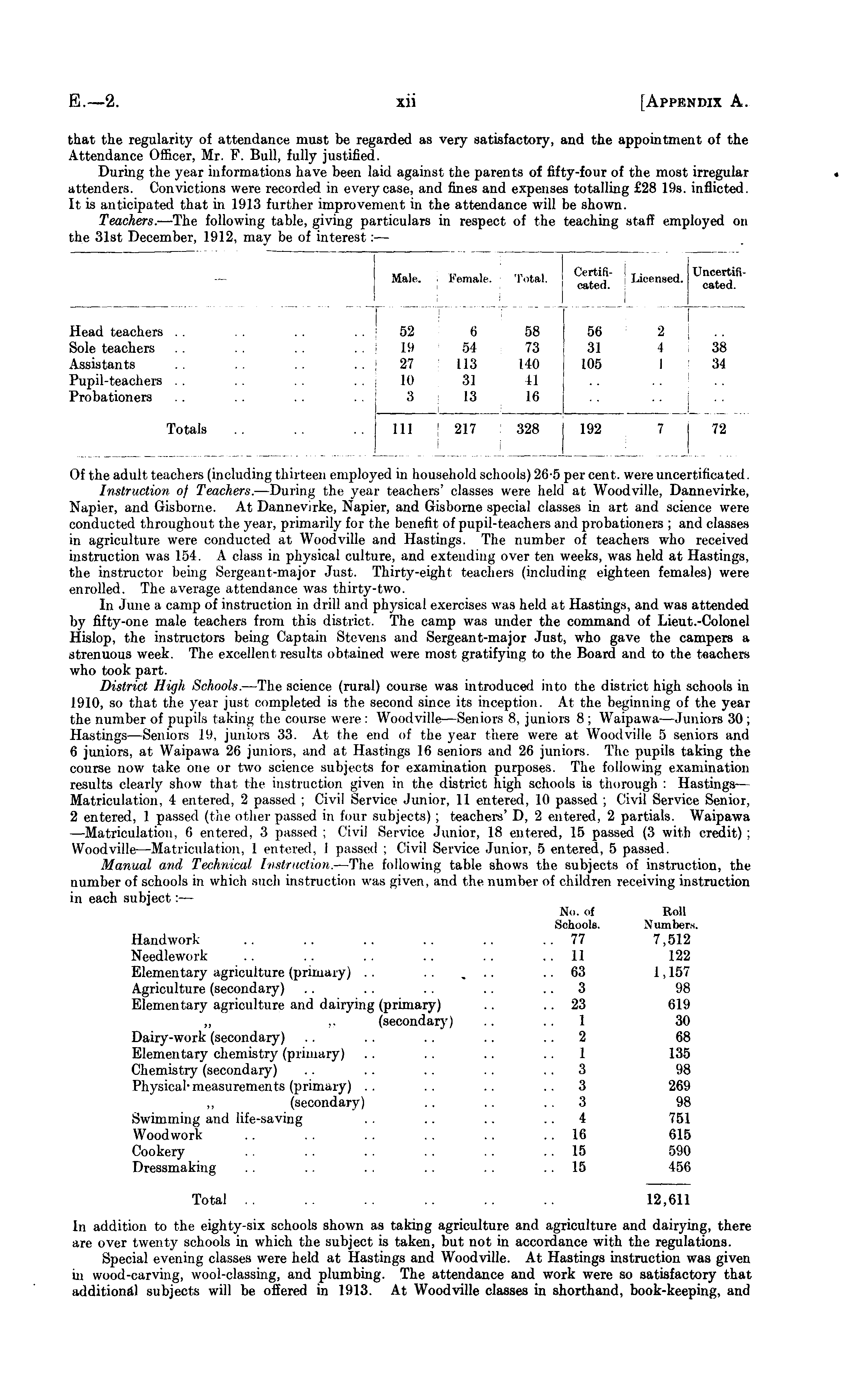 that the regularity of attendance must be regarded as very satisfactory, and the appointment of the Attendance Officer, Mr. F. Bull, fully justified. During the year informations have been laid against the parents of fifty-four of the most irregular attenders. Convictions were recorded in every case, and fines and expenses totalling £28 19s. inflicted. It is anticipated that in 1913 further improvement in the attendance will be shown. Teachers. —The following table, giving particulars in respect of the teaching staff employed on the 31st December, 1912, may be of interest:—