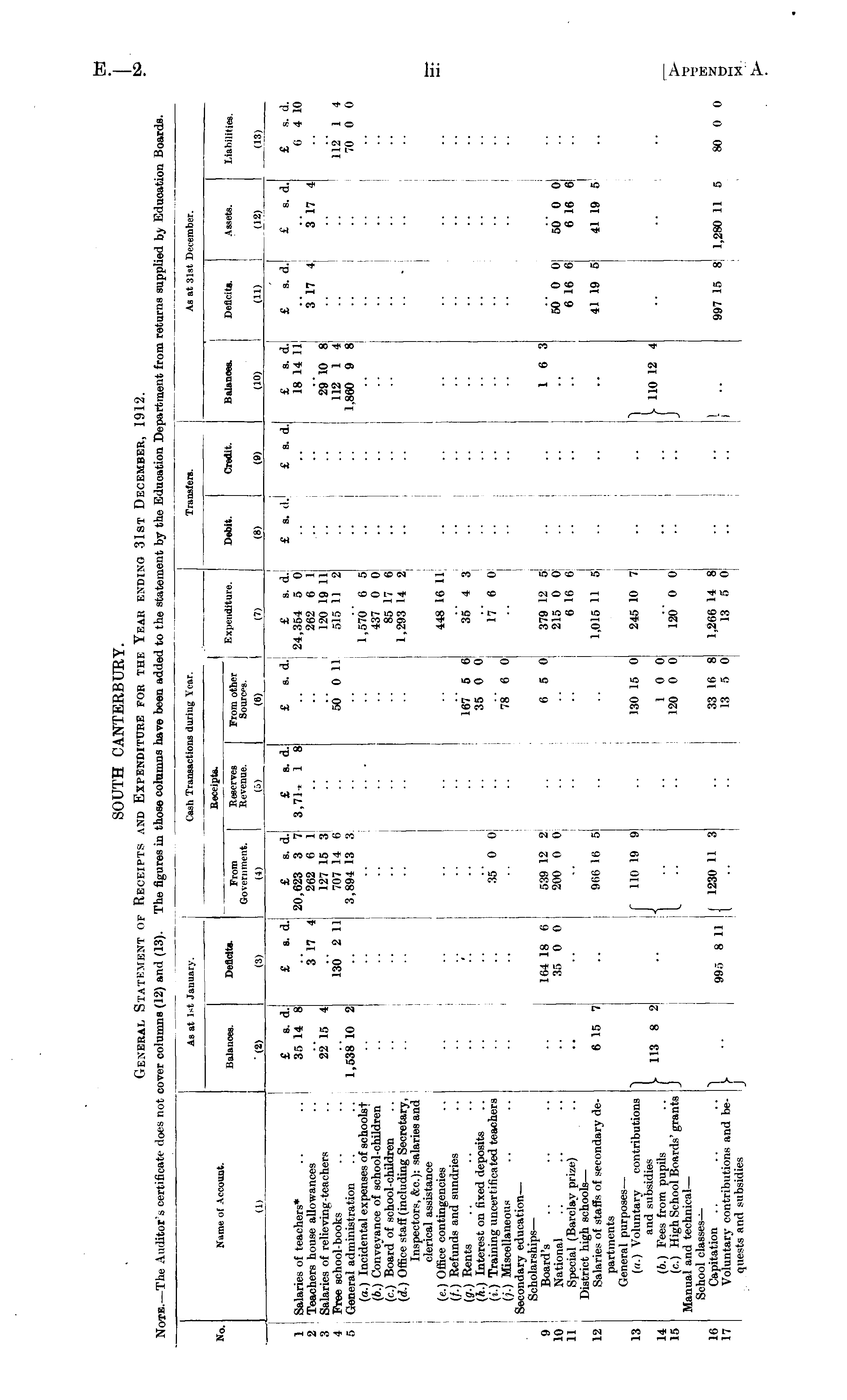 Note. —The Auditor's certificate does not cover col lumne ( am igures in tl iose col lunins .ve ten a< tot: ie statement >y Ci Lucation tepartment :rom returns suppl luoation oar< Name of Account. As at Balances. As at 1st January. From Government. (4) Cash Transactions during Yr:ir. Receipts. Reserves Kcvenue. (5) Receipts. I From other j Expenditure. Source. (6) I : Transfers. Balances. (10) Deficits. (U) As at 31st December. Assets. (12) No. Deficits. Debit. Credit. Liabilities. (1) (2) (3) (8) (9) (13) 1 Salaries of teachers* 2 Teachers house allowances 3 Salaries of relieving-teaohers 4 Free school-books f> General administration («.) Incidental expenses of schoolst (6.) Conveyance of school-children (c.) Board of school-children (d.) Office staff (including Secretary, Inspectors, &c): salaries and clerical assistance (e.) Office contingencies (/.) Refunds and sundries (g.) Rents (h.) Interest on fixed deposits (».) Training uncertificated teachers (;.) Miscellaneous Secondary education — Scholarships — 9 Board's 10 National 11 Special (Barclay prize) District high schools — 12 Salaries of staffs of secondary departments General purposes — 13 (n.) Voluntary contributions and subsidies 14 (6.) Fees from pupils 15 (c.) High School Boards' grants Manual and technical — School claw 16 Capitation 17 Voluntary contributions and bequests and subsidies £ s. d. 35 14 8 22 15 4 1,538 10 2 •• •• •• £ a. d. 3 17 4 130 2 11 ■ • •• •• £ s. d.| £ s. d. 20,623 3 7 3,71, 1 8 262 6 1 127 15 3 707 14 6 3,894 13 3 .. . 35 0 0 £ s. d. 50 0 11 167 5 6 35 0 0 78 6 a £ s. d. 24,354 5 0 262 6 1 120 19 11 515 11 2 L.670 6 5 437 0 0 85 17 6 1,293 14 2 448 Iβ 11 35 4 3 17 6 0 £ s. d. £ s. d. £ s. d. 18 14 11 29 10 8 112 1 4 1,860 9 8 .. £ s. <1. 3 17 4 ■■ £ s. d. 3 17 4 •• •• £ s. d. (i 4 10 112' 1 4 70 0 0 164 18 6 35 0 0 539 12 2 200 0 0 6 5 0 379 12 5 215 0 0 6 16 6 1,015 11 5 245 10 7 120 0 0 1.266 14 8 13 5 0 1 6 3 50 0 0 6 16 6 41 19 5 50 0 0! 6 Iβ e| 41 19 6 • I 6 15 7 9(i(i 16 5 I 113 8 2 f 110 19 9 130 15 0 1 0 0 120 0 0 1 V 110 12 4 } ■' 995 8 11 ( 1230 11 3 33 Iβ 8 13 5 0 I I 997 15 8 1,280 11 5 80 0 C