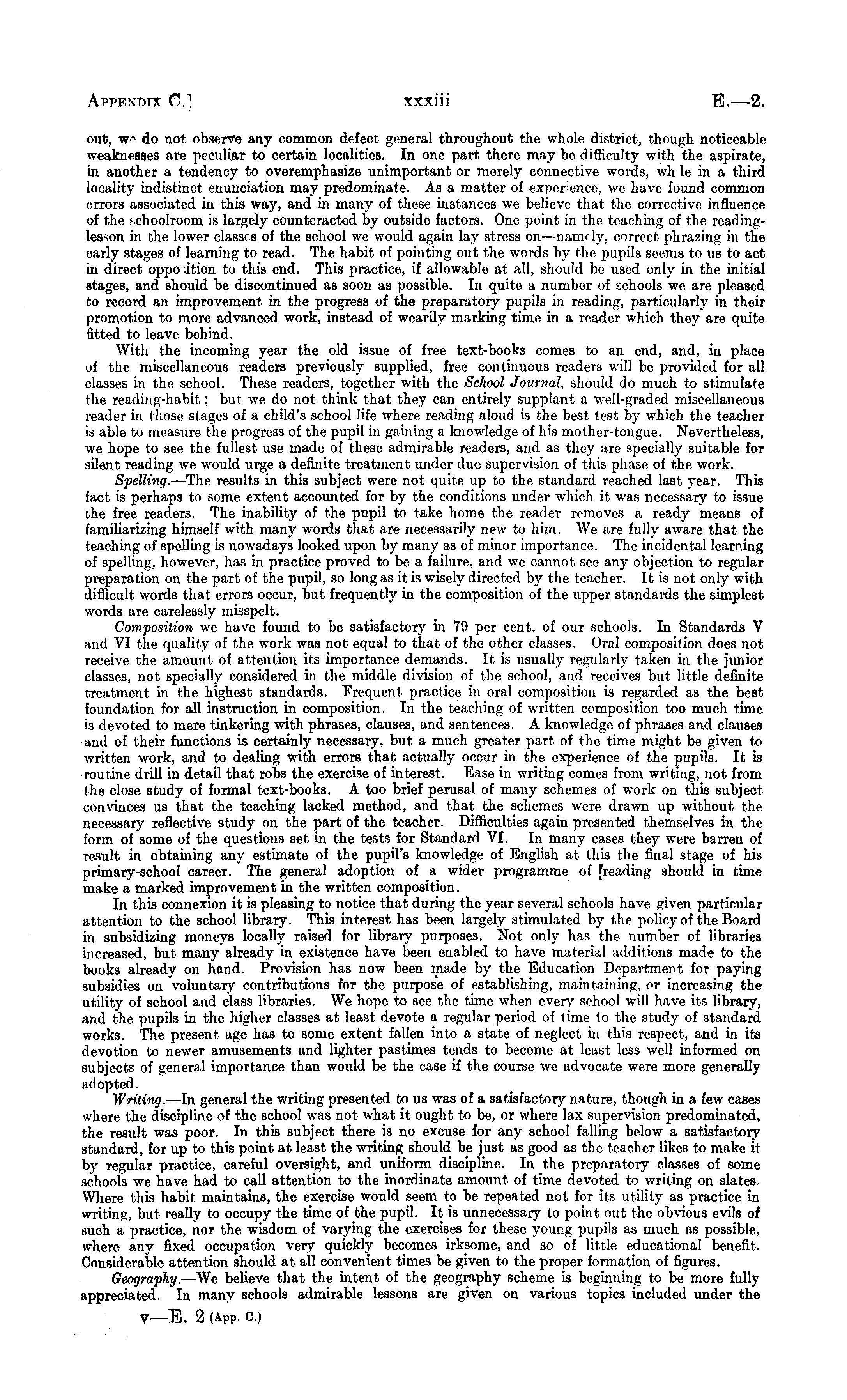 out, W'-* do not observe any common defect general throughout the whole district, though noticeable weaknesses are peculiar to certain localities. In one part there may be difficulty with the aspirate, in another a tendency to overemphasize unimportant or merely connective words, wh le in a third locality indistinct enunciation may predominate. As a matter of experience, we have found common errors associated in this way, and in many of these instances we believe that the corrective influence of the schoolroom is largely counteracted by outside factors. One point in the teaching of the readinglesson in the lower classes of the school we would again lay stress on —namely, correct phrazing in the early stages of learning to read. The habit of pointing out the words by the pupils seems to us to act in direct oppo ition to this end. This practice, if allowable at all, should be used only in the initial stages, and should be discontinued as soon as possible. In quite a number of schools we are pleased to record an improvement in the progress of the preparatory pupils in reading, particularly in their promotion to more advanced work, instead of wearily marking time in a reader which they are quite fitted to leave behind. With the incoming year the old issue of free text-books comes to an end, and, in place of the miscellaneous readers previously supplied, free continuous readers will be provided for all classes in the school. These readers, together with the School Journal, should do much to stimulate the reading-habit; but we do not think that they can entirely supplant a well-graded miscellaneous reader in those stages of a child's school life where reading aloud is the best test by which the teacher is able to measure the progress of the pupil in gaining a knowledge of his mother-tongue. Nevertheless, we hope to see the fullest use made of these admirable readers, and as they are specially suitable for silent reading we would urge a definite treatment under due supervision of this phase of the work. Spelling. —The results in this subject were not quite up to the standard reached last year. This fact is perhaps to some extent accounted for by the conditions under which it was necessary to issue the free readers. The inability of the pupil to take home the reader removes a ready means of familiarizing himself with many words that are necessarily new to him. We are fully aware that the teaching of spelling is nowadays looked upon by many as of minor importance. The incidental learning of spelling, however, has in practice proved to be a failure, and we cannot see any objection to regular preparation on the part of the pupil, so long as it is wisely directed by the teacher. It is not only with difficult words that errors occur, but frequently in the composition of the upper standards the simplest words are carelessly misspelt. Composition we have found to be satisfactory in 79 per cent, of our schools. In Standards V and VI the quality of the work was not equal to that of the other classes. Oral composition does not receive the amount of attention its importance demands. It is usually regularly taken in the junior classes, not specially considered in the middle division of the school, and receives but little definite treatment in the highest standards. Frequent practice in oral composition is regarded as the best foundation for all instruction in composition. In the teaching of written composition too much time is devoted to mere tinkering with phrases, clauses, and sentences. A knowledge of phrases and clauses and of their functions is certainly necessary, but a much greater part of the time might be given to written work, and to dealing with errors that actually occur in the experience of the pupils. It is routine drill in detail that robs the exercise of interest. Ease in writing comes from writing, not from the close study of formal text-books. A too brief perusal of many schemes of work on this subject convinces us that the teaching lacked method, and that the schemes were drawn up without the necessary reflective study on the part of the teacher. Difficulties again presented themselves in the form of some of the questions set in the tests for Standard VI. In many cases they were barren of result in obtaining any estimate of the pupil's knowledge of English at this the final stage of his primary-school career. The general adoption of a wider programme of [reading should in time make a marked improvement in the written composition. In this connexion it is pleasing to notice that during the year several schools have given particular attention to the school library. This interest has been largely stimulated by the policy of the Board in subsidizing moneys locally raised for library purposes. Not only has the number of libraries increased, but many already in existence have been enabled to have material additions made to the books already on hand. Provision has now been made by the Education Department for paying subsidies on voluntary contributions for the purpose of establishing, maintaining, or increasing the utility of school and class libraries. We hope to see the time when every school will have its library, and the in the higher classes at least devote a regular period of time to the study of standard works. The present age has to some extent fallen into a state of neglect in this respect, and in its devotion to newer amusements and lighter pastimes tends to become at least less well informed on subjects of general importance than would be the case if the course we advocate were more generally adopted. Writing. —In general the writing presented to us was of a satisfactory nature, though in a few cases where the discipline of the school was not what it ought to be, or where lax supervision predominated, the result was poor. In this subject there is no excuse for any school falling below a satisfactory standard, for up to this point at least the writing should be just as good as the
