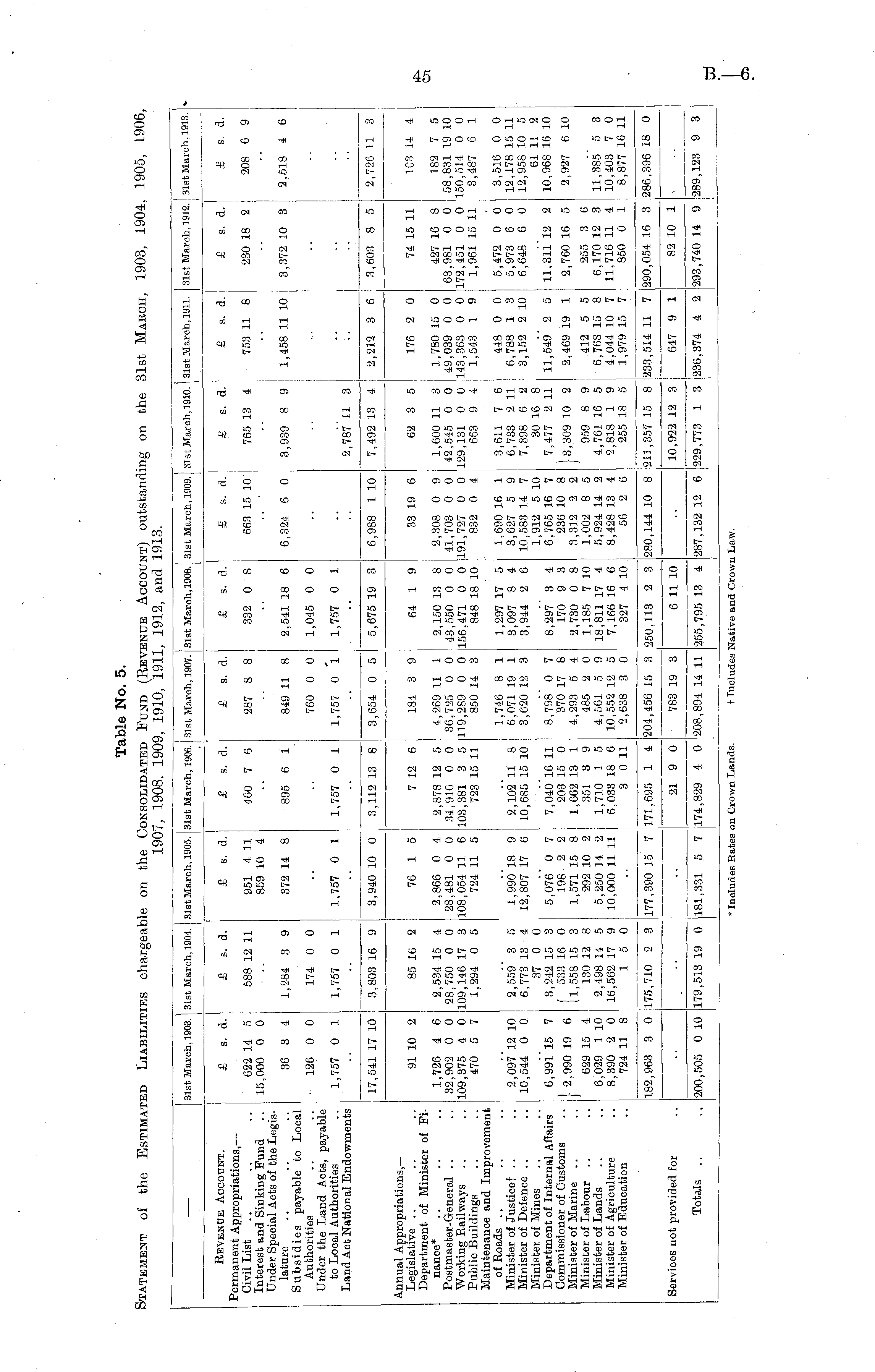 Table No. 5. Statement of the Estimated Liabilities chargeable on the Consolidated Fund (Revenue Account) outstanding on the 31st March, 1903, 1904, 1905, 1906, 1907, 1908, 1909, 1910, 1911, 1912, and 1913.