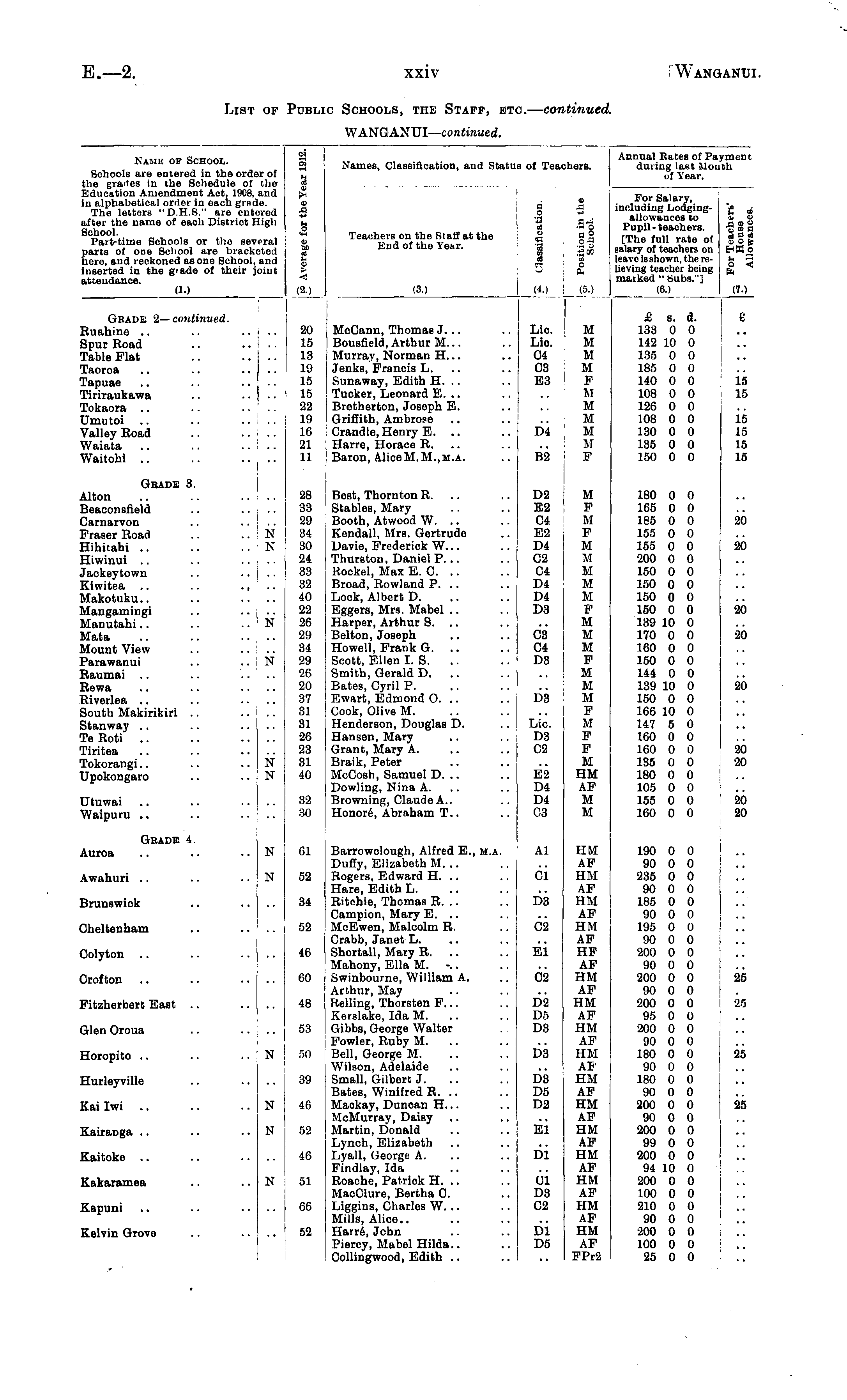 Name of School. Schools are entered in the orde the gra'ies in the Schedule of Education Amendment Act, 1908, i in alphabetical order in each grad The letters "D.H.S." are ente after the name of each District H School. Part-time Schools or the sev, parts ot one School are braokc here, and reckoned as one School, inserted in the grade of their j< attendance. ?r of the and le. ered 4igh <e 9 r" 9 A *j S ■— 01 ci: t. 9 < Names, Classification, and Status of TeacherB. 9 a a o t, d -to Teachers on the St aif at the .- a ° Mud of the Year. -a -2li os S3 rt o J to (3.) I (4.) (5.) For Salary, including Lodging. allowances to Pupil-teachers. [The full rate of salary of teachers on leave Is shown, the relievlng teacher being marked " Subs."] (60 Annual Bates of Pa; during last .Mow of Year. yment ith "e ,£ 9 9 T 9 9 O 9 B d a e HX o & « to eral ete 1 and oint (1.) (70 Grade 1—continued. ituahine spur Road Pable Flat Paoroa Papuae Piriraukawa Pokaora Jmutoi Galley Road Vaiata Waitohi 20 15 13 11) 15 15 ■22 10 10 21 11 McCann, Thomas J. .. Bousfield, Arthur M. Murray, Norman H... Jenks, Francis L. .. Snnaway, Edith H. .. Tucker, Leonard E. .. Bretherton, Joseph E. Griffith, Ambrose Crandle, Henry E. Harre, Horace R. .. Baron, AliceM.M.,m.a. Lie. Lie. C4 03 E3 M M M M F M M M M M F £ s. d. 133 0 0 142 10 0 135 0 0 185 0 0 140 0 0 108 0 0 126 0 0 108 0 0 130 0 0 135 0 0 150 0 0 E 15 15 D4 15 15 15 15 B2 Grade 3. 28 33 29 34 30 24 33 S3 10 22 26 29 34 29 26 20 37 31 31 20 23 31 40 Best, Thornton R. .. Stables, Mary Booth, Atwood W. .. Kendall, Mrs. Gertrudo Davie, Frederick W... Thurston, Daniel P. .. Rockel, Max E. C. .. Broad, Rowland P. .. Lock, Albert D. Eggers, Mrs. Mabel Harper, Arthur S. .. Belton, Joseph Howell, Frank G. .. Scott, Ellen I. S. Smith, Gerald D. Bates, Cyril P. Ewart, Edmond 0. .. Cook, Olive M. Henderson, Douglas D. Hansen, Mary Grant, Mary A. Braik, Peter McCosh, Samuel D. .. Dowling, Nina A. Browning, Claude A.. Honore, Abraham T.. D2 E2 C4 E2 D4 C2 04 D4 D4 D3 M F M F M M M M M F M M M F M M M F M F F M HM AF M M 180 0 0 165 0 0 ies 0 0 155 0 0 155 0 0 200 0 0 150 0 0 150 0 0 150 0 0 150 0 0 139 10 0 170 0 0 160 0 0 150 0 0 144 0 0 139 10 0 150 0 0 166 10 0 147 5 0 160 0 0 160 0 0 135 0 0 180 0 0 105 0 0 155 0 0 160 0 0 Llton ?eaconsfield Carnarvon Eraser Road lihitahi .. liwinui ackeytown fiwitea tlakotuku.. ilangamingi ilanutahi data dount View 3 arawanui laumai Jewa liverlea South Makirikiri .. itanway .. Pe Roti Piritea Pokorangi.. Jpokongaro N N N 03 C4 D3 20 -20 ■20 -20 N D3 20 Lie. D3 C2 N N 20 20 Jtuwai (Vaipuru .. 32 30 E2 D4 D4 C3 20 20 Grade 4. 61 Barrowclough, Alfred E., m.a. Duffy, Elizabeth M. Rogers, Edward H. .. Hare, Edith L. Ritchie, Thomas R. .. Campion, Mary E. .. McEwen, Malcolm R. Crabb, Janet L. Shortall, Mary R. Mahony, Ella M. Swinbourne, William A. Arthur, May Helling, Thorsten F... Kerslake, Ida M. Gibbs, George Walter Fowler, Ruby M. Bell, George M. Wilson, Adelaide Small, Gilbert J. Bates, Winifred R. .. Maokay, Duncan H... McMurray, Daisy Martin, Donald Lynch, Elizabeth Lyall, George A. Findlay, Ida Roache, Patrick H. .. MacClure, Bertha C. Liggins, Charles W. .. Mills, Alice.. Harre, Jcbn Piercy, Mabel Hilda.. Collingwood, Edith .. Al HM AF HM AF HM AF HM AF HF AF HM AF HM AF HM AF HM AF HM AF HM AF HM AF HM AF HM AF HM AF HM AF FPr2 190 0 0 90 0 0 235 0 0 90 0 0 185 0 0 90 0 0 195 0 0 90 0 0 200 0 0 90 0 0 200 0 0 90 0 0 200 0 0 95 0 0 200 0 0 90 0 0 180 0 0 90 0 0 180 0 0 90 0 0 200 0 0 90 0 0 200 0 0 99 0 0 200 0 0 94 10 0 200 0 0 100 0 0 210 0 0 90 0 0 200 0 0 100 0 0 25 0 0 Luroa N Lwahnri .. N 52 ci Jrunswick 84 D3 Iheltenham 52 C2 Jolyton .. 40 iii !rof ton 00 02 28 ritzherbert East .. ■IS D2 D5 D3 26 Jlen Oroua 5:1 loropito N 50 D3 25 lurleyville 39 D3 D5 D2 fai Iwi N 46 •25 kairanga .. N 52 Ei Caitoke 10 Di iakaramea N 51 01 D3 02 Capuni 66 Selvin Grove 52 r>i D5