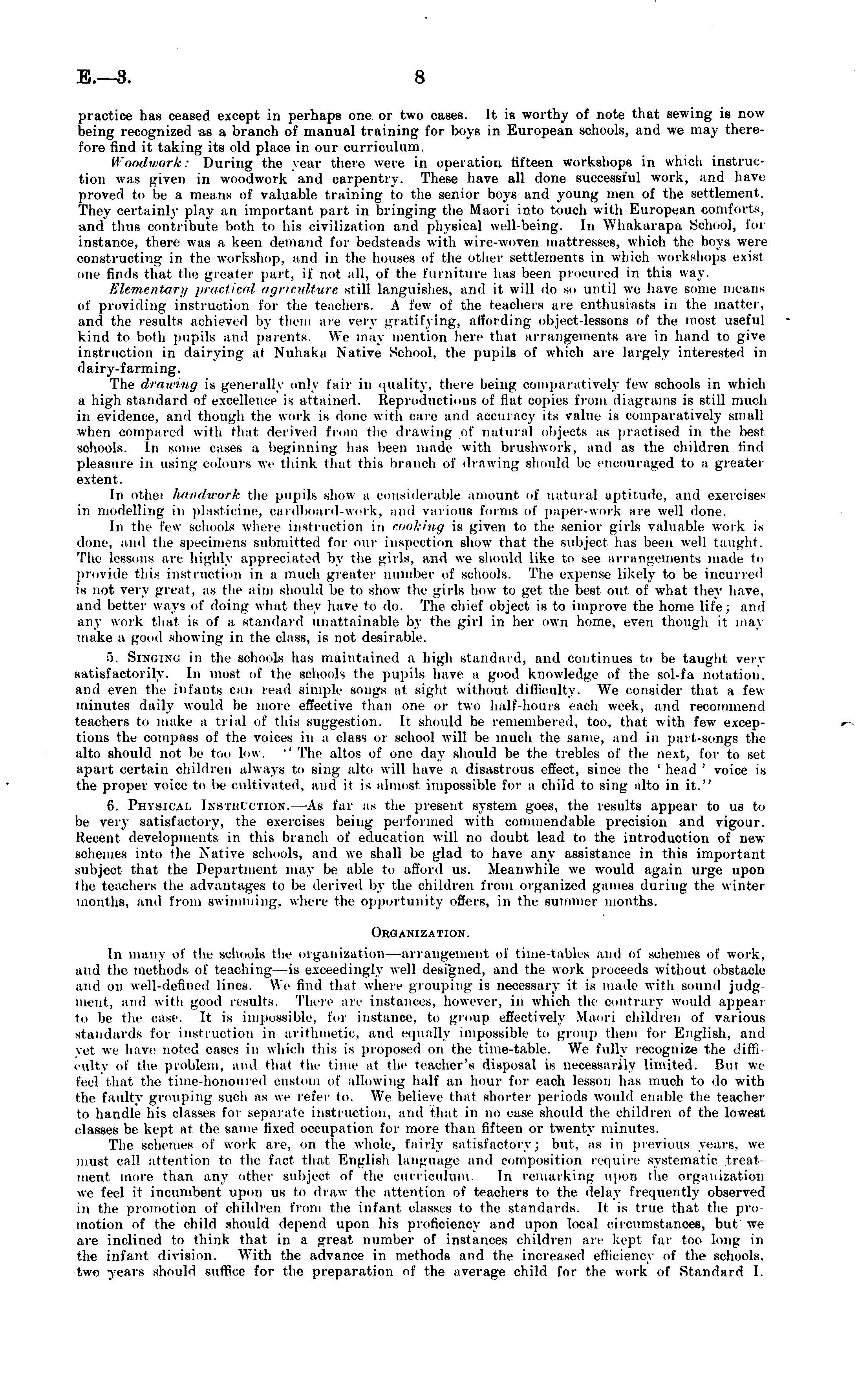 practice has ceased except in perhaps one or two cases. It is worthy of note that sewing is now being recognized as a branch of manual training for boys in European schools, and we may therefore find it taking its old place in our curriculum. Woodwork: During the year there were in operation fifteen workshops in which instruction was given in woodwork and carpentry. These have all done successful work, and have proved to be a means of valuable training to the senior boys and young men of the settlement. They certainly play an important part in bringing the Maori into touch with European comforts, anil thus contribute both to his civilization and physical well-being. In Whakarapa School, for instance, there was a keen demand for bedsteads with wire-woven mattresses, which the boys were constructing in the workshop, and in the houses of the other settlements in which workshops exisi one finds that the greater part, if not all, of the furniture has been procured in this way. Elementary practical agriculture still languishes, and it will do m> until we have some means of providing instruction for the teachers. A few of the teachers are enthusiasts in the matter, and the results achieved by them are very gratifying, affording object-lessons of the most useful kind to both pupils and parents. We may mention here that arrangements are in hand to give instruction in dairying at Nuhaka Native School, the pupils of which are largely interested in dairy-farming. The drawing is generally only lair in quality, there being comparatively few schools in which a high standard of excellence is attained. Reproductions of Hat copies from diagrams is still much in evidence, and though the work is done with care and accuracy its value is comparatively small when compared with that derived from the drawing of natural objects as practised in the best schools. In some cases a beginning has been made with briishwork. and as the children find pleasure in using colours we think that this brunch of drawing should be encouraged to a greater extent. In othei handwork the pupils show a considerable amount of natural aptitude, and exercises in modelling in plasticine, canllmard-werk. and various forms of paper-work are well done. In the i'cu schools where instruction in cooking is given to the senior girls valuable work is done, and the specimens submitted for our inspection show that the subject has been well taught. The lessons are highly appreciated by the girls, and we should like to see arrangements made to provide this instruction in a much greater number of schools. The expense likely to be incurred is not very great, as the aim should be to show the girls how to get the best out of what they have, and better ways of doing what they have to do. The chief object is to improve the home life; and any work that is of a standard unattainable by the girl in her own home, even though it may make a good showing in the class, is not desirable. 5. SINOING in the schools has maintained a high standard, and continues to be taught very satisfactorily. In most of the schools the pupils have a good knowledge of the sol-fa notation, and even the infants can read simple songs at sight without difficulty. We consider that a fewminutes daily would be more effective than one or two half-hours each week, and recommend teachers to make a trial of this suggestion. It should be remembered, too, that with few exceptions the compass of the voices in a class or school will be much the same, and in part-songs the alto should not be too low. •' The altos of one day should be the trebles of the next, for to set apart certain children always to sing alto will have a disastrous effect, since the ' head ' voice is the proper voice to be cultivated, and it is almost impossible for a child to sing alto in it." (i. Physical INSTRUCTION. —As far as the present system goes, the results appear to us to be very satisfactory, the exercises being performed with commendable precision and vigour. Recent developments in this branch of education will no doubt lead to the introduction of newschemes into the Native schools, and we shall be glad to have any assistance in this important subject that the Department may be able to afford us. Meanwhile we would again urge upon the teachers the advantages to be derived by the children from organized games during the winter months, and from swimming, where the opportunity offers, in the summer months. Organization. In many of the schools the organization —arrangement of time-tables and of schemes of work, and the methods of teaching—is exceedingly well designed, and the work proceeds without obstacle and on well-defined lines. We find that where grouping is necessary it is made with sound judgment, and with good results. There are instances, however, in which the contrary would appear ti. be tin , case. It is impossible, for instance, to group effectively Maori children of various standards lor instruction in arithmetic, and equally impossible to group them for English, and yet we have noted eases in which this is proposed on the time-table. We fully recognize the difficulty of the problem, and that the time at the teacher's disposal is necessarily limited. But we I'eel that the time-honoured custom of allowing half an hour for each lesson has much to do with the faulty grouping such as we refer to. We believe that shorter periods would enable the teacher to handle his classes for separate instruction, and that in no case should the children of the lowest classes be kept at the same fixed occupation for more than fifteen or twenty minutes. The schemes of work are, on the whole, fairly satisfactory; but, as in previous years, we must call attention to the fact that English language ami composition require systematic treat ment more than any other subject of the curriculum. In remarking upon the organization we feel it incumbent Upon us to draw the attention of teachers to the delay frequently observed in the p