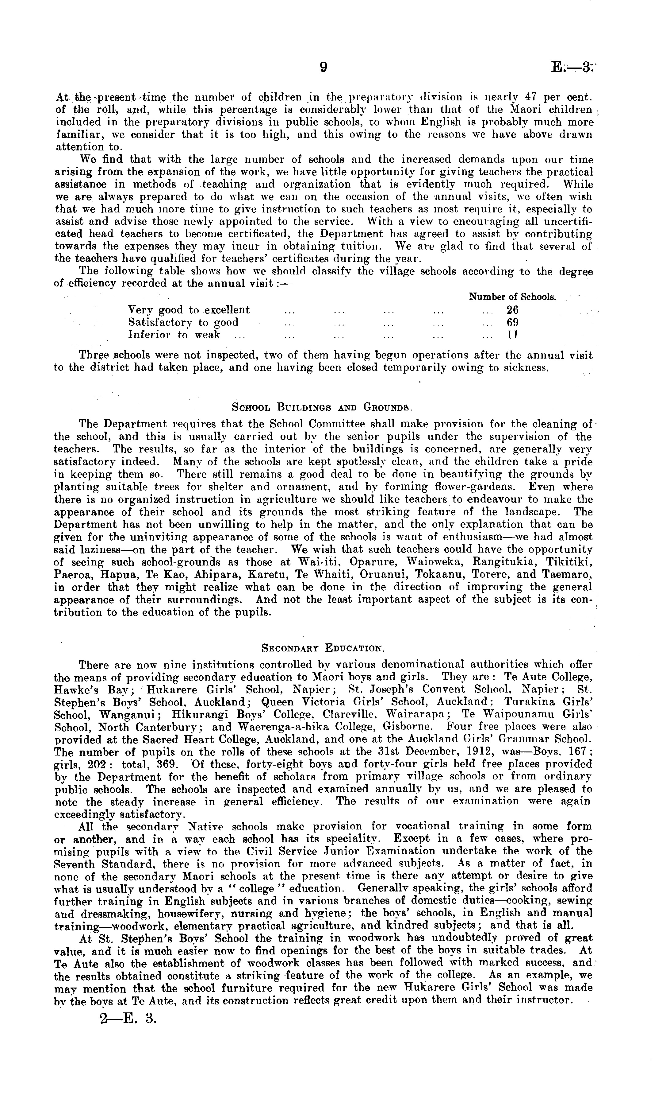 At the-present time the number of children in the preparatory division is nearly 47 per cent, of the roll, and, while this percentage is considerably lower than that of the Maori children included in the preparatory divisions in public schools, to whom English is probably much more familiar, we consider that it is too high, and this owing to the reasons we have above drawn attention to. We find that with the large number of schools and the increased demands upon our time arising from the expansion of the work, we have little opportunity for giving teachers the practical assistance in methods of teaching and organization that is evidently much required. While we are always prepared to do what we oan on the occasion of the annual visits, we often wish that we had much more time to give instruction to such teachers as most require it, especially to assist and advise those newly appointed to the service. With a view to encouraging all uncertificated head teachers to become certificated, the Department has agreed to assist by contributing towards the expenses they may incur in obtaining tuition. We are glad to find that several of the teachers have qualified for teachers' certificates during the year. The following table shows how we should classify the village schools according to the degree of efficiency recorded at the annual visit : — Number of Schools. Very good to excellent ... ... ... ... ... 26 Satisfactory to good ... ... ... ... ... 69 Inferior to weak ... ... ... ... ... ... 11 Three schools were not inspected, two of them having begun operations after the annual visit to the district had taken place, and one having been closed temporarily owing to sickness. School Buildings and Grounds The Department requires that the School Committee shall make provision for the cleaning of the school, and this is usually carried out by the senior pupils under the supervision of the teachers. The results, so far as the interior of the buildings is concerned, are generally very satisfactory indeed. Many of the schools are kept spotlessly clean, and the children take a pride in keeping them so. There still remains a good deal to be done in beautifying the grounds by planting suitable trees for shelter and ornament, and by forming flower-gardens. Even where there is no organized instruction in agriculture we should like teachers to endeavour to make the appearance of their school and its grounds the most striking feature of the landscape. The Department has not been unwilling to help in the matter, and the only explanation that can be given for the uninviting appearance of some of the schools is want of enthusiasm —we had almost said laziness—on the part of the teacher. We wish that such teachers could have the opportunity of seeing such school-grounds as those at Wai-iti, Oparure, Waioweka, Rangitukia, Tikitiki, Paeroa, Hapua, Te Kao, Ahipara, Karetu, Te Whaiti, Oruanui, Tokaanu, Torere, and Taemaro, in order that they might realize what can be done in the direction of improving the general appearance of their surroundings. And not the least important aspect of the subject is its contribution to the education of the pupils. Secondary Education. There are now nine institutions controlled by various denominational authorities which offer the means of providing secondary education to Maori boys and girls. They are :Te Aute College, Hawke's Bay; Hukarere Girls' School, Napier; St. Joseph's Convent School, Napier; St. Stephen's Boys' School, Auckland; Queen Victoria Girls' School, Auckland; Turakina Girls' School, Wanganui; Hikurangi Boys' College, Clarcville, Wairarapa; Te Waipounamu Girls' School, North Canterbury; and Waerenga-a-hika College, Gisborne. Four free places were also provided at the Sacred Heart College, Auckland, and one at the Auckland Girls' Grammar School. The number of pupils on the rolls of these schools at the 31st December, 1912, was—Boys, 167 ; girls, 202 : total, 369. Of these, forty-eight boys and forty-four girls held free places provided by the Department for the benefit of scholars from primary village schools or from ordinary public schools. The schools are inspected and examined annually by us, and we are pleased to note the steady increase in general efficiency. The results of our examination were again exceedingly satisfactory. All the secondary Native schools make provision for vocational training in some form or another, and in a way each school has its speciality. Except in a few cases, where promising pupils with a view to the Civil Service Junior Examination undertake the work of the Seventh Standard, there is no provision for more advanced subjects. As a matter of fact, in none of the secondary Maori schools at the present time is there any attempt or desire to give what is usually understood by a " college " education. Generally speaking, the girls' schools afford further training in English subjects and in various branches of domestic duties—cooking, sewing and dressmaking, housewifery, nursing and hygiene; the boys' schools, in English and manual training—woodwork, elementary practical agriculture, and kindred subjects; and that is all. At St. Stephen's Boys' School the training in woodwork has undoubtedly proved of great value, and it is much easier now to find openings for the best of the boys in suitable trades. At Te Aute also the establishment of -woodwork classes has been followed with marked success, and the results obtained constitute a striking feature of the work of the college. As an example, we may mention that the school furniture required for the new Hukarere Girls' School was made by the boys at Te A\ite, and its construction reflects great credit upon them and their instructor.
