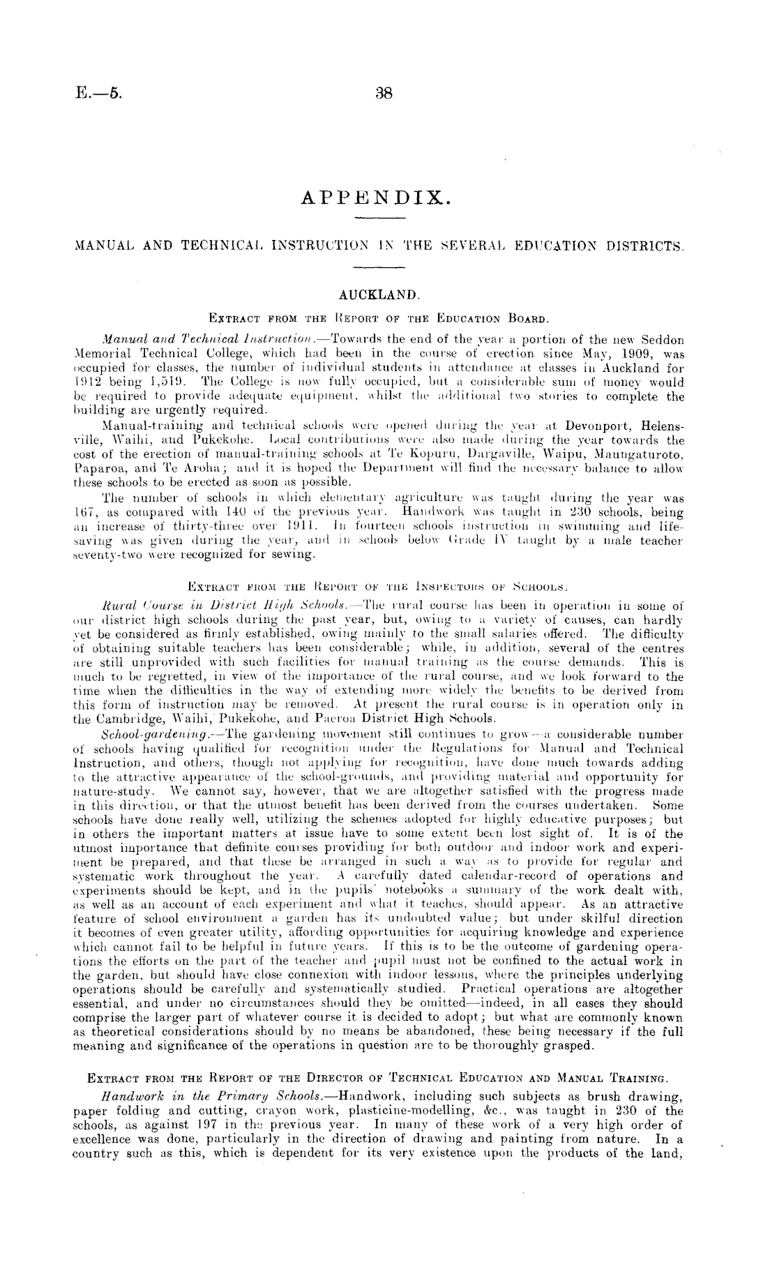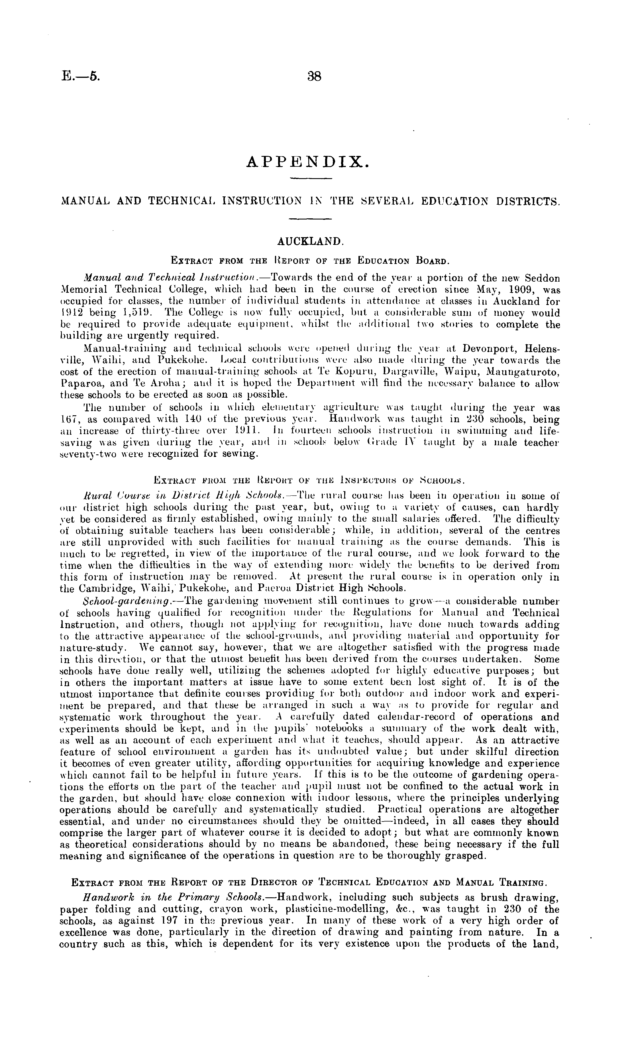AUCKLAND. Extract from the Report of the Education Board. Manual and Technical Instruction. —Towards the end of the year a portion of the new Seddon Memorial Technical College, which hud been in the course of erection since May, 1909, was occupied for classes, the number of individual students in attendance at classes in Auckland for 1912 being 1,519. The College is now fully occupied, but a considerable sum of money would be required to provide adequate equipment, whilst the additional two stories to complete the building are urgently required. Manual-training and technical schools were opened during the year at Devonport, Helensville, Waihi, and Pukekohe. Local contributions were also made during the year towards the cost of the erection of manual-training schools at Te Kopuru, Dargaville, Waipu, Maungaturoto, Paparoa, and Te Aroha; and it is hoped the Department will rind the necessary balance to allow these schools to be erected as soon as possible. The number of schools in which elementary agriculture was taught during the year was 167, as compared with 140 of the previous year. Handwork was taught in '2-iO schools, being an increase of thirty-three over 1911. In fourteen schools instruction in swimming and lifesaving was given during the year, and in schools below Grade IV taught by a male teacher seventy-two were recognized for sewing. Extract from the Keport of the Inspectors of Schools. Rural Course in District High Schools. -The rural course lias been in operation in some of our district high schools during the past year, but, owing to a variety of causes, can hardly yet be considered as firmly established, owing mainly to the small salaries offered. The difficulty of obtaining suitable teachers has been considerable; while, in addition, several of the centres are still unprovided with such facilities for manual training as the course demands. This is much to be regretted, in view of the importance of the rural course, and we look forward to the time when the difficulties in the way of extending more widely the benefits to be derived from this form of instruction may be removed. At present the rural course is in operation only in the Cambridge, Waihi, Pukekohe, and Paeroa District High Schools. School-gardening. —The gardening movement still continues to grow a considerable number of schools having qualified for recognition under the Regulations for Manual and Technical Instruction, and others, though not applying for recognition, have done much towards adding to the attractive appearance of the school-grounds, and providing material and opportunity for nature-study. We cannot say, however, that we are altogether satisfied with the progress made in this direction, or that the utmost benefit has been derived from the courses undertaken. Some schools have done really well, utilizing the schemes adopted for highly educative purposes; but in others the important matters at issue have to some extent been lost sight of. It is of the utmost importance that definite courses providing for both outdoor and indoor work and experiment be prepared, and that these be arranged in such a way as to provide for regular and systematic work throughout the year. A carefully dated calendar-record of operations and experiments should be kept, and in the pupils' notebooks a summary of the work dealt with, as well as an account of each experiment and what it teaches, should appear. iAs an attractive feature of school environment a garden has its undoubted value; but under skilful direction it becomes of even greater utility, affording opportunities for acquiring knowledge and experience which cannot fail to be helpful in future years. If this is to be the outcome of gardening operations the efforts on the part of the teacher and pupil must not be confined to the actual work in the garden, but should have close connexion with indoor lessons, where the principles underlying operations should be carefully and systematically studied. Practical operations are altogether essential, and under no circumstances should they be omitted —indeed, in all cases they should comprise the larger part of whatever course it is decided to adopt; but what are commonly known as theoretical considerations should by no means be abandoned, these being necessary if the full meaning and significance of the operations in question are to be thoroughly grasped. Extract from the Report of the Director of Technical Education and Manual Training. Handwork in the Primary Schools. —Handwork, including such subjects as brush drawing, paper folding and cutting, crayon work, plasticine-modelling, &c, was taught in 230 of the schools, as against 197 in the previous year. In many of these work of a very high order of excellence was done, particularly in the direction of drawing and painting from nature. In a country such as this, which is dependent for its very existence upon the products of the land,