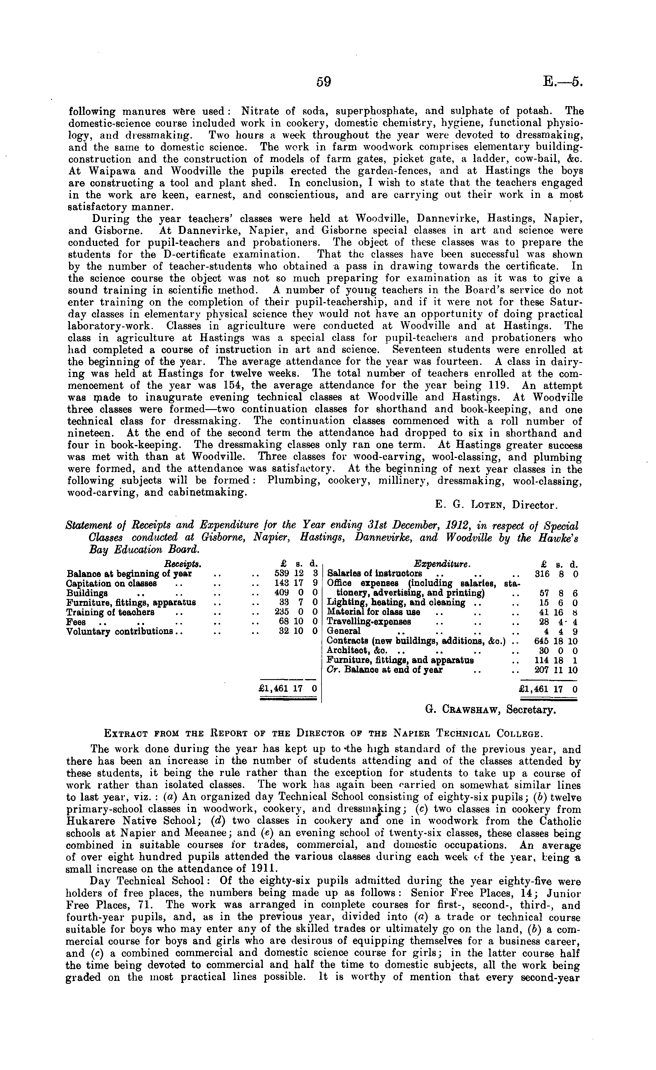 following manures were used : Nitrate of soda, superphosphate, and sulphate of potash. The domestic-science course included work in cookery, domestic chemistry, hygiene, functional physiology, and dressmaking. Two hours a week throughout the year were devoted to dressmaking, and the same to domestic science. The work in farm woodwork comprises elementary buildingconstruction and the construction of models of farm gates, picket gate, a ladder, cow-bail, &c. At Waipawa and Woodville the pupils erected the garden-fences, and at Hastings the boys are constructing a tool and plant shed. In conclusion, I wish to state that the teachers engaged in the work are keen, earnest, and conscientious, and are carrying out their work in a most satisfactory manner. During the year teachers' classes were held at Woodville, Dannevirke, Hastings, Napier, and Gisborne. At Dannevirke, Napier, and Gisborne special classes in art and science were conducted for pupil-teachers and probationers. The object of these classes was to prepare the students for the D-certificate examination. That the classes have been successful was shown by the number of teacher-students who obtained a pass in drawing towards the certificate. In the science course the object was not so much preparing for examination as it was to give a sound training in scientific method. A number of young teachers in the Board's service do not enter training on the completion of their pupil-teachership, and if it were not for these Saturday classes in elementary physical science they would not have an opportunity of doing practical laboratory-work. Classes in agriculture were conducted at Woodville and at Hastings. The class in agriculture at Hastings was a special class for pupil-teachers and probationers who had completed a course of instruction in art and science. Seventeen students were enrolled at the beginning of the year. The average attendance for the year was fourteen. A class in dairying was held at Hastings for twelve weeks. The total number of teachers enrolled at the commencement of the year was 154, the average attendance for the year being 119. An attempt was made to inaugurate evening technical classes at Woodville and Hastings. At Woodville three classes were formed —two continuation classes for shorthand and book-keeping, and one technical class for dressmaking. The continuation classes commenced with a roll number of nineteen. At the end of the second term the attendance had dropped to six in shorthand and four in book-keeping. The dressmaking classes only ran one term. At Hastings greater success was met with than at Woodville. Three classes for wood-carving, wool-classing, and plumbing were formed, and the attendance was satisfactory. At the beginning of next year classes in the following subjects will be formed : Plumbing, cookery, millinery, dressmaking, wool-classing, wood-carving, and cabinetmaking. E. G. Loten, Director. Statement of Receipts and Expenditure for the Year ending 31st December, 1912, in respect of Special Classes conducted at Gisborne, Napier, Hastings, Dannevirke, and Woodville by the Hawke's Bay Education Board. Receipts. £ s. d. Expenditure. £ s. d. Balance at beginning of year .. .. 539 12 3 J Salaries of instructors .. .. .. 316 8 0 Capitation on classes .. .. .. 143 17 9 Office expenses (including salaries, staBuildings .. .. .. ■. 409 0 0 tionery, advertising, and printing) .. 57 8 6 Furniture, fittings, apparatus .. .. 33 7 0 Lighting, heating, and cleaning .. .. 15 6 0 Training of teaohers .. .. .. 235 0 0 Material for olass use .. .. .. 41 16 8 Fees .. .. .. .. .. 68 10 0 Travelling-expenses .. .. .. 28 4- 4 Voluntary contributions.. .. .. 32 10 0 General .. .. .. .. 449 Contracts (new buildings, additions, &c.) .. 645 18 10 Architect, &c. .. .. .. .. 30 0 0 Furniture, fittings, and apparatus .. 114 18 1 Or. Balanoe at end of year .. .. 207 11 10 £1,461 17 0 £1,461 17 0 G. Crawshaw, Secretary. Extract from the Report of the Director of the Napier Technical College. The work done during the year has kept up to -the high standard of the previous year, and there has been an increase in the number of students attending and of the classes attended by these students, it being the rule rather than the exception for students to take up a course of work rather than isolated classes. The work has again been carried on somewhat similar lines to last year, viz. : (a) An organized day Technical School consisting of eighty-six pupils; (b) twelve primary-school classes in woodwork, cookery, and dressmaking; (c) two classes in cookery from Hukarere Native School; (d) two classes in cookery and one in woodwork from the Catholic schools at Napier and Meeanee; and (c) an evening school of twenty-six classes, these classes being combined in suitable courses for trades, commercial, and domestic occupations. An average of over eight hundred pupils attended the various classes during each week of the year, being a small increase on the attendance of 1911. Day Technical School: Of the eighty-six pupils admitted during the year eighty-five were holders of free places, the numbers being made up as follows: Senior Free Places, 14; Junior Free Places, 71. The work was arranged in complete courses for first-, second-, third-, and fourth-year pupils, and, as in the previous 3 7 ear, divided into (a) a trade or technical course suitable for boys who may enter any of the skilled trades or ultimately go on the land, (b) a commercial course for boys and girls who are desirous of equipping themselves for a business career, and (c) a combined commercial and domestic science course for girls; in the latter course half the time being devoted to commercial and half the time to domestic subjects, all the work being graded on the most practical lines possible. It is worthy of mention that every second-year