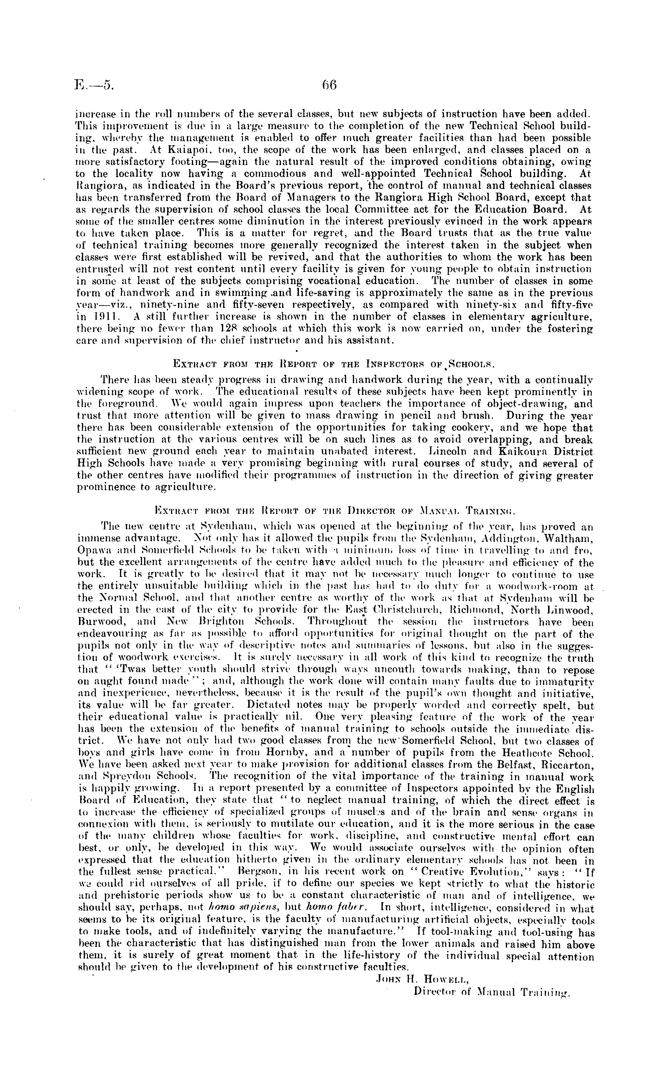 increase in the roll numbers of the several classes, but new subjects of instruction have been added. This improvement 1 is due in a large measure to the completion of the new Technical School building, whereby the management is enabled to offer much greater facilities than had been possible in the past. At Kaiapoi. too, the scope of the work has been enlarged, and classes placed on a more satisfactory footing — again the natural result of the improved conditions obtaining, owing to the locality now having a commodious and well-appointed Technical School building. At Rangiora, as indicated in the Board's previous report, the control of manual and technical classes lias been transferred front the Board of Managers to the Rangiora High School Board, except that as regards the supervision of school olasses the local Committee act for the Education Board. At some of the smaller centres some diminution in the interest previously evinced in the work appears to have taken place. This is a matter for regret, and the Board trusts that as the true value of technical training becomes more generally recognized the interest taken in the subject when classes were Hist established will be revived, and that the authorities to whom the work litis been entrusted will not rest content until every facility is given for young people to obtain instruction in sonic tit least of the subjects comprising vocational education. The number of classes in some form of handwork and in swimming .and life-saving is approximately the same as in the previous year —viz., ninety-nine and fifty-seven respectively, as compared with ninety-six and fifty-five in Kill. A still further increase is shown in the number of classes in elementary agriculture, there being no fewer than 128 schools at which this work is now carried on. under the fostering rare and supervision of the chief instructor and his assistant. Extract prom the Rbport op the Inspectors of % Sohools. There has been steady progress in drawing and handwork during the year, with a continually widening scope of work. The educational results of these subjects have been kept prominently in the foreground. We would again impress upon teachers the importance of object-drawing, and trust that more attention will be given to mass drawing in pencil and brush. During the year there has been considerable extension of the opportunities for taking cookery, and we hope that the instruction at the various centres will be on such lines as to avoid overlapping, and break sufficient new ground each year to maintain unabated interest. Lincoln and Kaikoura District High Schools have made a very promising beginning with rural courses of study, and several of the other centres have modified their programmes of instruction in the direction of giving greater prominence to agriculture. Extract prom the Report or the Director op Manual Training. The new centre tit Sydenham, which was opened tit the beginning of the year, has proved an immense advantage. Not only has it allowed the pupils from the Sydenham, Addington, Waltham, Opawa and Somerfield Schools to be taken with a minimum loss of time in travelling to and fro, but the excellent arrangements of the centre have added much to the pleasure and efficiency of the work. It is greatly to lie desired that it may not be necessary much longer to continue to use the entirely unsuitable building which in the past has had to do duty for a woodwork-room at the Normal School, and that another centre as worthy of the work as that at Sydenham will be erected in the east of the city to provide for the East Christchurch, Richmond, North Linwood, Burwood, and New Brighton Schools. Throughout the session the instructors have been endeavouring as far as possible to afford opportunities for original thought on the part of the pupils not only in the way of descriptive notes and summaries of lessons, but also in the suggestion of woodwork exercises. It is surely necessary in all work of this kind to recognize the- truth that " 'Twas better youth should strive through ways uncouth towards making, than to repose on aught found made " ; and, although the work done will contain many faults due to immaturity and inexperience, nevertheless, because it is the result of the pupil's own thought and initiative. its value will lie ftir greater. Dictated notes may be properly winded and correctly spelt, but their educational value is practically nil. One very pleasing feature of the work of the year has been the c-xtc nsion of the benefits of manual training to schools outside the immediate district. We have not only had two tr 1 classes from the new Somerfield School, but two classes of boys and girls have conic in from Hornby, and a number of pupils from the Heathcote School. We have been asked next year to make provision for additional classes from the Belfast. I! iccarton, ami Spreydon Schools. The recognition of the vital importance of the training in manual work is happily growing. lii a report presented by a committee of Inspectors appointed by the English Board of Education, thej state that "to neglect manual training, of which the direct effect is to increase the efficiency of specialized groups of iniiscl -s and of the brain and sense organs in connexion with them, is seriously to mutilate our education, and it is the more serious in the case of the many children whose faculties for work, discipline, and constructive mental effort can best, or only, be developed in this way. We would associate ourselves with the opinion often expressed that the education hitherto given ill the ordinary elementary schools has not been in the fullest sense plait ical." Bergson, in his recent work on "Creative Evolution," says : "If we could rid ourselves of all pride, if to define our species we kept strictly to what the historic and prehistoric periods show us to be a constant characteristic of man and of intelligence, we should say. perhaps, not homo sapiens, but homo fahir