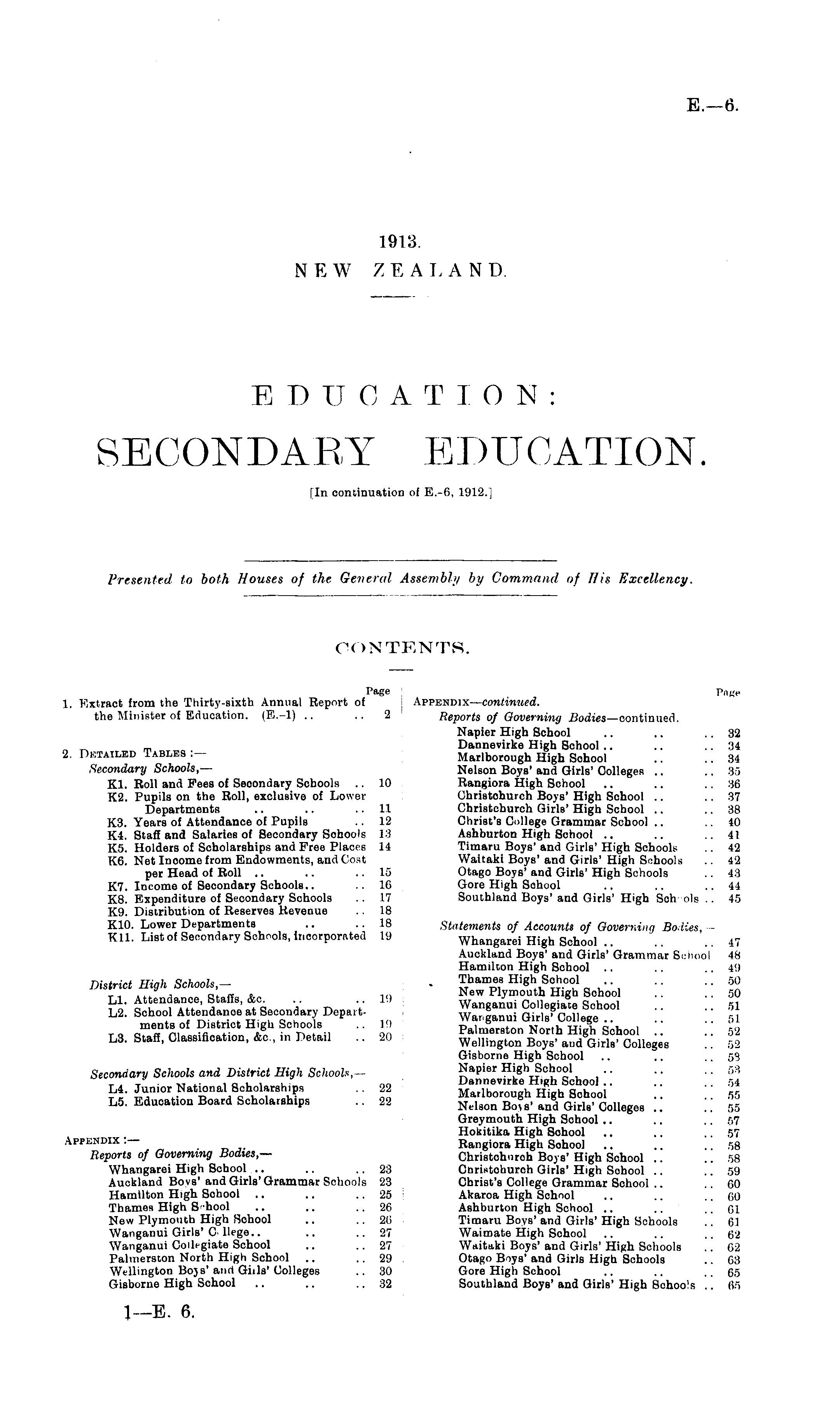 Page 1. Extract from the Thirty-sixth Annual Report of the Minister of Education. (E.-l) .. ..2 •1. Pk.tailed Tables:— Secondary Schools, — Kl. Roll and Fees of Seoondary Schools* .. 10 K2. Pupils on the Roll, exclusive of Lower Departments .. .. 11 K3. Years of Attendance of Pupils .. 12 K4. Staff and Salaries of Secondary Sohools 13 K5. Holders of Scholarships and Free Places 14 K6. Net Inoome from Endowments, and Oost per Head of Roll .. .. .. 13 K7. Income of Secondary Schools.. .. 16 K8. Expenditure of Secondary Schools .. 17 K9. Distribution of Reserves Revenue .. 18 K10. Lower Departments .. ..18 Kll. List of Secondary Schools, Incorporated 19 District High Schools,— LI. Attendance, Staffs, &c. .. .. L9 L2. School Attendance at Secondary Departments of District High Schools .. If) L3. Staff, Classification, &c, in Detail .. 20 Secondary Schools and District High Schools, — L4. Junior National Scholarships .. 22 L5. Education Board Scholarships .. 22 Appendix :— Reports of Governing Bodies, — Whangarei High School .. .. .. 23 Auckland Boys'and Girls'Grammar Schools 23 Hamilton High School .. .. .. 25 Thames High School .. .. .. 26 New Plymouth High School .. .. 2li Wanganui Girls'C liege.. .. ..27 Wanganui Collegiate School .. 27 Palmerston North High School .. .. 29 . Wellington Bojs' anrt Giils' Colleges .. 30 Gisborne High School .. .. .. 32