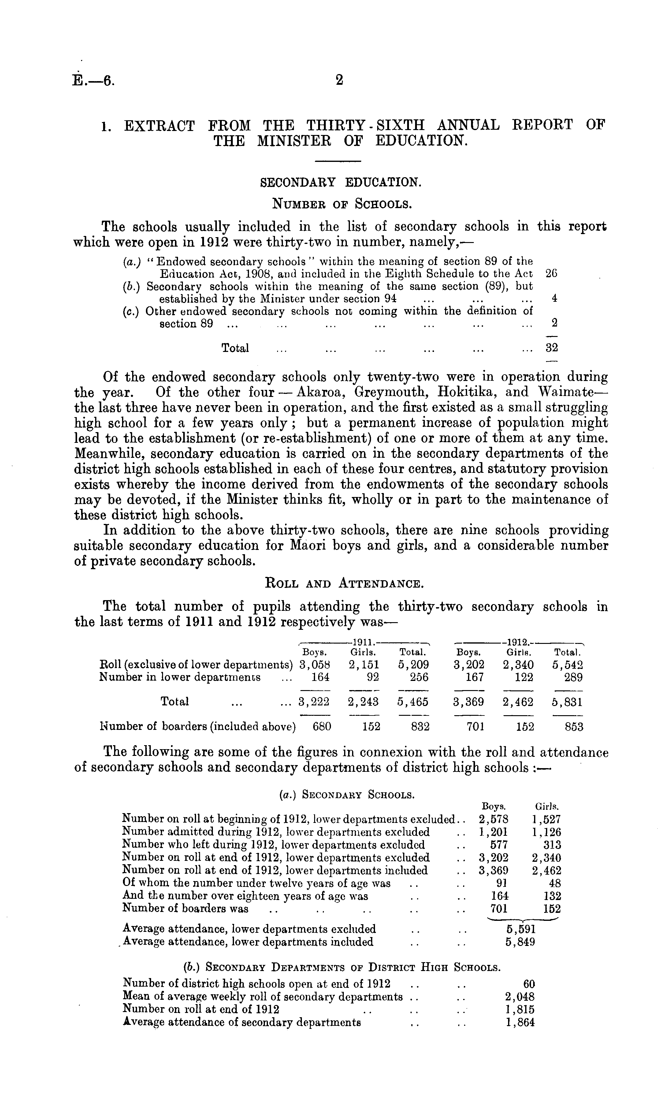 SECONDARY EDUCATION. Number of Schools. The schools usually included in the list of secondary schools in this report which were open in 1912 were thirty-two in number, namely,— (a.) "Endowed secondary schools" within the meaning of section 89 of the Education Act, 1908, and included in the Eighth Schedule to the Act 26 (b.) Secondary schools within the meaning of the same section (89), but established by the Minister under section 94 ... ... ... 4 (c.) Other endowed secondary schools not coming within the definition of section 89 ... ... ... ... ... ... 2 Total ... ... ... ... ... ... 32 Of the endowed secondary schools only twenty-two were in operation during the year. Of the other four — Akaroa, Greymouth, Hokitika, and Waimate— the last three have never been in operation, and the first existed as a small struggling high school for a few years only ; but a permanent increase of population might lead to the establishment (or re-establishment) of one or more of them at any time. Meanwhile, secondary education is carried on in the secondary departments of the district high schools established in each of these four centres, and statutory provision exists whereby the income derived from the endowments of the secondary schools may be devoted, if the Minister thinks fit, wholly or in part to the maintenance of these district high schools. In addition to the above thirty-two schools, there are nine schools providing suitable secondary education for Maori boys and girls, and a considerable number of private secondary schools. Roll and Attendance. The total number of pupils attending the thirty-two secondary schools in the last terms of 1911 and 1912 respectively was— , 1911.-—- , 1912. , Boys. Girls. Total. Boys. Girls. Total. Eoll (exclusiveof lower departments) 3,058 2,151 5,209 3,202 2,340 5,542 Number in lower departments ... 164 92 256 167 122 289 Total ... ... 3,222 2,243 5,465 3,369 2,462 5,831 Number of boarders (included above) 680 152 832 701 152 853 The following are some of the figures in connexion with the roll and attendance of secondary schools and secondary departments of district high schools :— (a.) Secondary Schools. Boys. Girls. Number on roll at beginning of 1912, lower departments excluded.. 2,578 1,527 Number admitted during 1912, lower departments excluded .. 1,201 1,126 Number who left during 1912, lower departments excluded .. 577 313 Number on roll at end of 1912, lower departments excluded .. 3,202 2,340 Number on roll at end of 1912, lower departments included .. 3,369 2,462 Of whom the number under twelve years of age was .. .. 91 48 And the number over eighteen years of age was .. .. 164 132 Number of boarders was .. .. .. .. .. 701 152 Average attendance, lower departments excluded .. .. 5,591 Average attendance, lower departments included .. .. 5,849 (b.) Secondary Departments op District High Schools. Number of district high schools open at end of 1912 .. .. 60 Mean of average weekly roll of secondary departments .. .. 2,048 Number on roll at end of 1912 .. .. ..- 1,815 Average attendance of secondary departments ~ .. 1,864