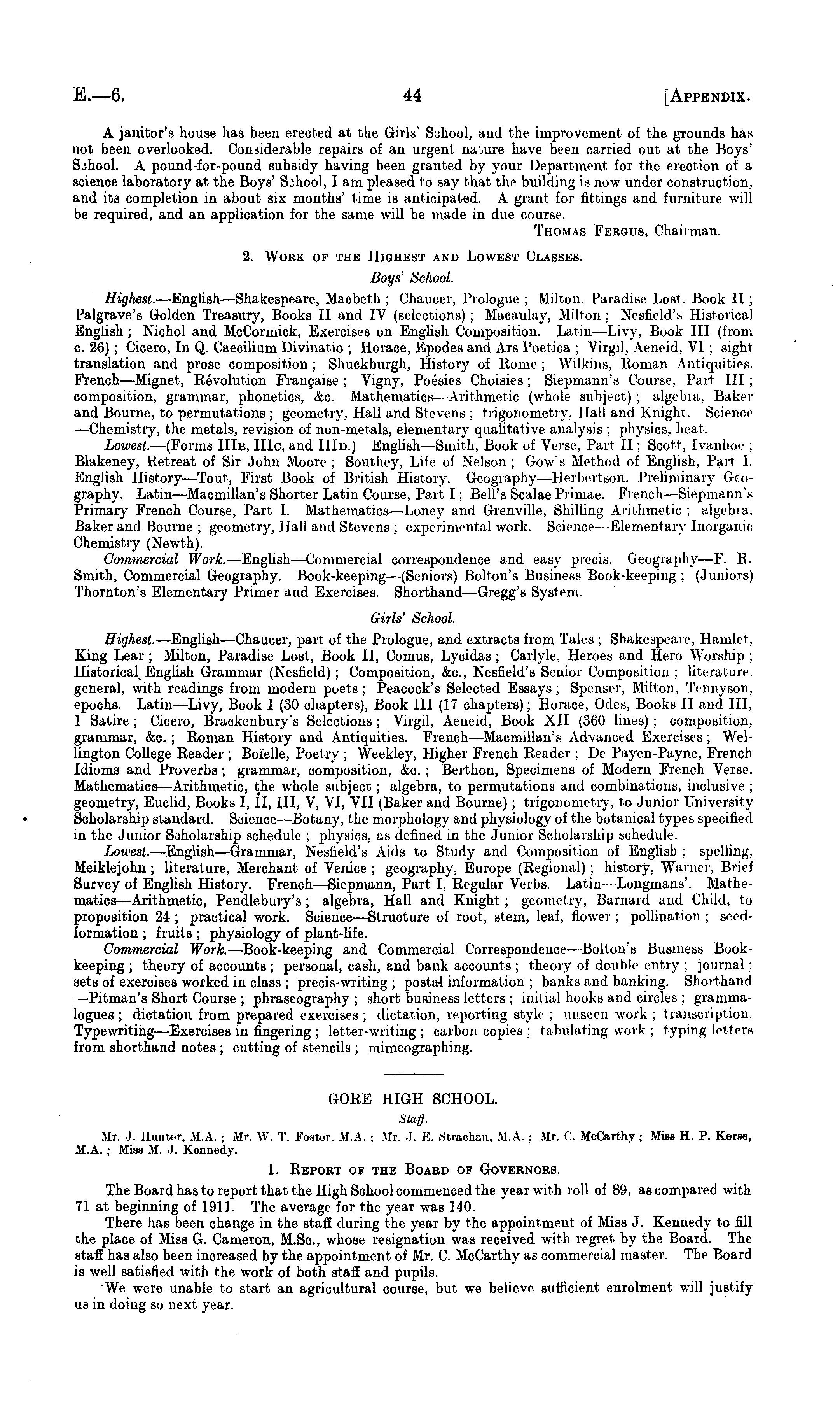 GORE HIGH SCHOOL. Staff. Mr. J. Hunter, M.A. ; Mr. W. T. Foster, M.A. ; Mr. J. E. Strachan, M.A. ; Mr. C. McCarthy ; Miss H. P. Kerse, M.A. ; Miss M. -1. Kennedy. 1. Report of the Board of Governors. The Board has to report that the High School commenced the year with roll of 89, as compared with 71 at beginning of 1911. The average for the year was 140. There has been change in the staff during the year by the appointment of Miss J. Kennedy to fill the place of Miss G. Cameron, M.Sc, whose resignation was received with regret by the Board. The staff has also been increased by the appointment of Mr. C. McCarthy as commercial master. The Board is well satisfied with the work of both staff and pupils. We were unable to start an agricultural course, but we believe sufficient enrolment will justify us in doing so next year.