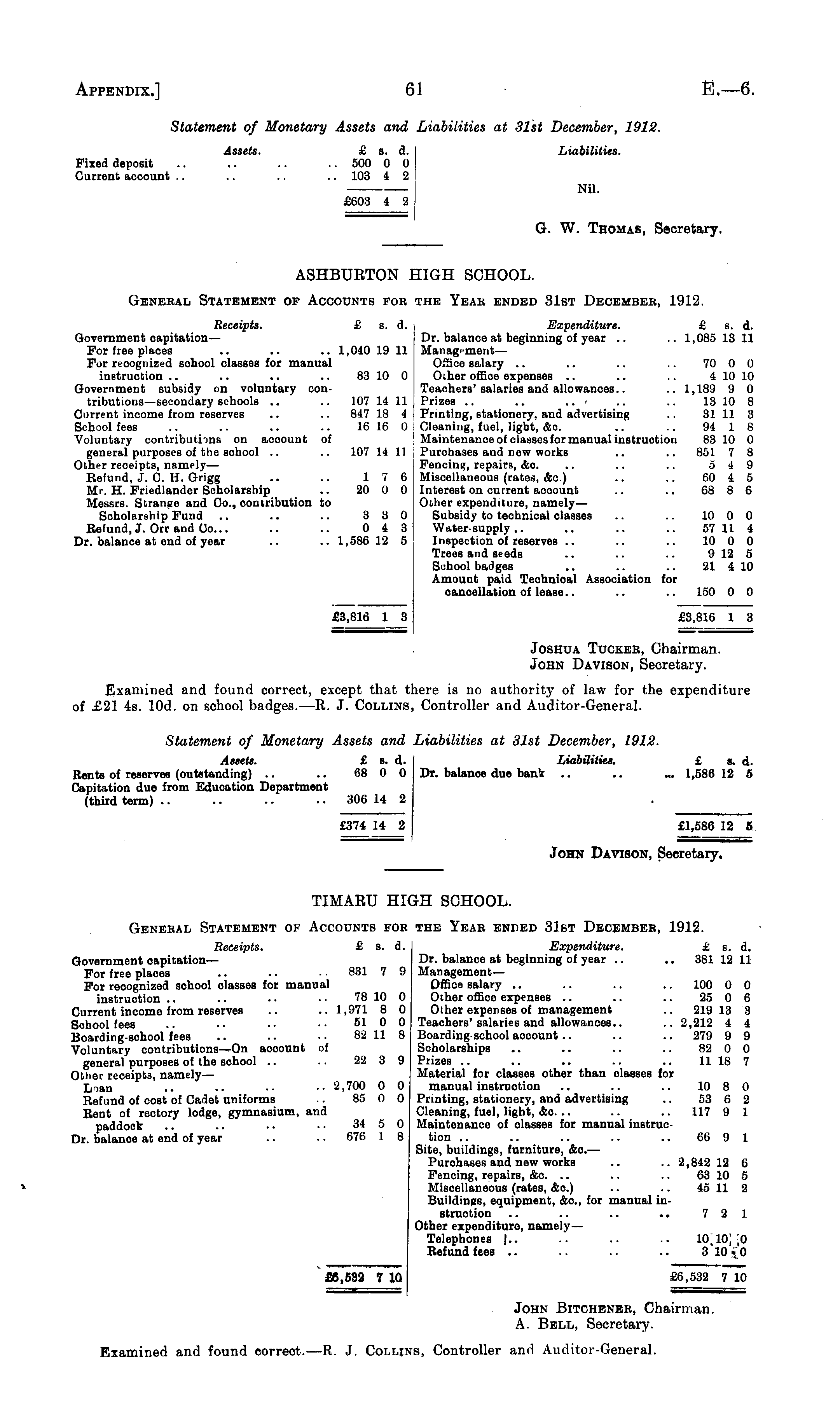 ASHBUBTON HIGH SCHOOL. Genebal Statement of Accounts for the Yeak ended 31st Decembek, 1912. Receipts. £ s. d. Expenditure. £ 8. d. Government capitation— Dr. balance at beginning of year .. .. 1,085 13 11 For free places .. .. .. 1,040 19 11 Management— For recognized school classes for manual Office salary .. .. .. .. 70 0 0 instruction .. .. .. .. 83 10 0 Oiher office expenses .. .. .. i 10 10 Government subsidy on voluntary con- Teachers' salaries and allowances.. .. 1,18'J 9 0 tributions —secondary schools .. .. 107 14 11 Prizes .. .. .. > .. .. 13 10 8 Current income from reserves .. .. 847 18 4 Printing, stationery, and advertising .. 31 11 3 School fees .. .. .. .. 16 16 0 Cleaning, fuel, light, &o. .. .. 94 1 8 Voluntary contributions on account of Maintenance of classes for manual instruction 83 10 0 general purposes of the school .. .. 107 14 11 Purchases and new works .. .. 851 7 8 Other receipts, namely— Fencine, repairs, &o. .. .. .. 5 4 9 Refund, J. C. H. Grigg .. .. 17 6 Miscellaneous (rates, &c.) .. .. 60 4 5 Mr. H. Friedlander Scholarship .. 20 0 0 Interest on current acoount .. .. 68 8 6 Messrs. Strange and Co., contribution to Other expenditure, namely— Scholarship Fund .. .. .. 3 3 0 Subsidy to technical classes .. .. 10 0 0 Refund, J. Orr and Co... .. .. 0 4 3 Water-supply.. .. .. .. 57 11 4 Dr. balance at end of year .. .. 1,586 12 5j Inspection of reserves .. .. .. 10 0 0 Trees and seeds .. .. .. 9 12 5 School badges .. .. .. 21 4 10 Amount paid Technical Association for cancellation of lease.. .. .. 150 0 0 £3,816 1 3 £3,816 1 3 Joshua Tucker, Chairman. John Davison, Secretary. Examined and found correct, except that there is no authority of law for the expenditure of £21 4s. 10d. on school badges.—R. J. Collins, Controller and Auditor-General. Statement of Monetary Assets and Liabilities at 31st December, 1912. Assets. £ s. d. Liabilities. £ s. d. Rente of reserves (outstanding) .. .. 68 0 0 Dr. balance due bank .. .. ... 1,586 12 5 Capitation due from Education Department (third term) .. .. .. .. 306 14 2 £374 14 2 £1,586 12 5 John Davison, Secretary.
