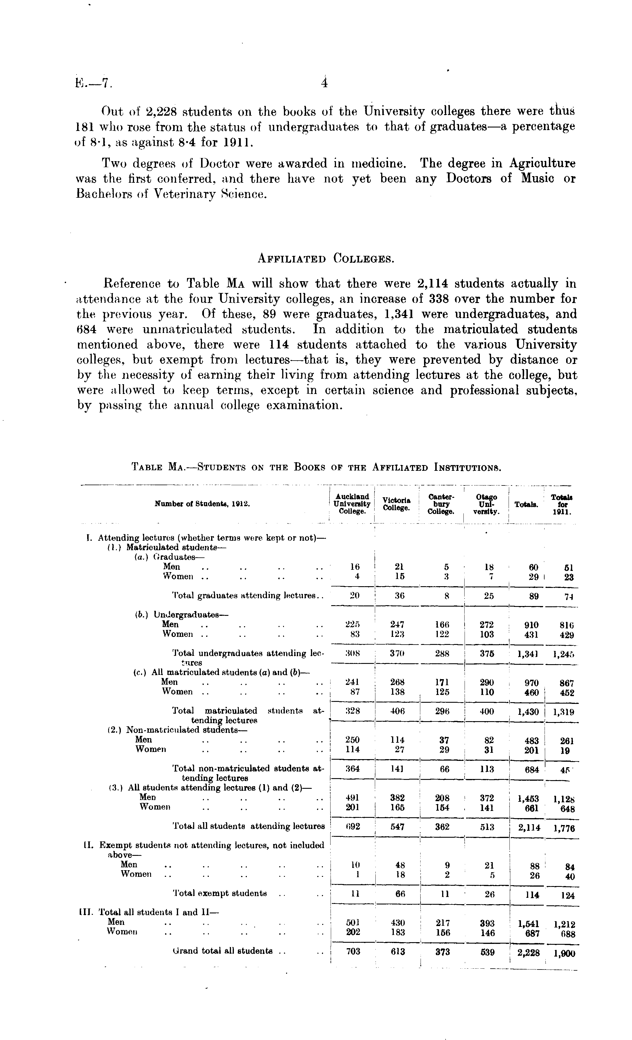 Out of 2,228 students on the books of the University colleges there were thus 181 who rose from the status of undergraduates to that of graduates—a percentage of 8-J, as against 8-4 for 1911. Two degrees of Doctor were awarded in medicine. The degree in Agriculture was the first conferred, and there have not yet been any Doctors of Music or Bachelors of Veterinary Science. Affiliated Colleges. Reference to Table Ma will show that there were 2,114 students actually in attendance at the four University colleges, an increase of 338 over the number for the previous year. Of these, 89 were graduates, 1,341 were undergraduates, and 684 were unmatriculated students. In addition to the matriculated students mentioned above, there were 114 students attached to the various University colleges, but exempt from lectures- —that is, they were prevented by distance or by the necessity of earning their living from attending lectures at the college, but were allowed to keep terms, except in certain science and professional subjects, by passing tlie annual college examination.