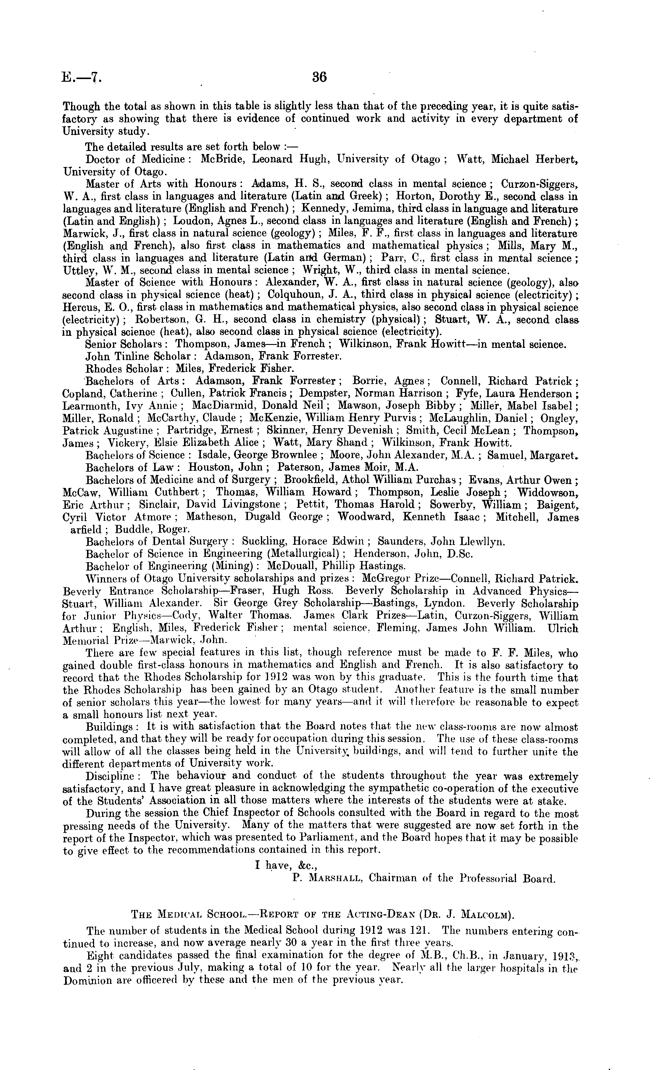 Though the total as shown in this table is slightly less than that of the preceding year, it is quite satisfactory as showing that there is evidence of continued work and activity in every department of University study. The detailed results are set forth below : — Doctor of Medicine : Mcßride, Leonard Hugh, University of Otago : Watt, Michael Herbert, University of Otago. Master of Arts with Honours : Adams, H. S., second class in mental science ; Curzon-Siggers, W. A., first class in languages and literature (Latin and Greek) ; Horton, Dorothy E., second class in languages and literature (English and French) ; Kennedy, Jemima, third class in language and literature (Latin and English) ; Loudon, Agnes L., second class in languages and literature (English and French) ; Marwick, J., first class in natural science (geology) ; Miles, F. F., first class in languages and literature (English an/I French), also first class in mathematics and mathematical physics ; Mills, Mary M., third class in languages and literature (Latin arid German) ; Parr, C, first class in mental science ; Uttley, W. M., second class in mental science ; Wright, W., third class in mental science. Master of Science with Honours : Alexander, W. A., first class in natural science (geology), also second class in physical science (heat) ; Colquhoun, J. A., third class in physical science (electricity) ; Hercus, E. 0., first class in mathematics and mathematical physics, also second class in physical science (electricity); Robertson, G. H., second class in chemistry (physical); Stuart, W. A., second class in physical science (heat), also second class in physical science (electricity). Senior Scholars : Thompson, James —in French ; Wilkinson, Frank Howitt—in mental science. John Tinline Scholar : Adamson, Frank Forrester. Rhodes Scholar : Miles, Frederick Fisher. Bachelors of Arts : Adamson, Frank Forrester ; Borrie, Agnes ; Connell, Richard Patrick ; Copland, Catherine ; Cullen, Patrick Francis ; Dempster, Norman Harrison ; Fyfe, Laura Henderson ; Learmonth, Ivy Annie ; MacDiarmid, Donald Neil; Mawson, Joseph Bibby ; Miller, Mabel Isabel; Miller, Ronald ; McCarthy, Claude ; McKenzie, William Henry Purvis ; McLaughlin, Daniel; Ongley, Patrick Augustine ; Partridge, Ernest ; Skinner, Henry Devenish ; Smith, Cecil McLean ; Thompson, James ; Vickery, Elsie Elizabeth Alice ; Watt, Mary Shand ; Wilkinson, Frank Howitt. Bachelors of Science : Isdale, George Brownlee ; Moore, John Alexander, M.A. ; Samuel, Margaret. Bachelors of Law : Houston, John ; Paterson, James Moir, M.A. Bachelors of Medicine and of Surgery ; Brookfield, Athol William Purchas ; Evans, Arthur Owen ; McCaw, William Cuthbert ; Thomas, William Howard ; Thompson, Leslie Joseph ; Widdowson, Eric Arthur ; Sinclair, David Livingstone ; Pettit, Thomas Harold ; Sowerby, William ; Baigent, Cyril Victor Atmore ; Matheson, Dugald George ; Woodward, Kenneth Isaac ; Mitchell, James arfield ; Buddie, Roger. Bachelors of Dental Surgery : Suckling, Horace Edwin ; Saunders, John Llewllyn. Bachelor of Science in Engineering (Metallurgical) ; Henderson, John, D.Sc. Bachelor of Engineering (Mining) : McDouall, Phillip Hastings. Winners of Otago University scholarships and prizes : McGregor Prize—Connell, Richard Patrick. Beverly Entrance Scholarship —Fraser, Hugh Ross. Beverly Scholarship in Advanced Physics— Stuart, William Alexander. Sir George Grey Scholarship—Bastings. Lyndon. Beverly Scholarship for Junior Physics —Cody, Walter Thomas. James Clark Prizes—Latin, Curzon-Siggers, William Arthur; English, Miles, Frederick Fisher; mental science, Fleming. James John William. Ulrich Memorial Prize—Marwick. John. There are few special features in this list, though reference must be made to F. F. Miles, who gained double first-class honours in mathematics and English and French. It is also satisfactory to record that the Rhodes Scholarship for 1912 was won by this graduate. This is the fourth time that the Rhodes Scholarship has been gained by an Otago student. Another feature is the small number of senior scholars this year —the lowest for many years—and it will therefore be reasonable to expect a small honours list next year. Buildings : It is with satisfaction that the Board notes that the new class-rooms are now almost completed, and that they will be ready for occupation during this session. The use of these class-rooms will allow of all the classes being held in the University, buildings, and will tend to further unite the different departments of University work. Discipline : The behaviour and conduct of the students throughout the year was extremely satisfactory, and I have great pleasure in acknowledging the sympathetic co-operation of the executive of the Students' Association in all those matters where the interests of the students were at stake. During the session the Chief Inspector of Schools consulted with the Board in regard to the most pressing needs of the University. Many of the matters that were suggested are now set forth in the report of the Inspector, which was presented to Parliament, and the Board hopes that it may be possible to give effect to the recommendations contained in this report. I have, &c, P. Marshall, Chairman of the Professorial Board. The Medical School. —Report of the Acting-Dean (Dr. J. Malcolm). The number of students in the Medical School during 1912 was 121. The numbers entering continued to increase, and now average nearly 30 a year in the first three years. Eight candidates passed the final examination for the degree of M.8., Ch.B., in January, 1913,. and 2in the previous July, making a total of 10 for the year. Nearly all the larger hospitals in the Dominion ate officered by these and the men of the previous year.