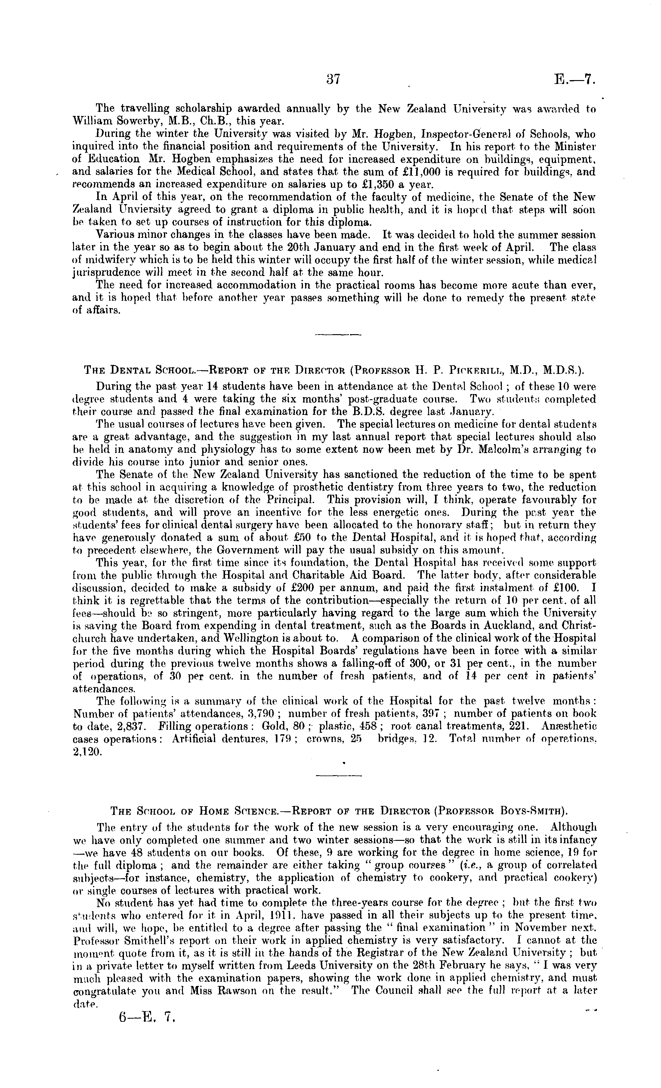 The travelling scholarship awarded annually by the New Zealand University was awarded to William Sowerby, M.8., Ch.B., this year. During the winter the University was visited by Mr. Hogben, Inspector-General of Schools, who inquired into the financial position and requirements of the University. In his report to the Minister of Education Mr. Hogben emphasizes the need for increased expenditure on buildings, equipment, and salaries for the Medical School, and states that the sum of £11.000 is required for buildings, and recommends an increased expenditure on salaries up to £1,350 a year. In April of this year, on the recommendation of the faculty of medicine, the Senate of the New Zealand Cnviersity agreed to grant a diploma in public, health, and it is hoped that steps will soon be taken to set up courses of instruction for this diploma. Various minor changes in the classes have been made. It was decided to hold the summer session later in the year so as to begin about the 20th January and end in the first week of April. The class of midwifery which is to be held this winter will occupy the first half of 1 he winter session, while medical jurisprudence will meet in the second half at the same hour. The need for increased accommodation in the practical rooms has become more acute than ever, and it is hoped that before another year passes something will be dune to remedy the present state of affairs.