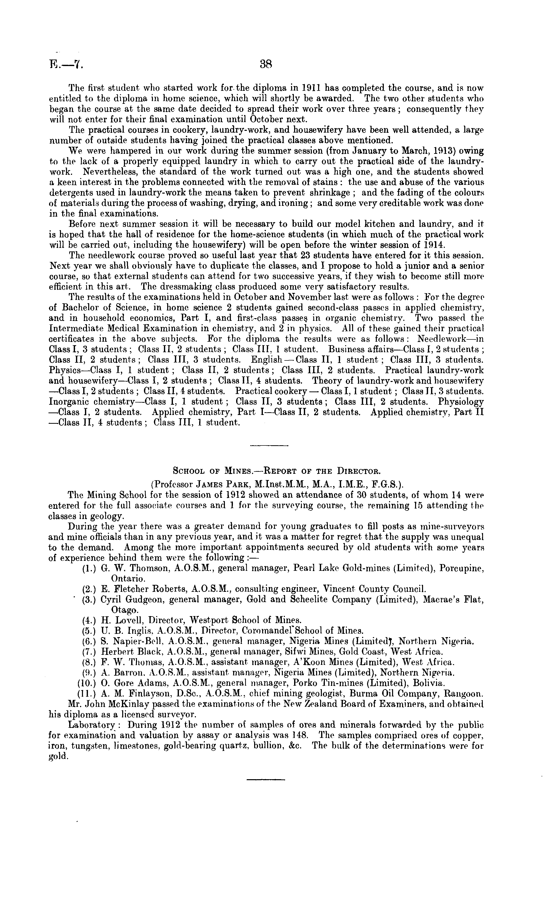 School of Mines.—Report of the Director. (Professor James Park, M.lnst.M.M., M.A., 1.M.E., F.G.S.). The Mining School for the session of 1912 showed an attendance of 30 students, of whom 1 I were entered for the full associate courses and 1 for the surveying course, the remaining 15 attending the classes in geology. During the year there was a greater demand for young graduates to fill posts as mine-surveyors and mine officials than in any previous year, and it was a matter for regret that the supply was unequal to the demand. Among the more important appointments secured by old students with some years of experience behind them were the following : — (1.) G. W. Thomson, A.0.5.M., general manager, Pearl Lake Gold-mines (Limited), Porcupine, Ontario. (2.) E. Fletcher Roberts, A.0.5.M., consulting engineer, Vincent County Council. (3.) Cyril Gudgeon, general manager, Gold and Scheelite Company (Limited), Macrae's Flat, Otago. (4.) H. Lovell, Director, Westport School of Mines. (5.) U B. Inglis. A.0.5.M., Director, Co romandel" School of Mines. (6.) S. Napier-Bell. A.0.5.M.. general manager, Nigeria Mines (Limited}, Northern Nigeria. (7.) Herbert Black, A.0.5.M., general manager, Sifwi Mines. Gold Coast. West Africa. (8.) F. W. Thomas. A.0.5.M., assistant manager, A'Koon Mines (Limited). Wesl Africa. (9.) A. Barron. A.0.5.M., assistant manager, Nigeria Mines (Limited), Northern Nigeria. (10.) 0. Gore Adams, A.0.5.M., general manager, Porko Tin-mines (Limited). Bolivia. (11.) A. M. Finlayson, D.Sc. A.0.5.M., chief mining geologist, Burma Oil Company, Rangoon. Mr. John McKmlay passed the examinations of the New Zealand Board of Examiners, and obtained his diploma as a licensed surveyor. Laboratory: During 1912 the number of samples of ores and minerals forwarded by the public for examination and valuation by assay or analysis was 148. The samples comprised ores of copper, iron, tungsten, limestones, gold-bearing quartz, bullion, &c. The bulk of the determinations were for gold.