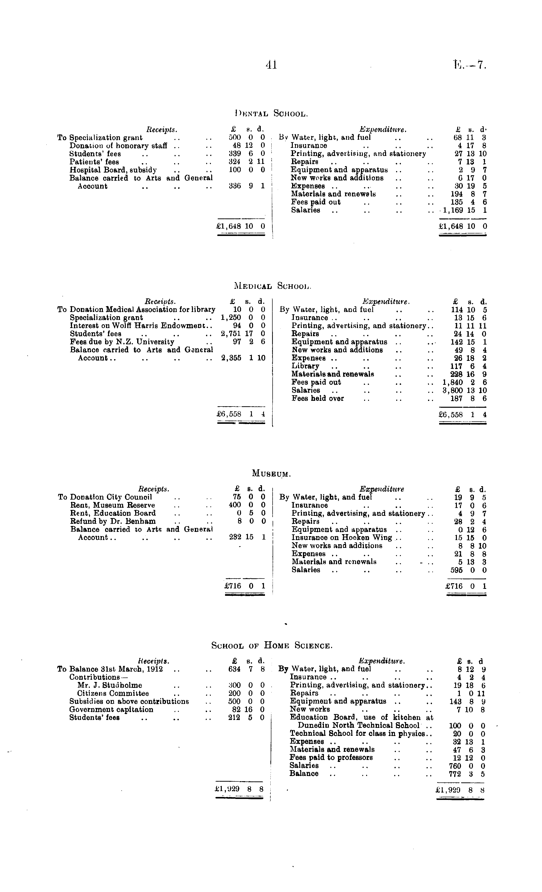 I >ental School. Receipts. £ s. d. Expenditure. t s. dTo Specialization grant .. .. 500 0 0 By Water, light, and fuel .. .. 68 11 3 Donation of honorary staff .. .. 48 12 0 Insurance .. .. .. 417 8 Students' fees .. .. .. 339 6 0 ' Printing, advertising, and stationery 27 13 10 Patients'fees .. .. .. 324 211 Repairs .. .. .. 713 1 Hospital Board, subsidy .. .. 100 0 0 Equipment and apparatus .. '1 9 7 Balance carried to Arts aud General New works and additions .. .. 017 0 Aooount .. .. .. 336 9 1 Expenses .. .. .. .. 30 19 5 Materials and renewals .. .. 194 8 7 Fees paid out .. .. .. 135 4 6 Salaries .. .. .. .. 1,169 15 1 £1,648 10 0 1:1,648 10 0 Medical School. Receipts. £ s. d. Expenditure. £ a. d. To Donation Medical Association for library 10 0 0 By Water, light, aDd fuel .. .. 114 10 5 Specialization grant .. .. 1,250 0 0 Insurance .. .. .. .. 13 15 6 Interest on Wolff Harris Endowment.. 94 0 0 Printing, advertising, and stationery.. 11 11 11 Students'fees .. .. .. 2,75117 0 Repairs .. .. .. .. 24 14 0 Fees due by N.Z. University .. 97 2 6 Equipment and apparatus .. 142 15 1 Balance carried to Arts and General New works and additions .. .. 49 8 4 Account.. .. .. .. 2,355 1 10 Expenses .. .. .. .. 26 18 2 Library .. .. .. .. 117 6 4 Materials and renewals .. .. 228 16 9 Fees paid out .. .. .. 1,840 2 6 Salaries .. .. .. .. 3,800 13 10 Fees held over .. .. .. 187 8 6 £6,558 1 4 £6,558 1 4 Museum. Receipts. £ a. d. Expenditure £ s. d. To Donation City Counoil .. 75 0 0 By Water, light, and fuel .. 19 9 5 Rent, Museum Reserve .. .. 400 0 0 Insurance .. .. 17 0 6 Rent, Education Board .. .. 0 5 0 Printing, advertising, and stationery .. 4 9 7 Refund by Dr. Benham .. .. 8 0 0 Repairs .. .. .. 28 2 4 Balance carried to Arts and General Equipment and apparatus .. 0 12 6 Account.. .. .. .. 282 15 1 Insurance on Hooken Wing .. 15 15 0 New works and additions .. 8 8 10 Expenses .. .. .. .. 21 8 8 Materials and renewals .. . . 513 3 Salaries .. .. .. 598 0 0 £716 0 1 £716 0 1 School of Home Science. Receipts. £ s. d. Expenditure. £ a. d To Balance 31st March, 1912 .. .. 634 7 8 By Water, light, and fuel .. .. 812 9 Contributions— Insurance .. .. .. .. 4 2 4 Mr. J. Btudholme .. .. 300 0 0 Printing, advertising, and stationery.. 19 18 6 Citizens Committee .. .. 200 0 0 Repairs .. .. .. .. 10 11 Subsidies on above contributions .. 500 0 0 Equipment and apparatus .. .. 143 8 9 Government capitation .. .. 82 16 0 New works .. .. .. 710 8 Students'fees .. .. .. 212 5 0 Education Board, use of kitchen at Dunedin North Technical School .. 100 0 0 Technioal School for class in physios.. 20 0 0 Expenses .. .. .. " .. 32 13 1 Materials and renewals .. .. 47 6 3 Fees paid to professors .. .. 12 12 0 Salaries .. .. .. .. 760 0 0 Balance .. .. .. .. 772 3 5 61,929 8 ji • £1,929 8 8