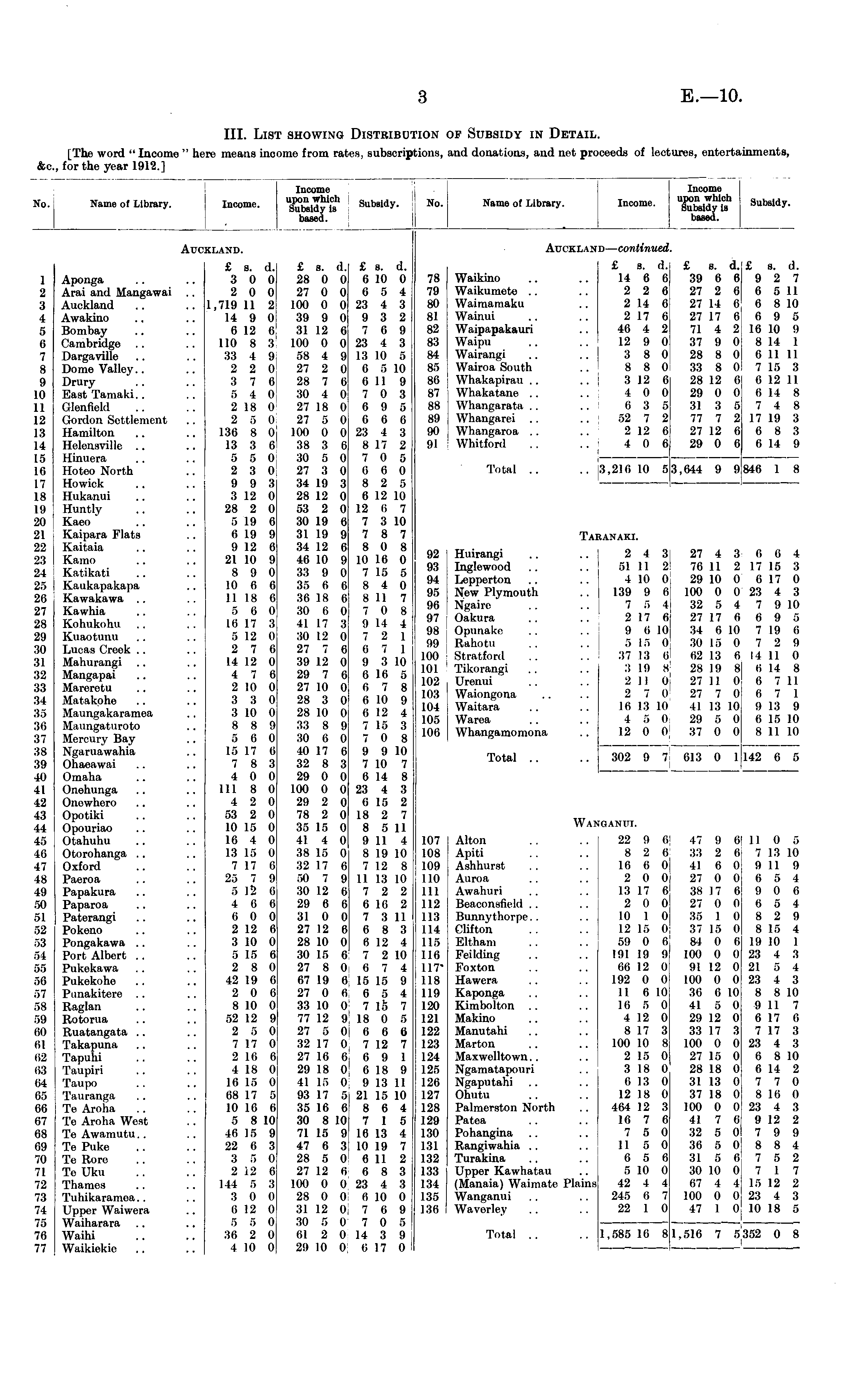 [The word " Income " here means inc &c., for the year 1912.] Illlc rom ral ,oh, sul iscri] ;ions, am lonations, ani not pri >ceei ds of lectures, entertainments, led \u. Name of Library. Income. Income upon which Subsidy is based. No. Name of Library. Income Income. Xtamy'u Subald rbased. Subsidy. Atrci KLAND. Auckland— continued. 1 2 3 4 5 li 7 8 9 Id II 12 IS 11 16 Hi IT 18 lit 20 21 22 23 24 25 26 27 28 29 30 ::i 32 33 ::i :!."> 36 37 38 39 40 u 12 43 II 15 Lβ 17 18 lit 60 51 52 53 51 56 511 57 58 59 60 ill 82 83 64 65 66 (17 68 69 70 71 72 7:i 71 75 711 77 Aponga Arai and Mangawai Auckland Awakino Bombay Cambridge Dargaville Dome Valley.. Drury Eaat Tamaki.. Glenfield Gordon Settlement Hamilton Helensville .. Hinuera Hoteo North Howick Hukanui Hiintly Kaeo Kaipara Flats Kaitaia Kamo Katikati Kaukapakapa Kawakawa .. Kawhia Kohukohu Kuaotunu Lucas Creek .. Mahurangi Mangapai Mareretu Matakpho Maungakaramea Mumgaturoto Mercury Bay Ngaruawahia Ohaeawai Omaha Onehunga Oncwhero Opotiki Opouriao Otahuhu Otorohanga .. Oxford Paeroa Papakura Paparoa Paterangi Pokono Pongakawa .. Port Albert .. Pukekawa Pukekoho Punakitero .. Raglan Rotorua Ruatangata .. Takapuna Tapuhi Taupiri Taupo Tauranga Te Aroha Te Aroha West Te Awamutu.. Te Puke Te Rorc Te Uku Thames Tuhikaramea.. Upper Waiwera Waiharara Waihi Waikiekie £ S. d. 3 0 0 2 0 0 1,719 11 2 14 9 0 6 12 8 110 8 3 33 4 9 2 2 0 3 7 6 r> 4 0 2 18 0 2 r> (i 136 8 0 13 3 6 5 5 0 2 :i 0 9 9 3 3 12 0 28 2 0 5 19 6 0 19 9 9 12 6 21 10 9 8 9 0 10 6 6 11 18 6 5 6 0 Iβ 17 3 5 12 0 2 7 6 14 12 0 4 7 6 2 10 0 3 3 0 3 10 0 8 8 9 5 6 0 15 17 6 7 8 3 4 0 0 111 8 0 4 2 0 53 2 0 10 15 0 16 4 0 13 15 0 7 17 6 25 7 9 6 12 6 4 6 6 6 0 0 2 12 6 :S 10 0 r> 16 (i 2 8 0 42 19 6 2 0 6 8 10 0 52 12 9 2 5 0 7 17 0 2 16 6 4 18 0 Iβ 15 0 68 17 8 10 16 6 5 8 10 46 15 9 22 6 3 3 r> o 2 12 6 144 5 3 3 0 0 (J 12 0 r> 5 o .!(> 2 0 4 10 0 £ s. d. 28 0 0 27 0 0 100 0 0 39 9 0 31 12 6 100 0 0 58 4 9 27 2 0 28 7 6 30 4 0 27 18 0 27 5 0 100 0 0 38 3 6 30 5 0 27 3 0 34 19 3 28 12 0 53 2 0 30 19 6 31 19 9 34 12 6 46 10 9 33 9 0 36 6 6 36 18 6 30 6 0 41 17 3 30 12 0 27 7 6 39 12 (» 29 7 6 27 10 0 28 3 0 28 10 0 33 8 (I 30 6 0 40 17 6 32 8 3 29 0 0 100 0 0 29 2 0 78 2 0 35 15 0 41 4 0 38 16 0 32 17 6 50 7 9 30 12 6 29 6 6 31 0 0 27 12 6 28 10 0 30 16 6 27 8 (I 67 111 (1 27 0 6 33 10 0 77 12 9 27 5 0 32 17 0 27 16 e! 29 18 0 41 15 (I 93 17 6 35 16 6 30 8 10 71 16 9 47 6 3| 28 5 0 27 12 (1 100 0 0 28 0 0 31 12 0; 30 5 (t 111 2 0 29 10 0 £ s. d. 6 10 0 6 5 4 23 4 3 9 3 2 7 6 9 23 4 3 13 10 5 6 6 10 6 119 7 0 3 6 9 5 6 6 6 23 4 3 8 17 2 7 0 5 (> 6 0 8 2 5 6 12 10 12 6 7 7 3 10 7 8 7 8 0 8 10 16 0 7 15 5 8 4 0 8 11 7 7 0 8 9 14 4 7 2 1 (1 7 I 9 3 10 6 16 5 II 7 8 6 10 9 6 12 4 7 15 3 7 0 8 9 9 10 7 10 7 6 14 8 23 4 3 6 15 2 18 2 7 8 5 11 9 11 4 8 19 10 7 12 8 11 13 10 7 2 2 6 1(1 2 7 3 11 6 8 3 6 12 4 7 2 10 6 7 4 15 15 9 6 5 4 7 15 7 18 0 5 6 6 6 7 12 7 6 9 1 6 18 9 9 13 11 21 15 10 8 6 4 7 1 5 16 13 4 10 19 7 6 11 2 6 8 3 23 4 3 6 10 0 7 6 9 7 0 5 14 3 9 r> 17 0 92 93 94 95 96 97 98 99 100 101 102 103 104 105 106 78 79 80 81 82 83 84 85 86 87 88 8!) 90 91 Waikino Waikumete .. Waimamaku Wainui Waipapakauri Waipu Wairangi Wairoa South Whakapirau .. Whakatane . . Whangarata .. Wliangarei Whangaroa .. Wliitford Total .. Tai Huirangi Inglewood Lepperton New Plymouth Ngairc Oakura Opunake Rahotu Stratford Tikorangi Urenui Waiongona Waitara Warea Whangamomona Total .. £ s. d. 14 6 6 2 2 6 2 14 6 2 17 6 46 4 2 12 9 0 3 8 0 8 8 0 3 12 6 4 0 0 6 3 5 52 7 2 2 12 6 4 0 6 .. 3,216 10 5 RANAKI. 2 4 31 27 4 .'! 6 6 4 51 11 2 76 11 2 17 16 :! 4 10 0 29 10 0 6 11 0 139 9 6 100 0 0 23 4 3 7 5 4 32 5 4 7 9 10 2 17 6 27 17 6 6 9 6 9 t> 10 34 6 10 7 19 0 r> I.-. 0 30 18 (» 7 2 9 37 13 6 i>2 13 8 14 11 0 3 19 8 28 lit 8 e 14 8 2110 27 110 6 711 2 7 0 27 7 0 6 7 1 16 13 10 41 13 10 9 13 9 4 5 0 29 5 0 6 15 10 12 0 0 37 0 0 8 11 10 302 9 7 613 0 1 142 6 5 £ s. d. 39 6 6 27 2 6 27 14 6 27 17 6 71 4 2 37 9 0 28 8 0 33 8 0 28 12 6 29 0 0 31 3 5 77 7 2 27 12 6 29 0 6 3,644 9 9 £ s. d. 9 2 7 6 5 11 6 8 10 6 9 5 16 10 9 8 14 1 6 11 11 7 15 3 6 12 11 6 14 8 7 4 8 17 19 3 6 8 3 6 14 9 846 1 8 Wak JGANUI. 107 108 109 110 111 112 113 114 115 116 117118 119 120 121 122 123 124 125 126 127 128 129 130 131 132 133 134 135 138 Alton Apiti Ashhurst Auroa Awahuri Beaconsfield .. Bunnythorpe Clifton Eltham Feilding Foxton Hawera Kaponga Kimbolton Makino Manutahi Marlon Maxwelltown.. Ngamatapouri Ngaputahi Ohutu Palmerston North Patea Pohangina Rangiwahia Turakina Upper Kawhatau (Manaia) Waimate Plains Wanganui Wavorley 22 9 6| 47 » 61 11 0 5 8 2 6 33 2 6 7 13 10 16 6 0 41 6 0 9 11 9 200 27 00 654 13 17 6 38 17 6 9 0 6 200 27 0 0 « 5 4 10 1 0 35 1 0 8 2 9 12 15 0 37 15 0 8 16 4 59 0 6 84 0 6 19 10 1 191 19 9 100 0 0 23 4 3 66 12 0 91 12 0 21 5 4 192 0 0 100 0 0 23 4 3 11 6 10 36 6 10 8 8 10 Iβ 8 0 41 5 0 9 11 7 4 12 0 29 12 0 6 17 6 8 17 3 33 17 3 7 17 3 100 10 8 100 0 0 23 4 3 2 15 0 27 15 0 6 8 10 3 18 0 28 18 0 6 14 2 6 13 0 31 13 0 7 7 0 12 18 0 37 18 0 8 16 0 464 12 3 100 0 0 23 4 3 16 7 6 41 7 6 9 12 2 750 32 50799 11 50 36 50 884 656 31 56752 5 10 0 30 10 0 7 1 7 42 4 4 67 4 4 15 12 2 24f> 6 7 100 0 0 23 4 3 22 1 0 47 1 0 10 18 5 Total 1,585 16 8 1,516 7 5 352 0 8