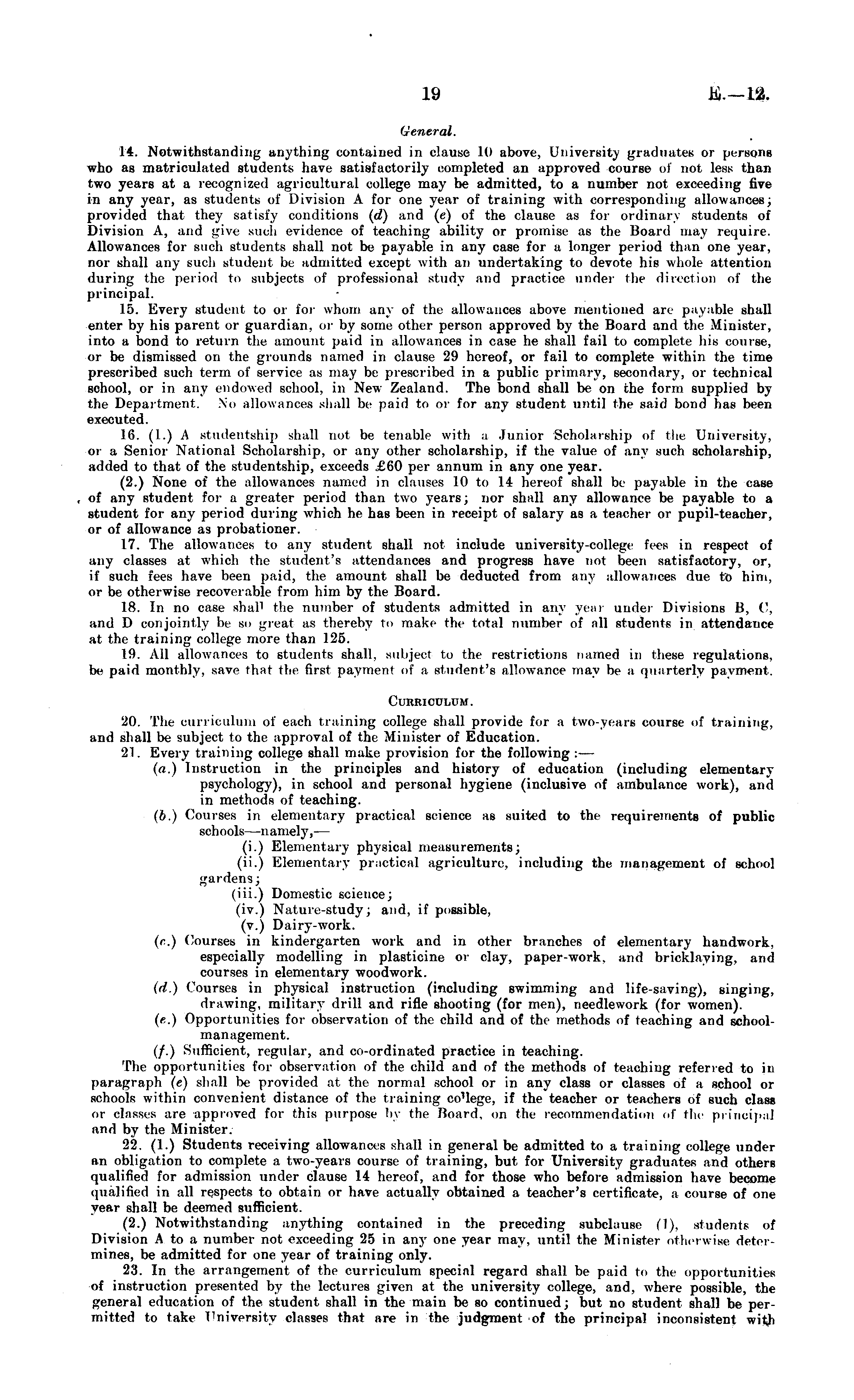 General. 14. Notwithstanding anything contained in clause 10 above, University graduates or persona who as matriculated students have satisfactorily completed an approved course of not less than two years at a recognized agricultural college may be admitted, to a number not exceeding five in any year, as students of Division A for one year of training with corresponding allowances; provided that they satisfy conditions (d) and (e) of the clause as for ordinary students of Division A, and trive such evidence of teaching ability or promise as the Board may require. Allowances for such students shall not be payable in any case for a longer period than one year, nor shall any such student be admitted except with an undertaking to devote his whole attention during the period to subjects of professional study and practice under the direction of the principal. 15. Every student to or for whom any of the allowances above mentioned are payable shall enter by his parent or guardian, or by some other person approved by the Board and the Minister, into a bond to return the amount paid in allowances in case he shall fail to complete his course, or be dismissed on the grounds named in clause 29 hereof, or fail to complete within the time prescribed such term of service as may be prescribed in a public primary, secondary, or technical school, or in any endowed school, in New Zealand. The bond shall be on the form supplied by the Department. No allowances shall be paid to or for any student until the said bond has been executed. 16. (I.) A studentship shall not be tenable with a Junior Scholarship of the University, or a Senior National Scholarship, or any other scholarship, if the value of any such scholarship, added to that of the studentship, exceeds .£60 per annum in any one year. (2.) None of the allowances named in clauses 10 to 14 hereof shall be payable in the case of any student for a greater period than two years; nor shall any allowance be payable to a student for any period during which he has been in receipt of salary as a teacher or pupil-teacher, or of allowance as probationer. 17. The allowances to any student shall not include university-college fees in respect of any classes at which the student's attendances and progress have not been satisfactory, or, if such fees have been paid, the amount shall be deducted from any allowances due to him, or be otherwise recoverable from him by the Board. 18. In no case shall fche number of students admitted in any year under Divisions B, ('. and D conjointly be so great as thereby to make the total number of all students in attendance at the training college more than 125. 19. All allowances to students shall, subject to the restrictions named in these regulations, be paid monthly, save that the first payment of a student's allowance may be a quarterly pavment. Curriculum. 20. The curriculum of each training college shall provide for a two-years course of training, and shall be subject to the approval of the Minister of Education. 21. Every training college shall make provision for the following: — (a.) Instruction in the principles and history of education (including elementary psychology), in school and personal hygiene (inclusive of ambulance work), and in methods of teaching. (b.) Courses in elementary practical science as suited to the requirements of public schools —namely,— (i.) Elementary physical measurements; (li.) Elementary practical agriculture, including the management of school gardens; (iii.) Domestic science; (iv.) Nature-study; and, if possible, (v.) Dairy-work. (c.) Courses in kindergarten work and in other branches of elementary handwork, especially modelling in plasticine or clay, paper-work, and bricklaying, and courses in elementary woodwork. (d) Courses in physical instruction (including swimming and life-saving), singing, drawing, military drill and rifle shooting (for men), needlework (for women). (e..) Opportunities for observation of the child and of the methods of teaching and schoolmanagement. (/.) Sufficient, regular, and co-ordinated practice in teaching. The opportunities for observation of the child and of the methods of teaching referred to in paragraph (e) shall be provided at the normal school or in any class or classes of a school or schools within convenient distance of the training coMege, if the teacher or teachers of such class or classes are approved for this purpose by the Board, on the recommendation of tin- principal and by the Minister. 22. (1.) Students receiving allowances shall in general be admitted to a training college under an obligation to complete a two-years course of training, but. for University graduates and others qualified for admission under clause 14 hereof, and for those who before admission have become qualified in all respects to obtain or have actually obtained a. teacher's certificate, a course of one year shall be deemed sufficient. (2.) Notwithstanding anything contained in the preceding subclause (1). students of Division A to a number not exceeding 25 in any one year may, until the Minister otherwise determines, be admitted for one year of training only. 23. In the arrangement of the curriculum special regard shall be paid to tin opportunities of instruction presented by the lectures jriven at the university college, and, where possible, the general education of the student shall in the main be so continued; but no student shall be permitted to take University classes that are in the judgment of the principal inconsistent with