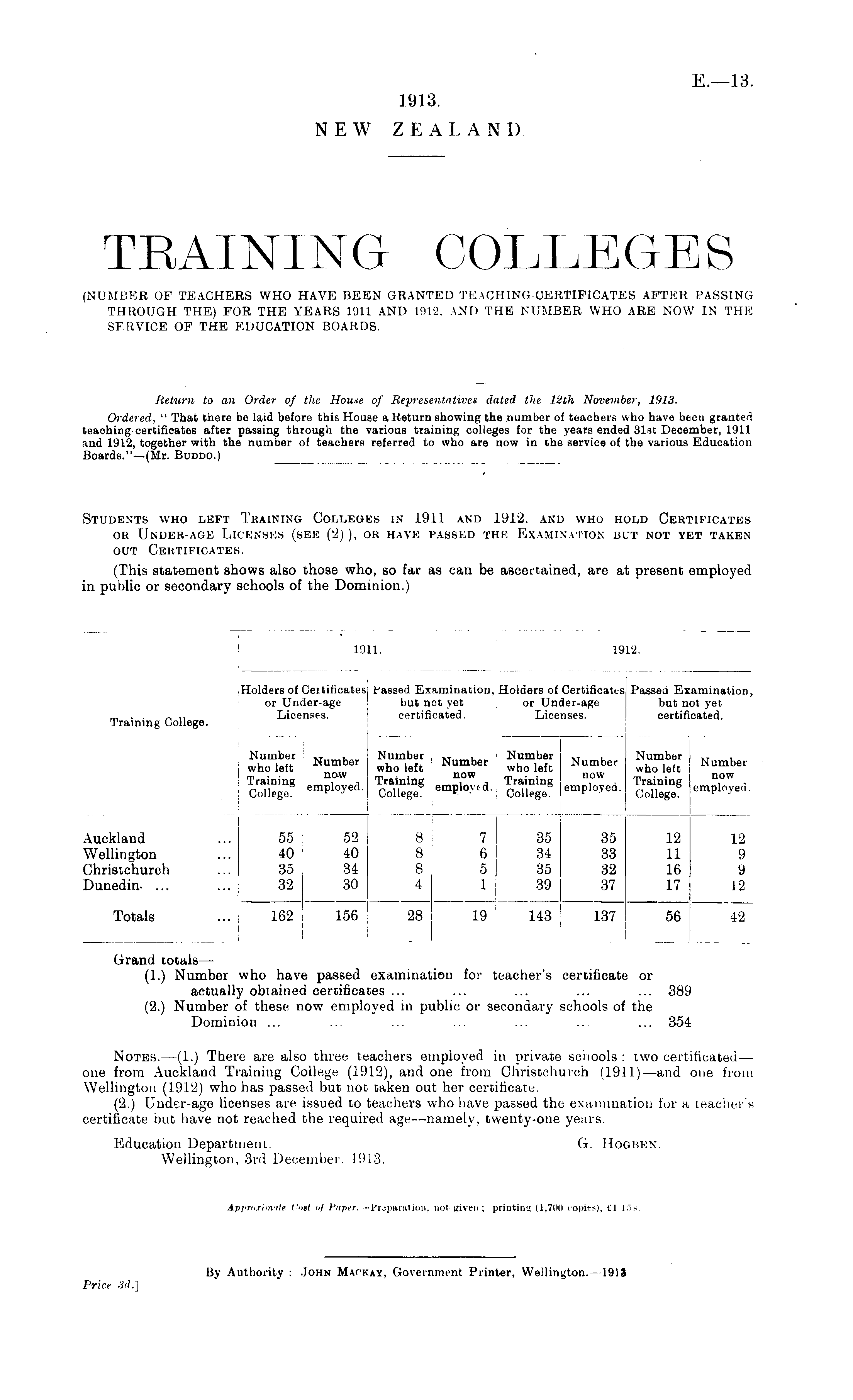 Grand totals — (1.) Number who have passed examination for teacher's certificate or actually obtained certificates ... ... ... ... ... 389 (2.) Number of these now employed in public or secondary schools of the Dominion ... ... ... ... ... ... ... 354 Notes. —(1.) There are also three teachers employed in private schools : two certificated— one from Auckland Training College (1912), and one from Christchurch (1911) —and one from Wellington (1912) who has passed but not taken out her certificate. (2.) Under-age licenses are issued to teachers who have passed the examination for a teacher's certificate but have not reached the required age—namely, twenty-one years. Education Department. G. HoGBEN, Wellington, 3rd December. 1913.