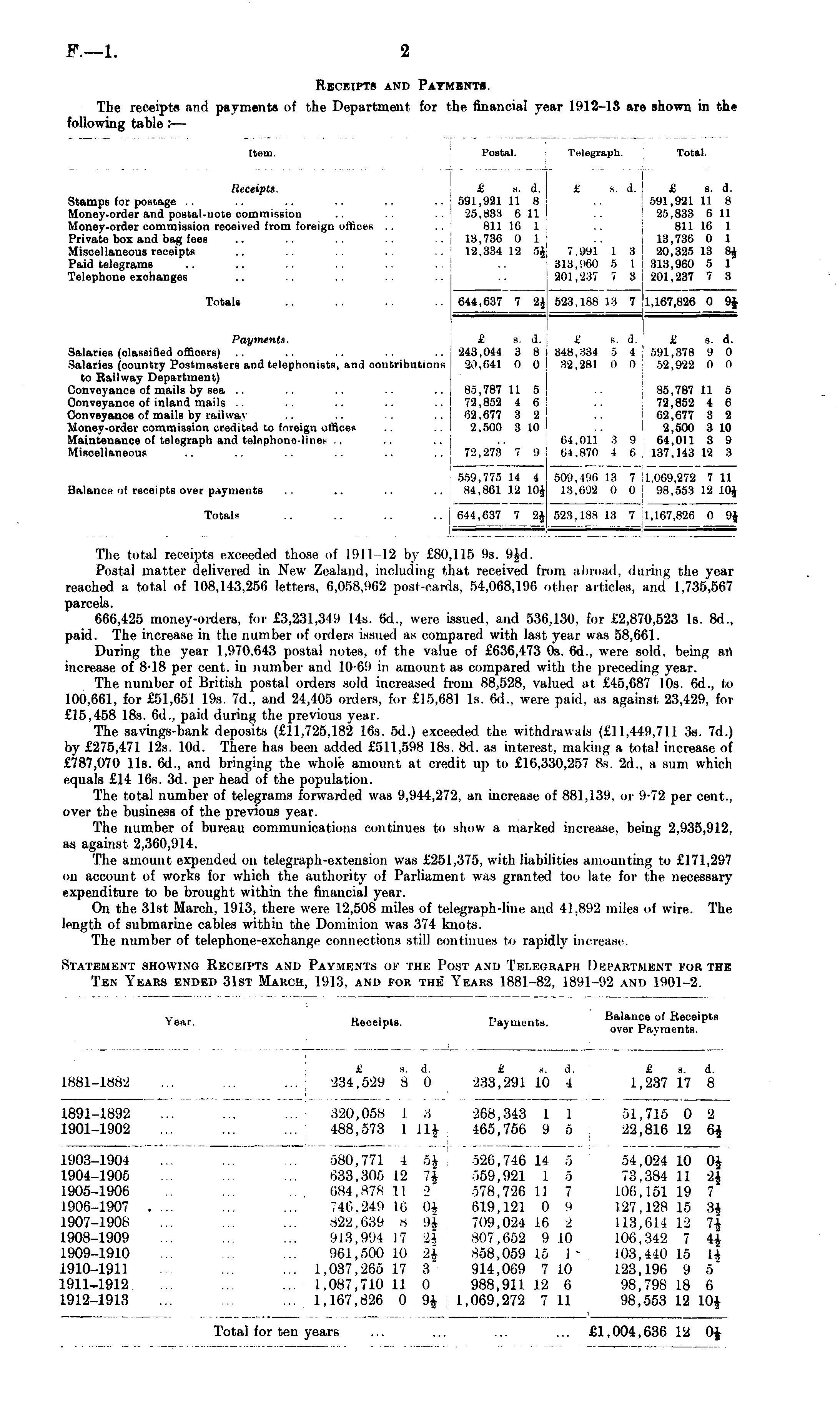 Statement showing Receipts and Payments of the Post and Telegraph Department for the Ten Years ended 31st March, 1913, and for the Years 1881-82, 1891-92 and 1901-2.