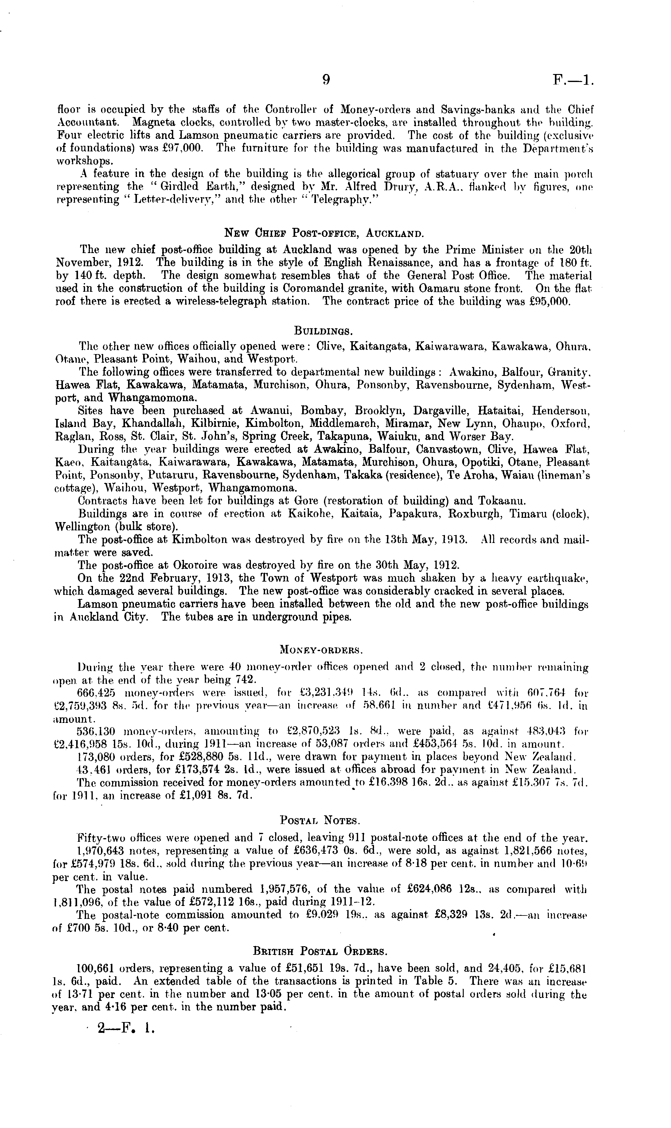 floor is occupied by the staffs of the Controllei of Money-orders unci Savings-banks and the Chief Accountant. Magneta clocks, controlled by fcwo master-clocks, are installed throughout the building. Four electric lifts and Lamson pneumatic carriers are provided. The cost of the building (exclusive of foundations) was £97.000. The furniture for the building was manufactured in the Department's workshops. A feature in the design of the building is the allegorical group of statuary over the main porch representing the "Girdled Earth," designed by -Mr. Alfred Drury, A.H.A.. flanked by figures, one representing " Letter-delivery," and the other " Telegraphy." New Chief Post-office, Auckland. The new chief post-office building at Auckland was opened by the Prime Minister on the 20th November, 1912. The building is in the style of English Renaissance, and has a frontage of 180 ft. by 140 ft. depth. The design somewhat resembles that of the General Post Office. The material used in the construction of the building is Coromandel granite, with Oamaru stone front. On the flat roof there is erected a wireless-telegraph station. The contract price of the building was £95,000. Buildings. The other new offices officially opened were: Clive, Kaitangata, Kaiwarawara, Kavakawa, Ohura, Otane, Pleasant Point, Waihou, and Westport. The following offices were transferred to departmental new buildings : Awakino, Balfour, (iianitv. Hawea Flat, Kawakawa, Matamata, Murchison, Ohura, Ponsonby, Ravensbourne, Sydenham, Westport, and Whangamomona. Sites have been purchased at Awanui, Bombay, Brooklyn, Dargaville, Hataitai, Henderson, Island Bay, Khandallah, Kilbirnie, Kimbolton, Middlemarch, Miramar, New Lynn, Ohaupo. Oxford. Raglan, Ross, St. Clair, St. John's, Spring Creek, Takapuna, Waiuku, and Worser Bay. During the year buildings were erected at Awakino, Balfour, Canvastown, Clive, Hawea Flat, Kaeo, Kaitangata, Kaiwarawara, Kawakawa, Matamata. Murchison, Ohura, Opotiki, Otane, Pleasant Point, Ponsonby, Putaruru, Ravensbourne, Sydenham. Takaka (residence), Te Aroha, Waiau (lineman's cottage), Waihou, Westport, Whangamomona. Contracts have been let for buildings at Gore (restoration of building) and Tokaanu. Buildings are in course of erection at Kaikohe, Kaitaia, Papakura. Roxburgh, Timaru (clock). Wellington (bulk store). The post-office at Kimbolton was destroyed by fire on the 13th May, 1013. All records and mailmatter were saved. The post-office, at Okoroire was destroyed by fire on the 30th May, 1912. On the 22nd February, 1913, the Town of Westport was much shaken by a heavy earthquake, which damaged several buildings. The new post-office was considerably cracked in several places. Lamson pneumatic carriers have been installed between the old and the new post-office buildings in Auckland City. The tubes are in underground pipes. MoNKY-ORDERS. During the year then' were 10 money-order offices opened and '2 dosed, the number remaining open ai the end of the year being 742. 666.425 money-orders were issued, for £3,231.319 Ms. 6d., as compared with 607,764 Eor £2,759,393 Bs. sd. for the previous year- an increase of 58,661 in number and £471,956 'is. Id. in amount . 536.130 money-orders, amounting bo £2,870,523 Is. Bd., were paid, as against 483,043 for £2,416,958 15s. LOd., during 1911- an increase of 53.087 orders and £463,564 ss. Kid. in i m. 173,080 orders, for £528,880 ss. lid., were drawn Eor payment in places beyond New Zealand. 13. 161 orders, for £173,574 2s. Id., were issued at ofliees abroad for payment in Xew Zealand. The commission received for money-orders amounted to £16.398 16s. 2d.. as against £15.307 7s. 7d. lor 191 I. an increase of £1,091 Bs. 7d. Postal Notes. Fifty-two offices were opened and 7 closed, leaving 91 I postal-note offices at the end of the year. 1.970,643 notes, representing a value of £636,473 os. 6d., were sold, as against 1,821.566 notes. tor £571.979 18s. 6d., sold during the previous year —an increase of 8-18 per cent, in number and 10-69 per cent, in value. The postal notes paid numbered 1,957,576, of the value of £624,086 125.. as compared with 1.81 1,096. of the value of £572,112 165., paid during 191M2. The postal-note commission amounted to £9.029 195.. as against £8,329 13s. 2d. —an increase of £700 ss. lOd., or 8-40 per cent. British Postal Orders. 100,661 orders, representing a value of £51,651 19s. 7d., have been sold, and 24,405, for £15,681 Is. Gd., paid. An extended table of the transactions is printed in Table 5. There was an increase of 13-71 per cent, in the number and 13-05 per cent, in the amount of postal orders sold during the year, and 4-16 per cent, in the number paid.