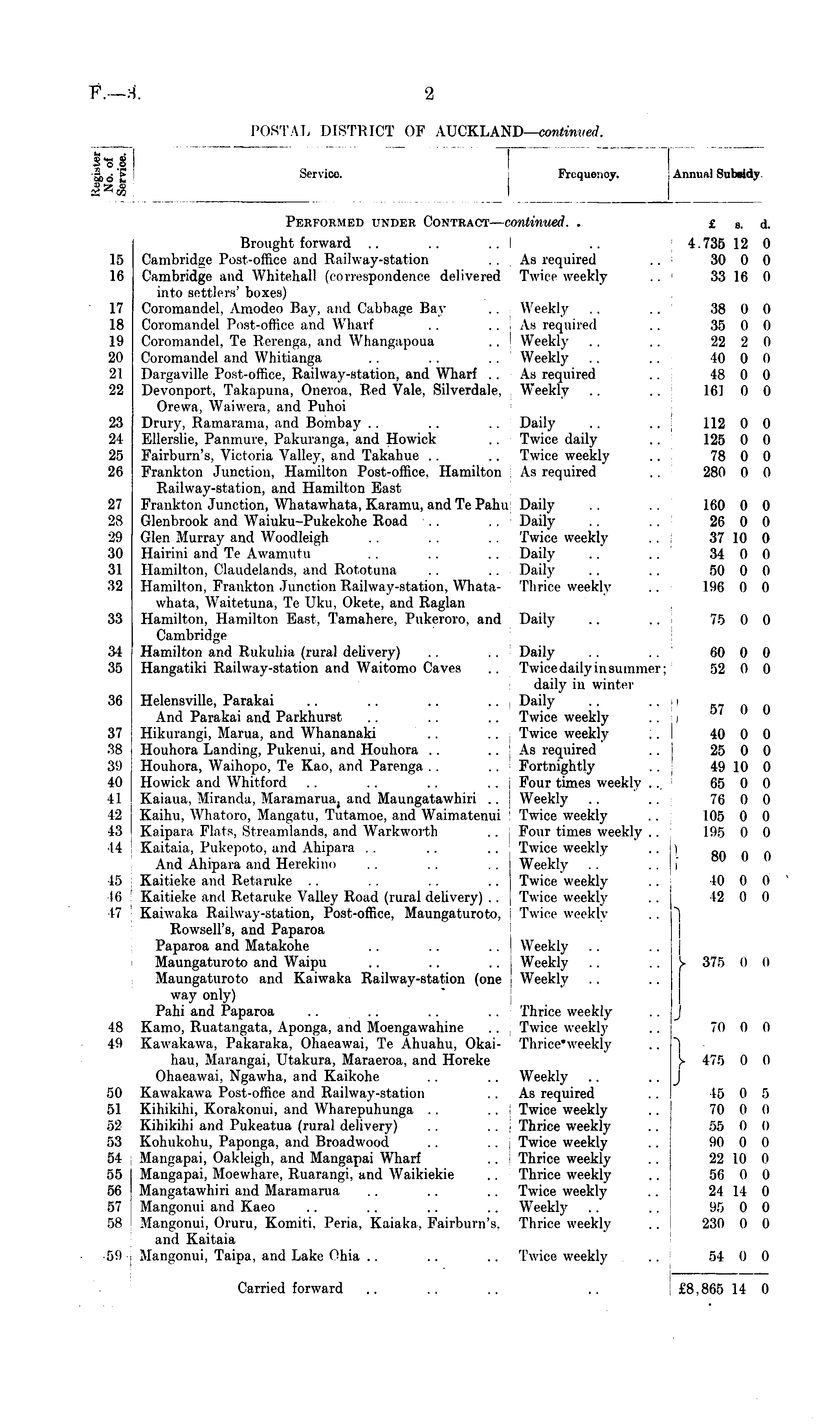 fail t<Oh paljl j) .j > Service. Frequenoy. , Annual Subsidy I Performed under Contract— continued. . £ s. d. Brought forward .. .. ..I .. 4.735 12 0 15 Cambridge Post-office and Railway-station . . As required .. : 30 0 0 16 Cambridge and Whitehall (correspondence delivered Twice weekly . . 33 16 0 into settlers' boxes) 17 Coromandel, Amodeo Bay, and Cabbage Bay . . Weekly . . .. 38 0 0 18 Coromandel Post-office and Wharf .. As required .. 35 0 0 19 Coromandel, Te Rerenga, and Whangapoua Weekly .. .. 22 2 0 20 Coromandel and Whitianga .. . . . . Weekly . . .. I 40 0 0 21 Dargaville Post-office, Railway-station, and Wharf .. As required .. 48 0 0 22 Devonport, Takapuna, Oneroa. Red Vale, Silverdale. Weekly .. .. 161 0 0 Orewa, Waiwera. and Puhoi 23 Drury, Ramarama, and Bombay .. .. .. Daily .. .. j 112 0 0 24 Ellerslie, Panmure, Pakuranga, and H ow i c k • • Twice daily .. 125 0 0 25 Fairburn's, Victoria Valley, and Takahue .. . . Twice weekly .. 78 0 0 26 Frankton Junction, Hamilton Post-office, Hamilton As required .. 280 0 0 Railway-station, and Hamilton East 27 Frankton Junction, Whatawhata, Karamu, and Te Palm Daily .. 160 0 0 28 Glenbrook and Waiuku-Pukekohe Road •.. .. Daily .. .. 26 0 0 29 Glen Murray and Woodleigh .. .. .. Twice weekly .. 37 10 0 30 Hairini and Te Awamutu .. .. Daily .. .. 310 0 31 Hamilton, Claudelands, and Rototuna .. .. Daily . . .. 50 0 0 32 Hamilton, Frankton Junction Railway-station, Whata- Thrice weekly .. HKi 0 0 whata, Waitetuna, Te Uku, Okete, and Raglan 33 Hamilton, Hamilton East, Tamahere, Pukeroro. and Daily .. .. 75 0 0 Cambridge 34 Hamilton and Rukuhia (rural delivery) .. .. Daily .. .. 60 0 0 35 Hangatiki Railway-station and Waitomo Caves .. Twicedailyinsummcr: 52 0 0 daily in winter 36 Helensville, Parakai .. .. .. .. Daily .. .. j __ . n And Parakai and Parkhurst .. .. .. Twice weekly .. j 37 Hikurangi, Marua, and Whananaki . . .. Twice weekly 40 0 0 38 Houhora Landing, Pukenui, and Houhora .. As required .. 25 0 0 ,'i'- 1 Houhora, Waihopo, Te Kao. and Parenga .. Fortnightly .. 49 10 0 40 Howick and Whitford .. .. .. Four times weekly .. 65 0 0 41 Kaiaua, Miranda, Maramarua. and Maungatawhiri .. ! Weekly .. .. 76 0 0 42 Kaihu, Whatoro, Mangatu, Tutamoe, and Waimatenui Twice weekly .. 105 0 0 43 Kaipara Flats, Streamlands, and Warkworth Four times weekly .. 195 0 0 11 Kaitaia, Pukepoto, and Ahipara .. .. .. Twice weekly .. [j an n n And Ahipara and Herekino .. .. .. Weekly 15 Kaitieke and Retaruke .. .. .. .. Twice weekly 40 0 0 Hi Kaitieke and Retaruke Valley Road (rural delivery) . . Twice weekly .. 12 0 0 17 Kaiwaka Railway-station, Post-office, Maungaturoto, Twice weekly .. "] Rowsell's, and Paparoa Paparoa and Matakohe . . . . .. Weekly Maungaturoto and Waipu .. .. Weekly . . ■ ■ Y 375 0 II Maungaturoto and Kaiwaka Railway-station (one : Weeklv way only) Pahi and Paparoa .. .. .. . . Thrice weekly .. J 48 Kamo, Ruatangata, Aponga, and Moengawahine .. Twice weekly .. "(I 0 (I 49 Kawakawa, Pakaraka, Ohaeawai, Te Ahuahu, Okai- Thrice'weekly •• "1 hau, Marangai, Utakura, Maraeroa, and Horeke y 475 0 0 Ohaeawai, Ngawha, and Kaikohe .. .. Weekly .. • • J 50 Kawakawa Post-office and Railway-station .. As required .. 15 0 5 51 Kihikihi, Korakonui, and Wharepuhunga .. ..I Twice weekly .. 70 0 0 52 Kihikihi and Pukeatua (rural delivery) .. Thrice weekly . . 55 0 0 53 Kohukohu, Paponga, and Broadwood .. Twice weekly . . 90 0 0 54 Mangapai, Oakleigh, and Mangapai Wharf .. Thrice weekly 22 10 0 55 Mangapai, Moewhare, Ruarangi, and Waikiekie .. Thrice weekly .. 56 0 0 56 Mangatawhiri and Maramarua .. .. .. Twice weekly .. 24 14 0 57 Mangonui and Kaeo .. .. .. .. Weekly .. .. 96 0 0 58 Mangonui, Oruru, Komiti. Peria, Kaiaka, Fairburn's. Thrice weeklv .. 230 0 0 and Kaitaia ■59 Mangonui, Taipa, and Lake Ohia .. .. .. Twice weekly .. 54 (J 0 16 16 17 18 19 20 21 22 23 24 25 26 27 28 29 30 31 32 S3 31 35 36 37 38 39 in •II 12 43 14 15 16 47 Carried forward .. .. .. .. ; £8,865 14 0 £8.865 14 0