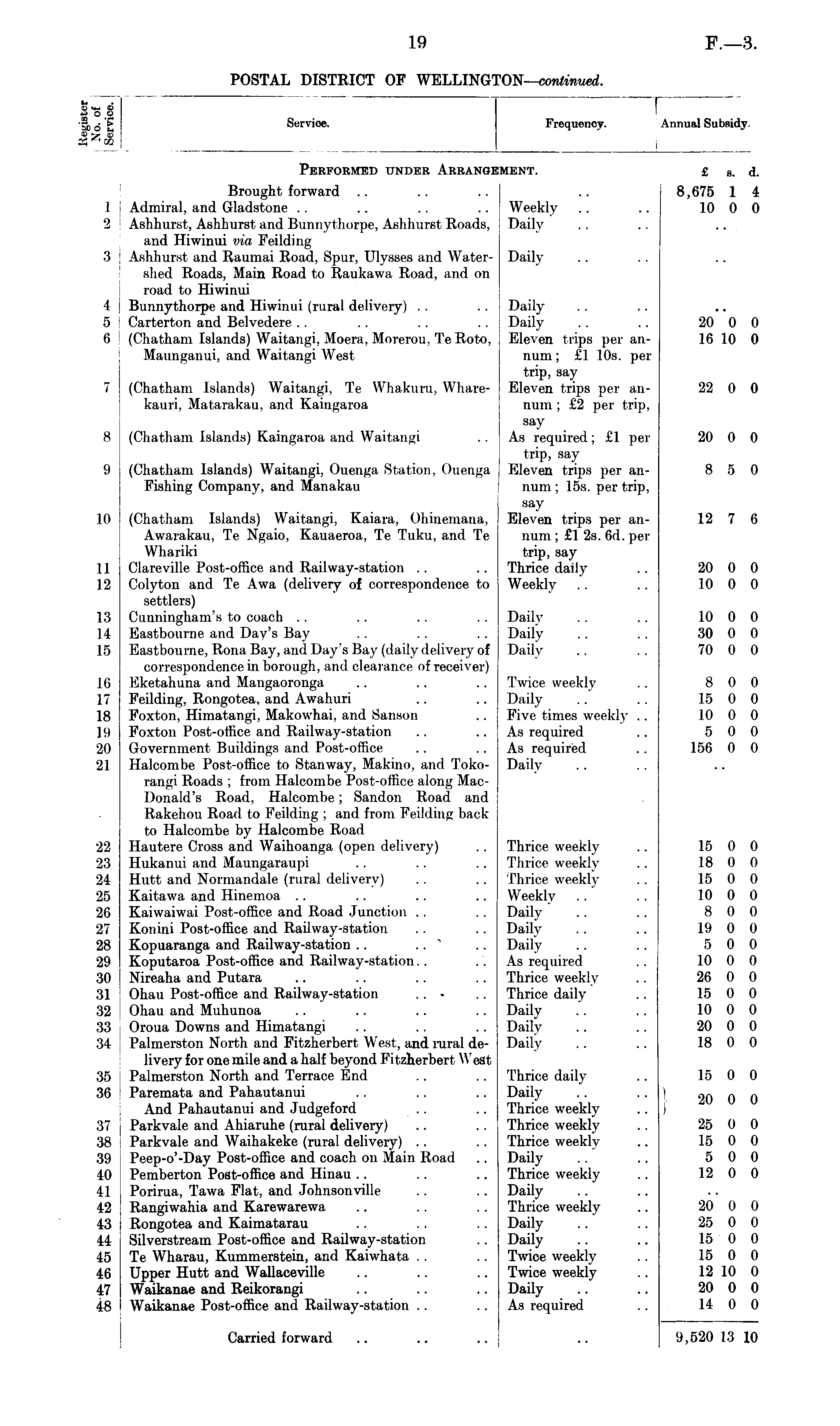 u •J ■— Cj *a O O 33 •£- 'jdS Service. Frequency. Annual SubsidyPerformed under Arrange: tENT. £ s. d. Brought forward Admiral, and Gladstone Ashhurst, Ashhurst and Bunnythorpe, Ashhurst Roads, and Hiwinui via Feilding Ashhurst and Raumai Road, Spur, Ulysses and Watershed Roads, Main Road to Raukawa Road, and on road to Hiwinui Bunnythorpe and Hiwinui (rural delivery) Carterton and Belvedere (Chatham Islands) Waitangi, Moera, Morerou, TeRoto, Maunganui, and Waitangi West Weekly Daily 8,675 1 10 0 4 0 I •j 3 Daily I 5 6 Daily Daily Eleven trips per annum ; £1 10s. per trip, say Eleven trips per annum ; £2 per trip, 20 0 16 10 0 0 7 (Chatham Islands) Waitangi, Te Whakuru, Wharekauri, Matarakau, and Kaingaroa 22 0 0 8 (Chatham Islands) Kaingaroa and Waitangi say As required; £1 per trip, say Eleven trips per annum ; 15s. per trip, 20 0 0 9 (Chatham Islands) Waitangi, Ouenga Station, Ouenga Wishing Company, and Manakau 8 5 0 10 (Chatham Islands) Waitangi, Kaiara, Ohinemana, Awarakau, Te Ngaio, Kauaeroa, Te Tuku, and Te Whariki Clareville Post-office and Railway-station Colyton and Te Awa (delivery of correspondence to settlers) Cunningham's to coach Eastbourne and Day's Bay Eastbourne, Rona Bay, and Day's Bay (daily delivery of correspondence in borough, and clearance of receiver) Eketahuna and Mangaoronga Feilding, Rongotea, and Awahuri Foxton, Himatangi, Makowhai, and Sanson Foxton Post-office and Railway-station Government Buildings and Post-office Halcombe Post-office to Stanway, Makino, and Tokorangi Roads ; from Halcombe Post-office along MacDonald's Road, Halcombe; Sandon Road and Rakehou Road to Feilding ; and from Feilding back to Halcombe by Halcombe Road Hautere Cross and Waihoanga (open delivery) Hukanui and Maungaraupi Hutt and Normandale (rural delivery) Kaitawa and Hinemoa Kaiwaiwai Post-office and Road Junction Konini Post-office and Railway-station Kopuaranga and Railway-station .. .. ■" Koputaroa Post-office and Railway-station Nireaha and Putara Ohau Post-office and Railway-station . . - Ohau and Muhunoa Oroua Downs and Himatangi Palmerston North and Fitzherbert West, and rural delivery for one mile and a half beyond Fitzherbert West Palmerston North and Terrace End Paremata and Pahautanui And Pahautanui and Judgeford Parkvale and Ahiaruhe (rural delivery) Parkvale and Waihakeke (rural delivery) Peep-o'-Day Post-office and coach on Main Road Pemberton Post-office and Hinau Porirua, Tawa Flat, and Johnsonville Rangiwahia and Karewarewa Rongotea and Kaimatarau Silverstream Post-office and Railway-station Te Wharau, Kummerstein, and Kaiwhata Upper Hutt and Wallaceville Waikanae and Reikorangi Waikanae Post-office and Railway-station say Eleven trips per annum ; £1 2s. 6d. per trip, say Thrice daily Weekly 12 7 6 II 12 20 0 10 0 0 0 13 II 15 Dailv Daily Daily 10 0 30 0 70 0 0 0 0 16 17 18 19 20 21 Twice weekly Daily Five times weeklv . . As required As required Daily 8 0 15 0 10 0 5 0 156 0 0 0 0 0 0 22 23 21 25 26 27 28 29 30 31 32 33 34 Thrice weekly Thrice weekly Thrice weekly Weekly Daily ' .. Dailv Daily As required Thrice weekly Thrice daily Daily Dailv Daily 15 0 18 0 15 0 10 0 8 0 19 0 5 0 10 0 26 0 15 0 10 0 20 0 18 0 0 0 0 0 0 0 0 0 0 0 0 0 0 35 36 Thrice daily Daily Thrice weekly Thrice weekly Thrice weeklv Daily Thrice weekly Daily Thrice weekly Daily Daily Twice weekly Twice weekly Daily As required ) I 15 0 20 0 0 0 37 38 39 10 II 42 43 11 45 46 47 18 25 0 15 0 5 0 12 0 20 0 25 0 15 0 15 0 12 10 20 0 14 0 0 0 0 0 0 0 0 0 0 0 0 Carried forward 9,520 13 10