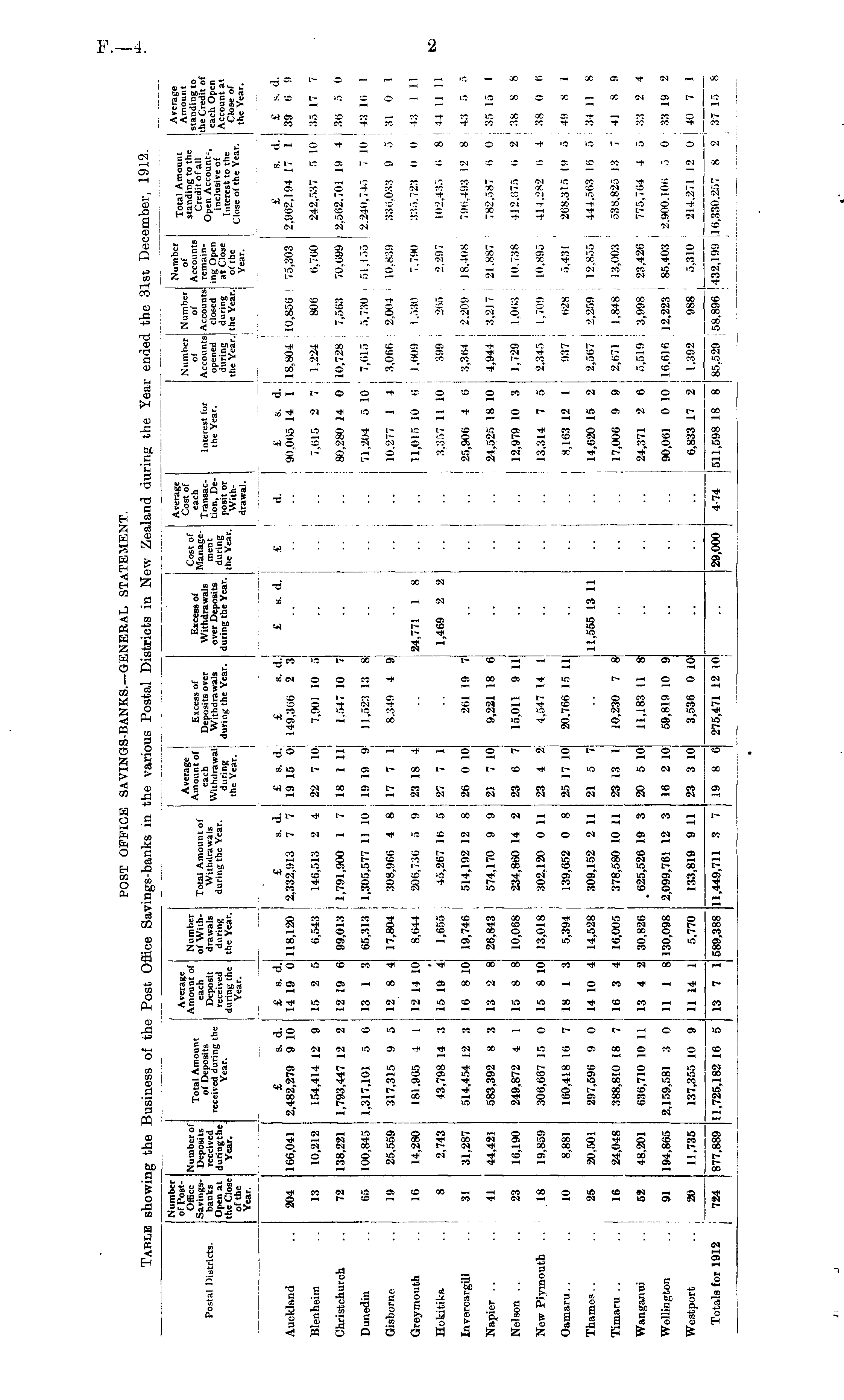 Postal Districts. Number of Savingsbanks Open at the Close of the Year. Number of Deposits received duringthe Year. Total Amount of Deposits received during the Year. Average Amount of each Deposit received during the Year. Number of Withdrawals during the Year. Total Amount of Withdrawals during the Year. Average Amount of each Withdrawal during the Year. Excess of Deposits over Withdrawals during the Year. Excess of Withdrawals over Deposits during the Year. Cost of Management during the Year. Average Number _ . Amonn , Average Cost of Number Number of s ™ din E to the Amount each of of Accounts c" dit g o f a i stand '"S"> Transac- Interest for Accounts Accounts remain- fWn Arrniinr ■ the Credit of tion, De- the Year. opened closed ing Open P in " ,„"""{ ' ™ch Open posit or during during at Close I „,.„,. to the Account at 'With- the Year, the Yea, of the <££?*?&. Close of drawal. Year. the Year. I I £ I I I I d. £ s. d. £ s. d. £ 8. 1. 90,065 14 1 18,804 10,856 75,303 2,962,104 IT 1 39 6 9 7,615 2 7 j 1,224 806 6,760 242,537 6 10 36 17 7 £ s. d. 2,482,279 9 10 £ s. d. 14 19 0 118,120 £ s. d. 2,332,913 7 7 £ S. d.' 19 15 0: £ s. d. 149,366 2 3 £ s. d. Auckland .. 204 166,041 Blenheim .. 13 10,212 154,414 12 9 15 2 5 6,543 146,513 2 4 22 7 10; 7,901 10 5 Christchurch .. 72 138,221 1,793,447 12 2 12 19 6 99,013 1,791,900 1 7 18 1 11 1..547 10 7 • I 80,280 14 0 10,728! 7,563 70,699 2,562.7(1] 19 4 :!»> 5 0 Dunedin .. i 65 100,845 1,317,101 5 6 13 1 31 65,313 1,305,577 11 10 19 19 d' 11,523 13 8 •■ i 71,204 5 10 ( 7,615 5,730 51,155 i 2,240,746 7 10 43 16 1 10 277 1 4 3,066 2,004 10,839 336,033 9 •"> 31 0 1 11,015 10 ii : 1,609 1,530 7,790 335,723 <i 0 43 ! 11 Gisborno .. 19 25.559 317,315 9 5 12 8 4 17,804 308,966 4 8 17 7 1 8,349 4 9 Grey mouth .. 16 14,280 181.905 4 I 12 14 10 8.644 206,730 5 9 23 18 4 24,771 1 8 Hokitika .. 8 2,743 43,798 14 3 15 19 4 1,655 45,267 16 5 27 7 1 1,469 2 2 3,857 II 10 399 265 2.2<)7 102,436 6 8 4+ II 11 25,906 4 6 3,364 2,209 18,408 796,493 12 $ 4:; 5 5 24,525 18 10 4,944 3,217 2I.8.ST 782,587 6 0 35 15 I 12,979 10 3 1.729 1,063 10,738 412,675 6 2 38 8 8 Invercargill .. 31 31,287 514,454 12 3 16 8 10 19,746 514,192 12 8 26 0 10 1 261 19 7 Napier .. .. 41 44,421 583,392 8 3 13 2 e| 26,843 574,170 9 9 21 7 10 9,221 18 e| Nelson .. .. 23 16,190 249,872 4 1 15 8 8 10,068 234,860 14 2 23 6 7 15,011 9 11 New Plymouth .. 18 19,859 306,667 15 0 15 8 10 13,018 302,120 0 11 23 4 2 4.547 14 ll ' 1:5,314 7 5 j 2;345 1,709 10,895 414,282 6 4 MS 0 6 Oamaru.. .. 10 8,881 160,418 16 7 18 1 3 5,394 139,652 0 8 25 17 10 20.766 15 11 s 163 12 1 i>37 628 .'>.4:il 268,315 19 6 19 8 I I Thames.. . . 25 20,501 297,596 9 0 14 10 4 14,528 309,152 2 11 21 5 7 11,566 13 11 ! 14,620 15 2 2,567 2.25!) 12,855 444,563 16 5 34 11 S 1 Timaru .. .. 16 24,048 388,810 18 7 16 3 4 16,005 378,580 10 11 23 13 1 10,230 7 8| 17,006 9 9 2,671 j 1,848 13,003 638,825 13 7 41 8 9 Wanganui .. 52 48.201 636,710 10 11 13 4 2 30,826 m 625,526 19 3 20 5 10 11,183 II 8 24,371 2 6 5,519 \ 3,998 23,426 775,764 4 5 33 2 4 Wellington .. 91 194,865 2,159,581 3 0 11 1 8 130,098 2,099,761 12 3 16 2 10 59,819 10 9 90,061 0 10 16,616 12,223 86,403 2,900,106 5 0 33 L9 2 Westport . . 20 Totals for 1912 724 11,735 137,355 10 9 11 14 1 5,770 133,819 9 11 23 3 10 3,536 0 10 6,833 17 2 1,392 988 .3.310 214.271 12 0 40 7 1 877,889 11,725,182 16 5 13 7 1 589,388 11,449,711 3 7 19 8 6 275,471 12 10] 29,000 4-74 511,598 18 8 85.529 58.896 432.1 99 16,330,267 8 2 37 15