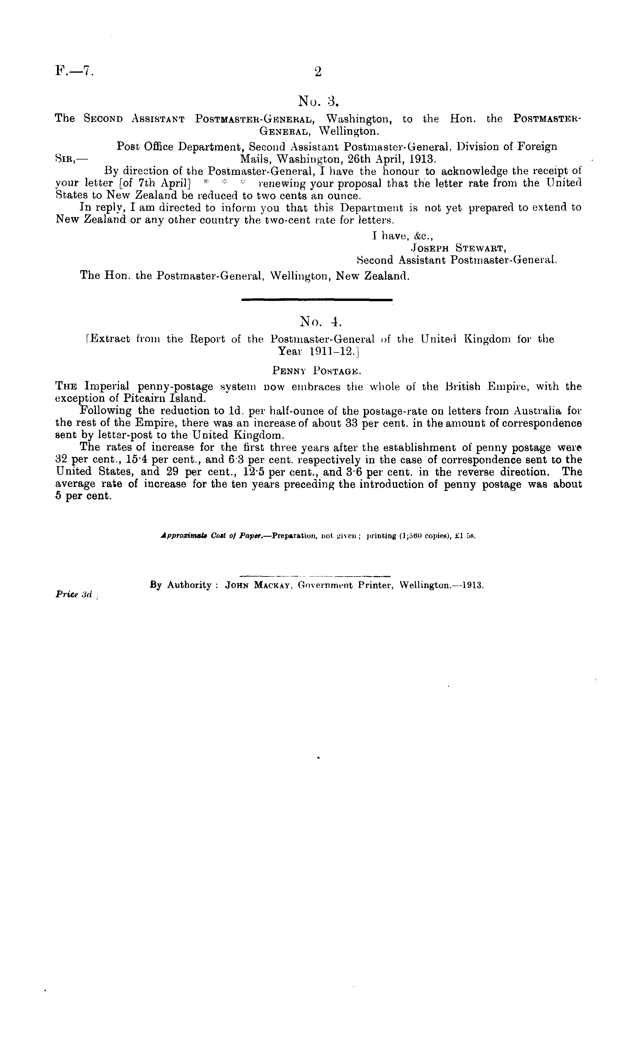 No. 3. The Second Assistant Postmaster-General, Washington, to the Hon. the PostmasterGeneral, Wellington. Post Office Department, Second Assistant Postmaster-General, Division of Foreign Sir,— Mails, Washington, 26th April, 1913. By direction of the Postmaster-General, I have the honour to acknowledge the receipt of your letter [of 7th April] * * * renewing your proposal that the letter rate from the United States to New Zealand be reduced to two cents an ounce. In reply, I am directed to inform you that this Department is not yet prepared to extend to New Zealand or any other country the two-cent rate for letters. I have, &c, Joseph Stewart, Second Assistant Postmaster-General. The Hon. the Postmaster-General, Wellington, New Zealand.