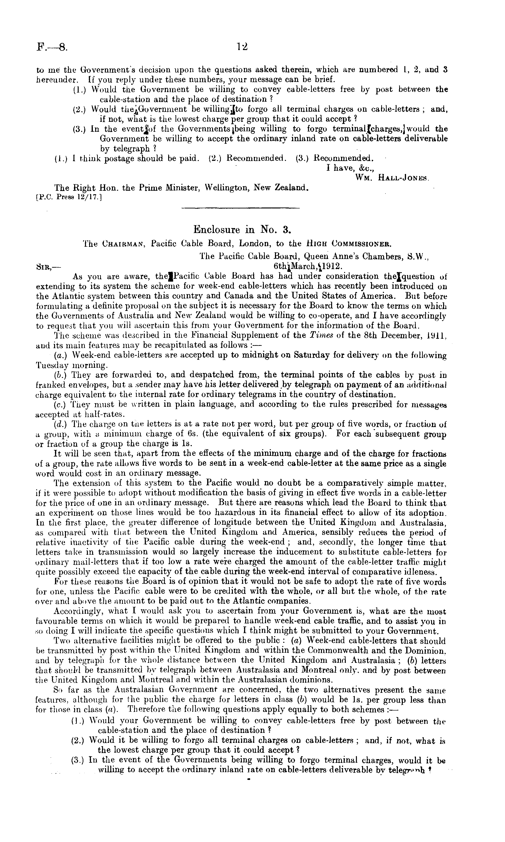 Enclosure in No. 3. The Chairman, Pacific Cable Board, London, to the High Commissioner. The Pacific Cable Board, Queen Anne's Chambers, S.W., Sir,— 6thiMarch,*T9l2. As you are aware, theJPacific Cable Board has had under consideration thejquestion of extending to its system the scheme for week-end cable-letters which has recently been introduced on the Atlantic system between this country and Canada and the United States of America. But before formulating a definite proposal on the subject it is necessary for the Board to know the terms on which the Governments of Australia and New Zealand would be willing to co-operate, and I have accordingly to request that you will ascertain this from your Government for the information of the Board. The scheme was described in the Financial Supplement of the Times of the Bth December, 1911, and its main features may be recapitulated as follows :— (a.) Week-end cable-letters are accepted up to midnight on Saturday for deliver}' on the following Tuesday morning. (b.) They are forwarded to, and despatched from, the terminal points of the cables by post in franked envelopes, but a sender may have his letter delivered by telegraph on payment of an additional charge equivalent to the internal rate for ordinary telegrams in the country of destination. (c.) They must be written in plain language, and according to the rules prescribed for messages accepted at half-rates. (d.) The charge on the letters is at a rate not per word, but per group of five words, or fraction of a group, with a minimum charge of 6s. (the equivalent of six groups). For each subsequent group or fraction of a group the charge is Is. It will be seen that, apart from the effects of the minimum charge and of the charge for fractions of a group, the rate allows five words to be sent in a week-end cable-letter at the same price as a single word would cost in an ordinary message. The extension of this system to the Pacific would no doubt be a comparatively simple matter, if it were possible to adopt without modification the basis of giving in effect five words in a cable-letter for the price of one in an ordinary message. But there are reasons which lead the Board to think that an experiment on those lines would be too hazardous in its financial effect to allow of its adoption. In the first place, the greater difference of longitude between the United Kingdom and Australasia, as compared with that between the United Kingdom and America, sensibly reduces the period of relative inactivity of the Pacific cable during the week-end ; and, secondly, the longer time that letters take in transmission would so largely increase the inducement to substitute cable-letters for ordinary mail-letters that if too low a rate were charged the amount of the cable-letter traffic might quite possibly exceed the capacity of the cable during the week-end interval of comparative idleness. For these reasons the Board is of opinion that it would not be safe to adopt the rate of five words for one, unless the Pacific cable were to be credited with the whole, or all but the whole, of the Tate over and above the amount to be paid out to the Atlantic companies. Accordingly, what I would ask you to ascertain from your Government is, what are the most favourable terms on which it would be prepared to handle week-end cable traffic, and to assist you in so doing I will indicate the specific questions which I think might be submitted to your Government. Two alternative facilities might be offered to the public : {a) Week-end cable-letters that should be transmitted by post within the United Kingdom and within the Commonwealth and the Dominion. and by telegraph for the whole distance between the United Kingdom and Australasia ; (b) letters that should be transmitted by telegraph between Australasia and Montreal only, and by post between the United Kingdom and Montreal and within the Australasian dominions. So far as the Australasian Government are concerned, the two alternatives present the same features, although for the public the charge for letters in class (&) would be Is. per group less than for those in class (a). Therefore the following questions apply equally to both schemes :— (I.) Would your Government be willing to convey cable-letters free by post between the cable-station and the place of destination ? (2.) Would it be willing to forgo all terminal charges on cable-letters ; and, if not, what is the lowest charge per group that it could accept ? (3.) In the event of the Governments being willing to forgo terminal charges, would it be willing to accept the ordinary inland late on cable-letters deliverable by telegr>'«h *