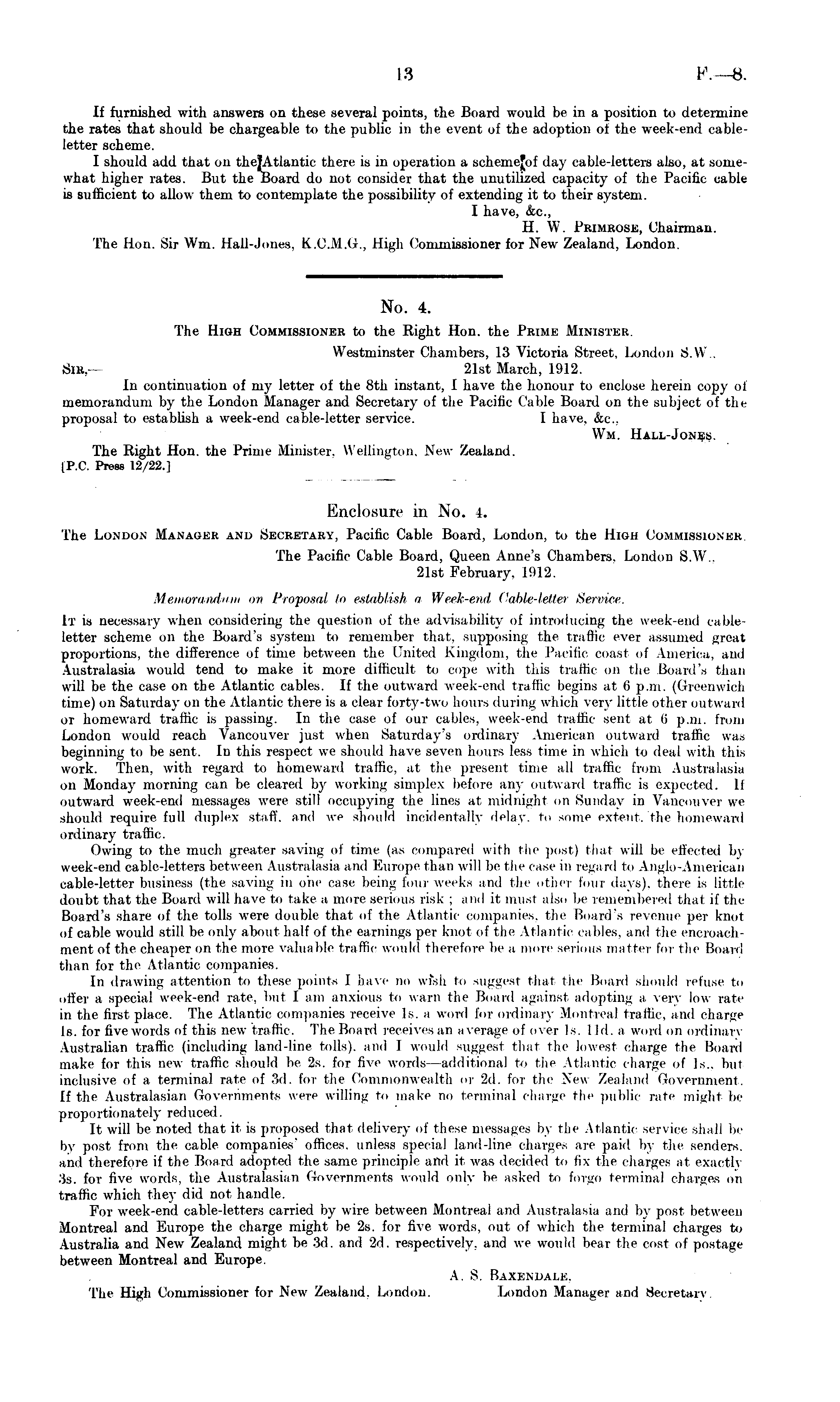 No. 4. The High Commissioner to the Right Hon. the Prime Minister. Westminster Chambers, 13 Victoria Street, London S.W Sir. 21st March, 1912. In continuation of my letter of the Bth instant, I have the honour to enclose herein copy of memorandum by the London Manager and Secretary of the Pacific Cable Board on the subject of the proposal to establish a week-end cable-letter service. I have, &c, Wm. Hall-J ones. The Right Hon. the Prime Minister, Wellington, New Zealand. iP.C. Press 12/22.]